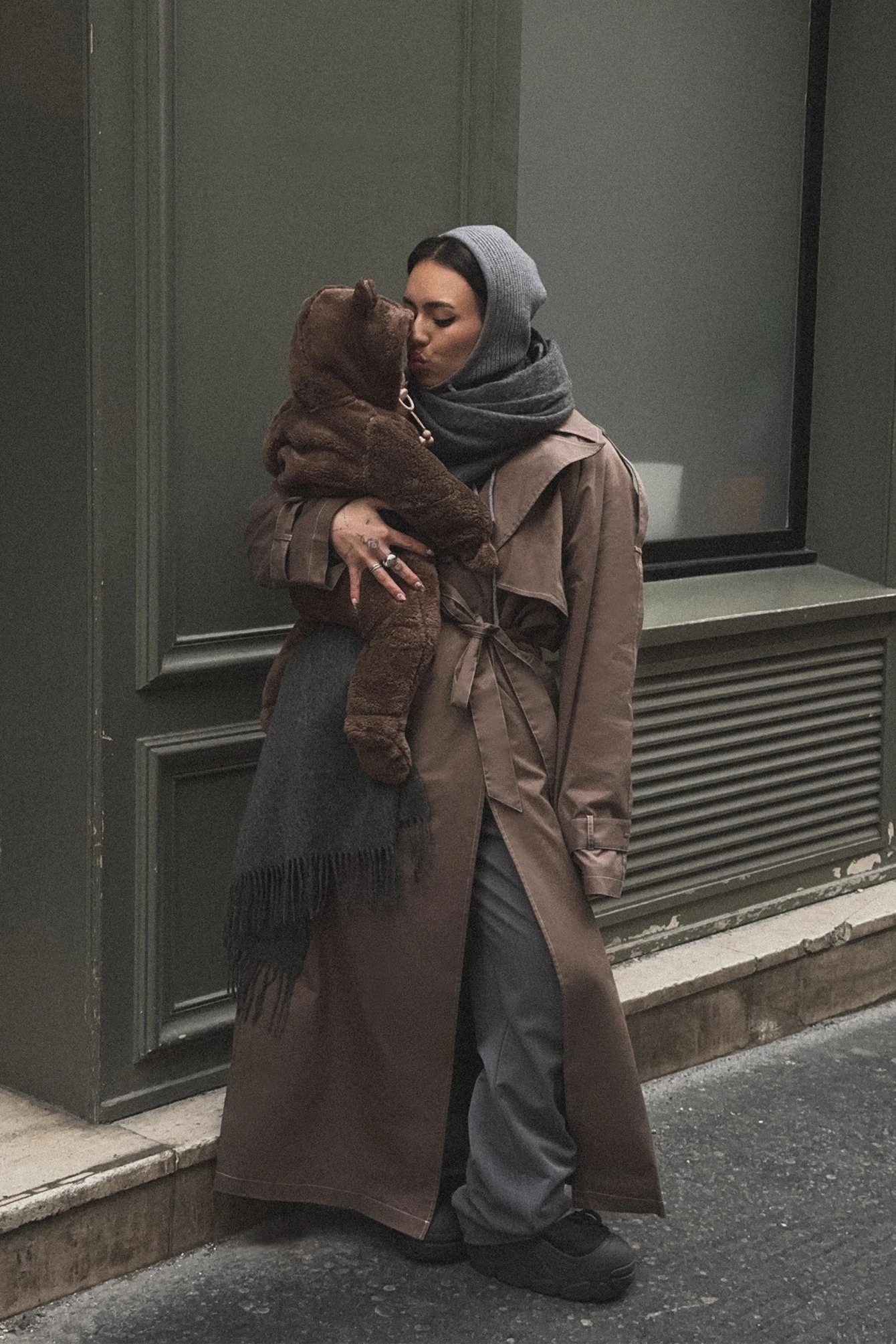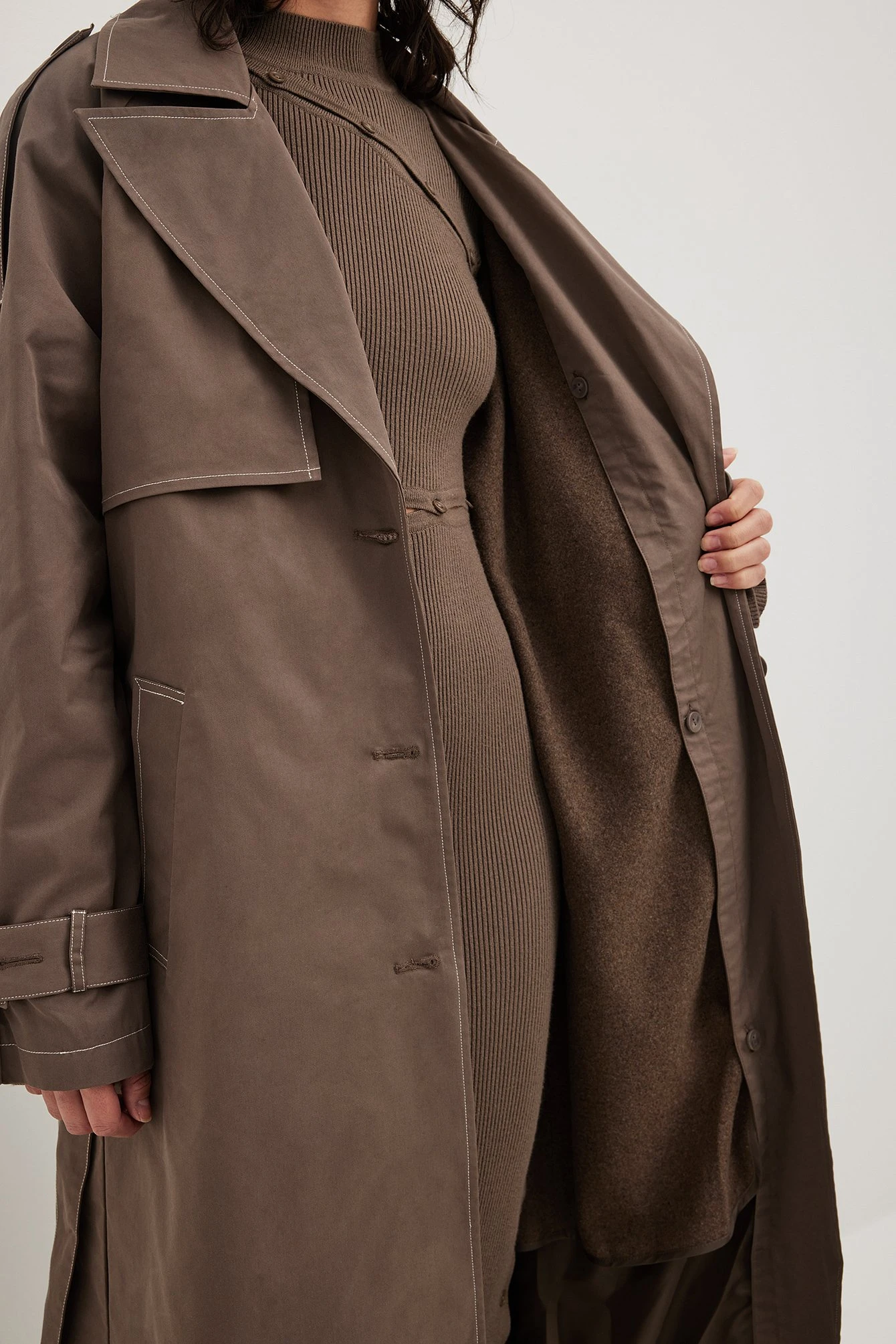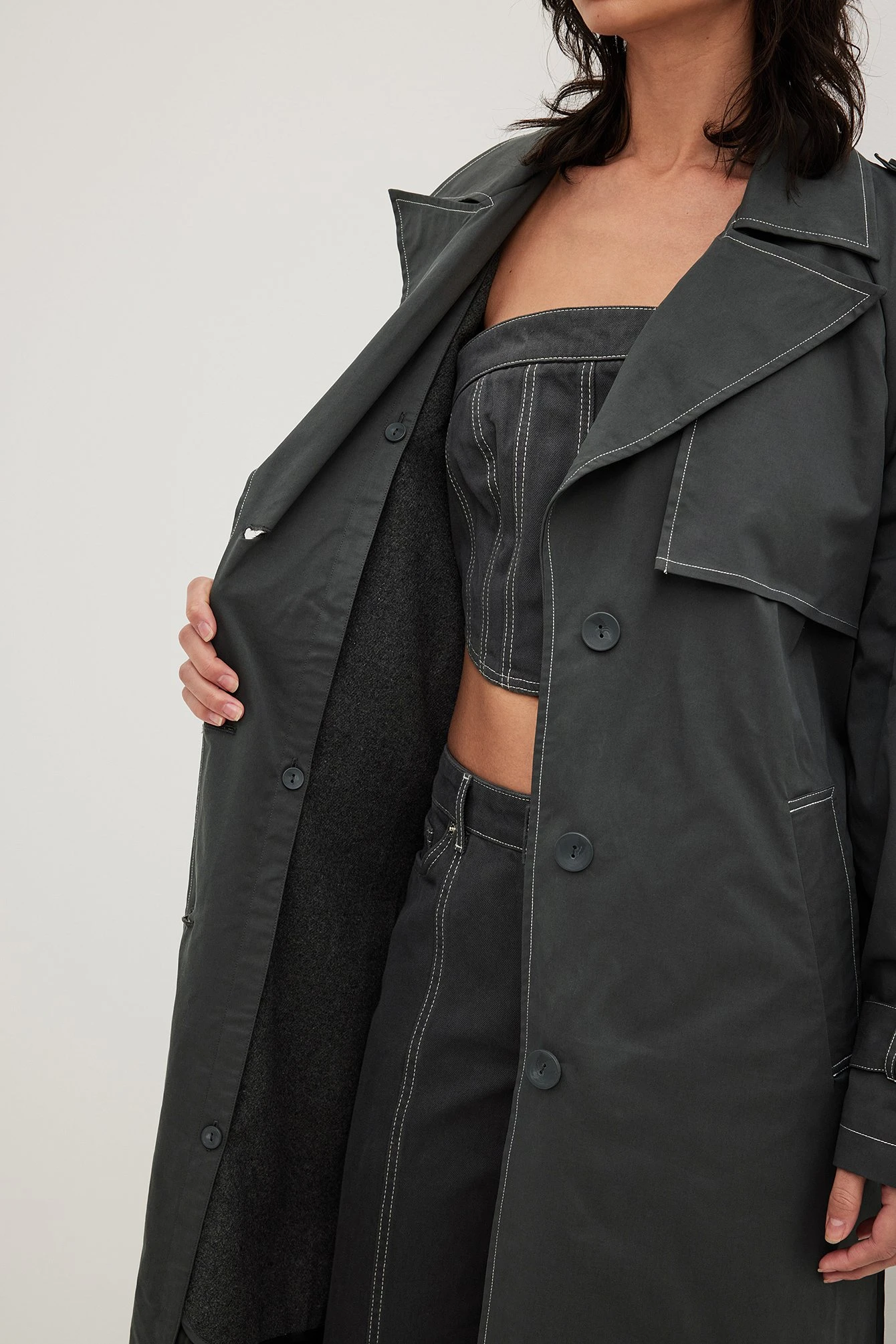 This trenchcoat is long and features an oversized fit. It has contrast color seams and a removable lining. This trenchcoat features button closure, a self tie waist belt, side pockets and a slit detail on the back.