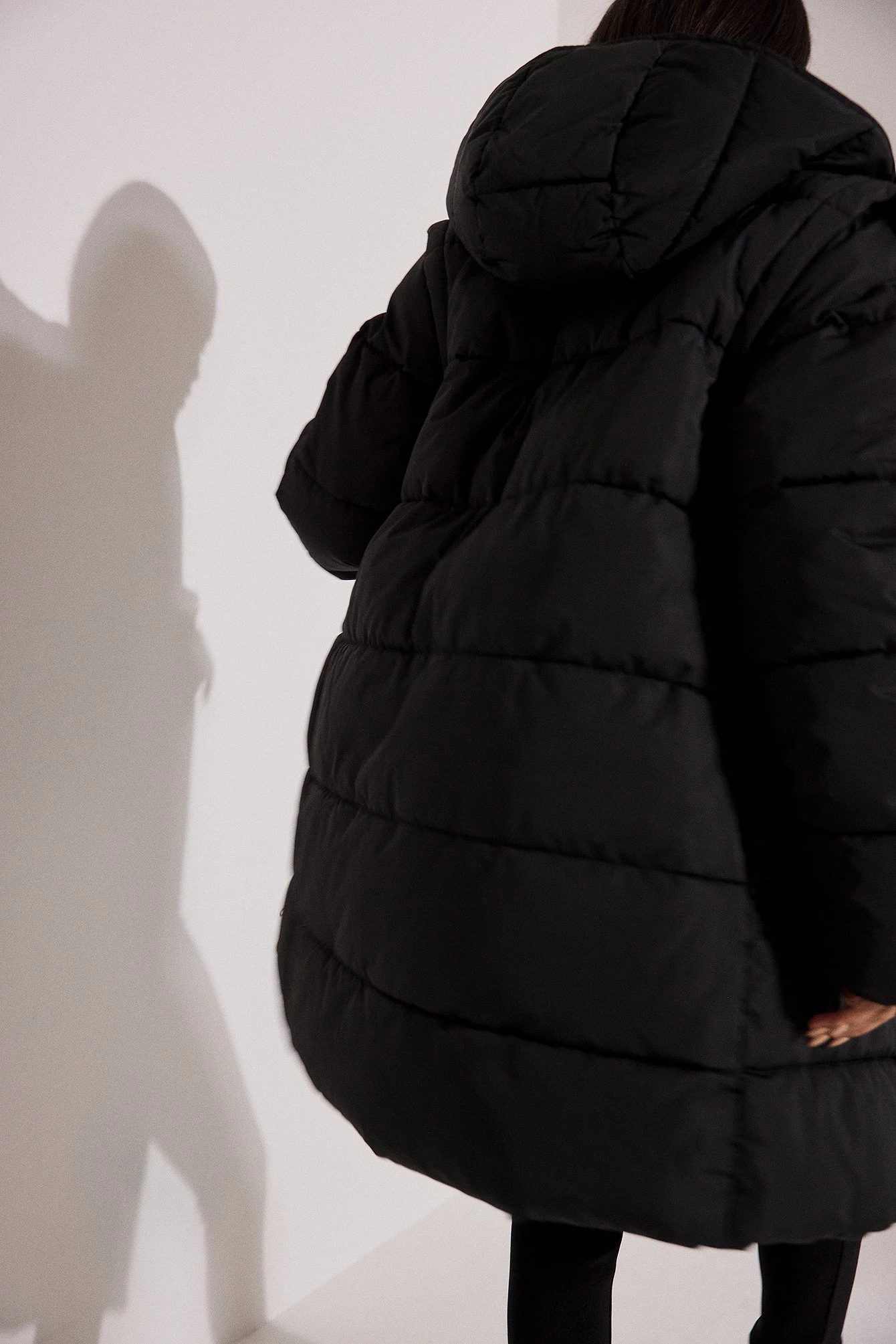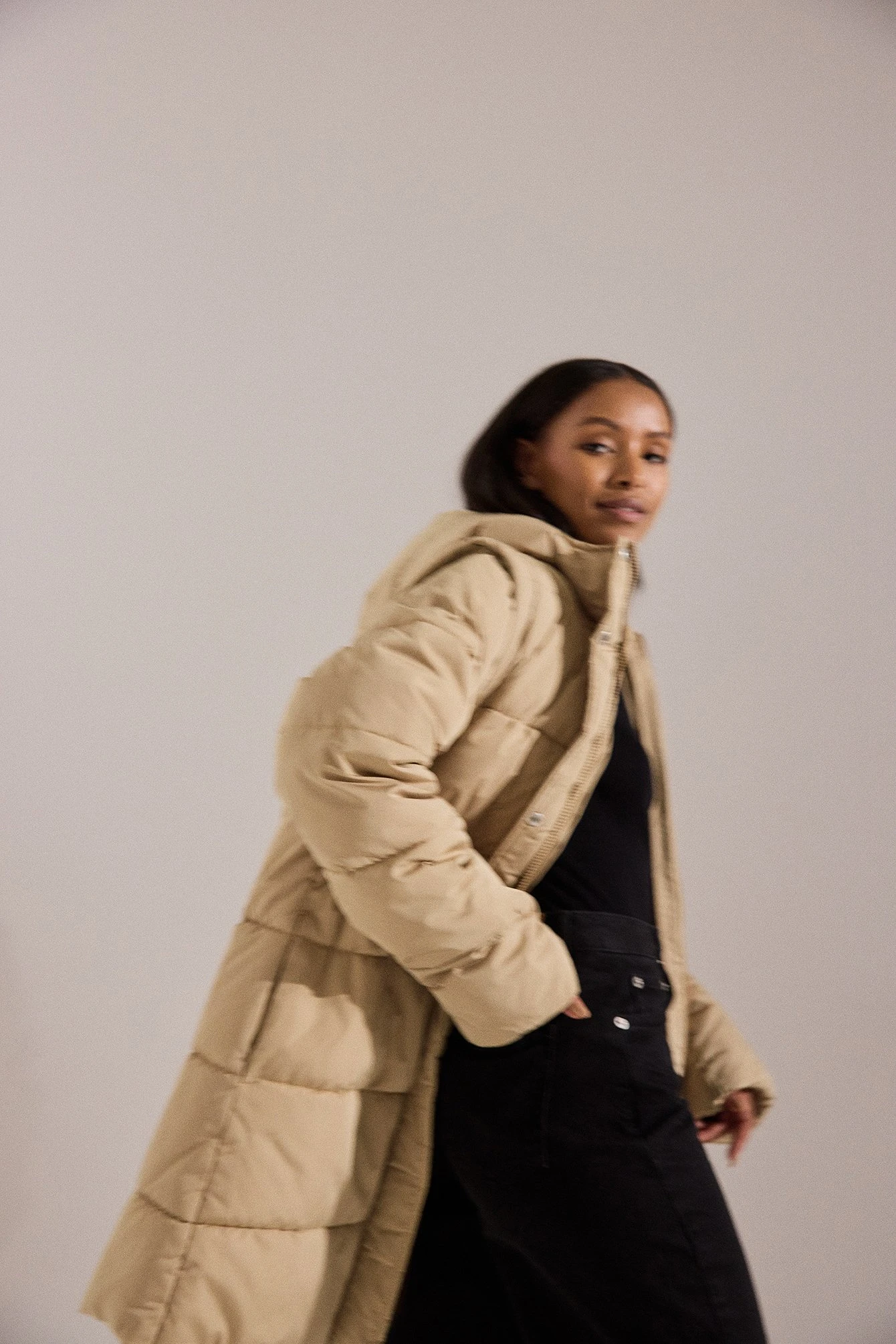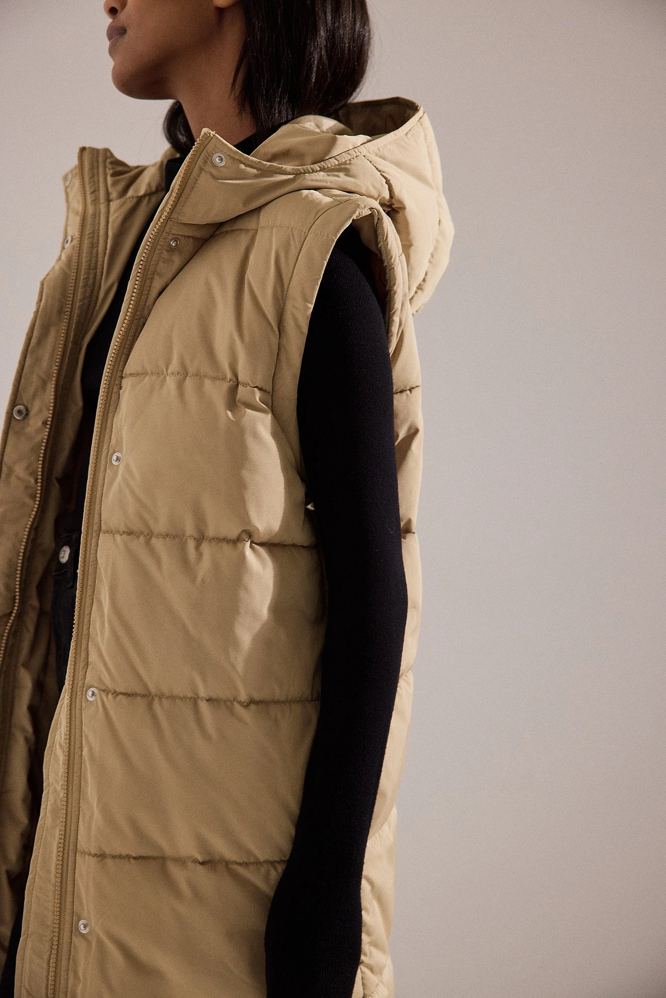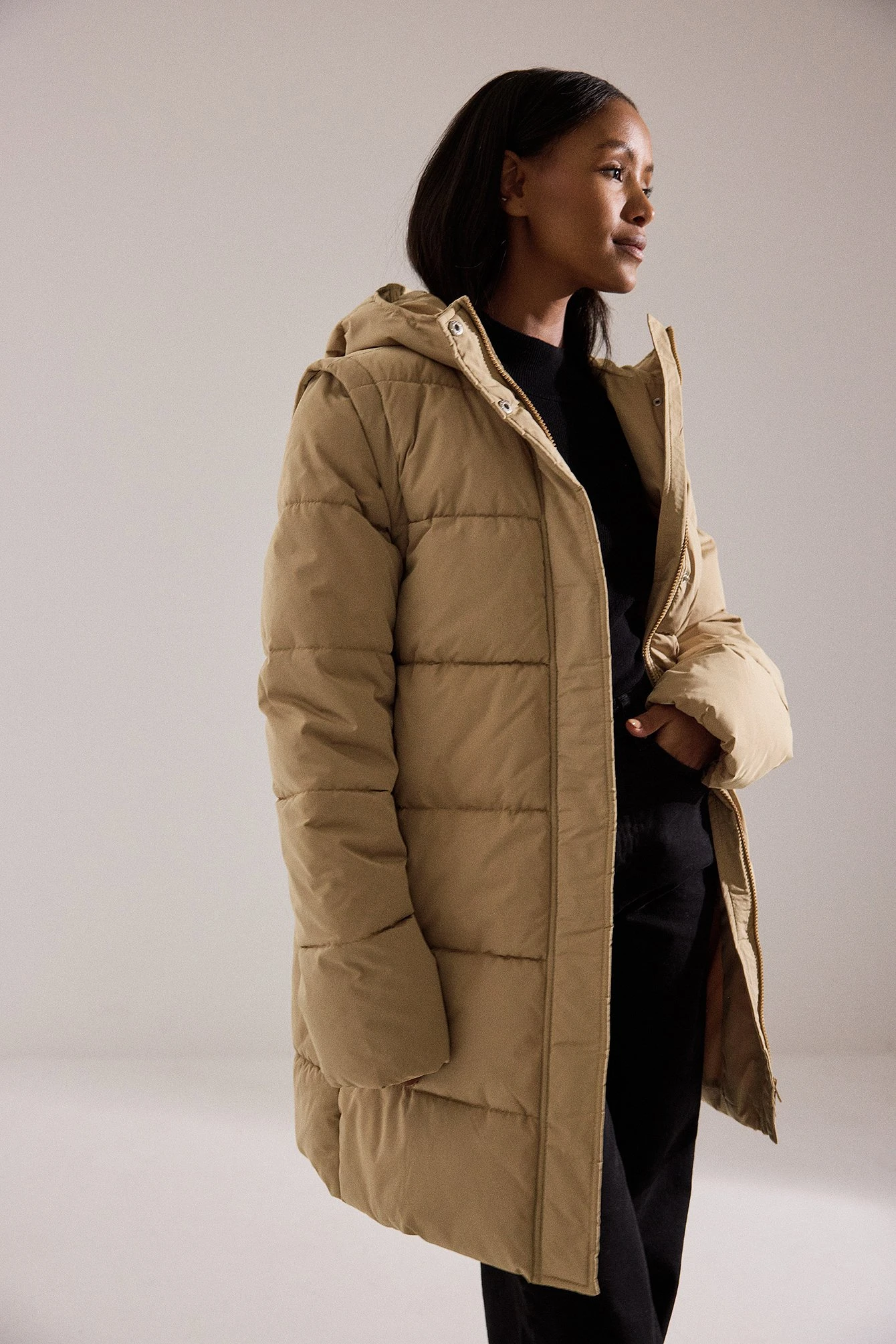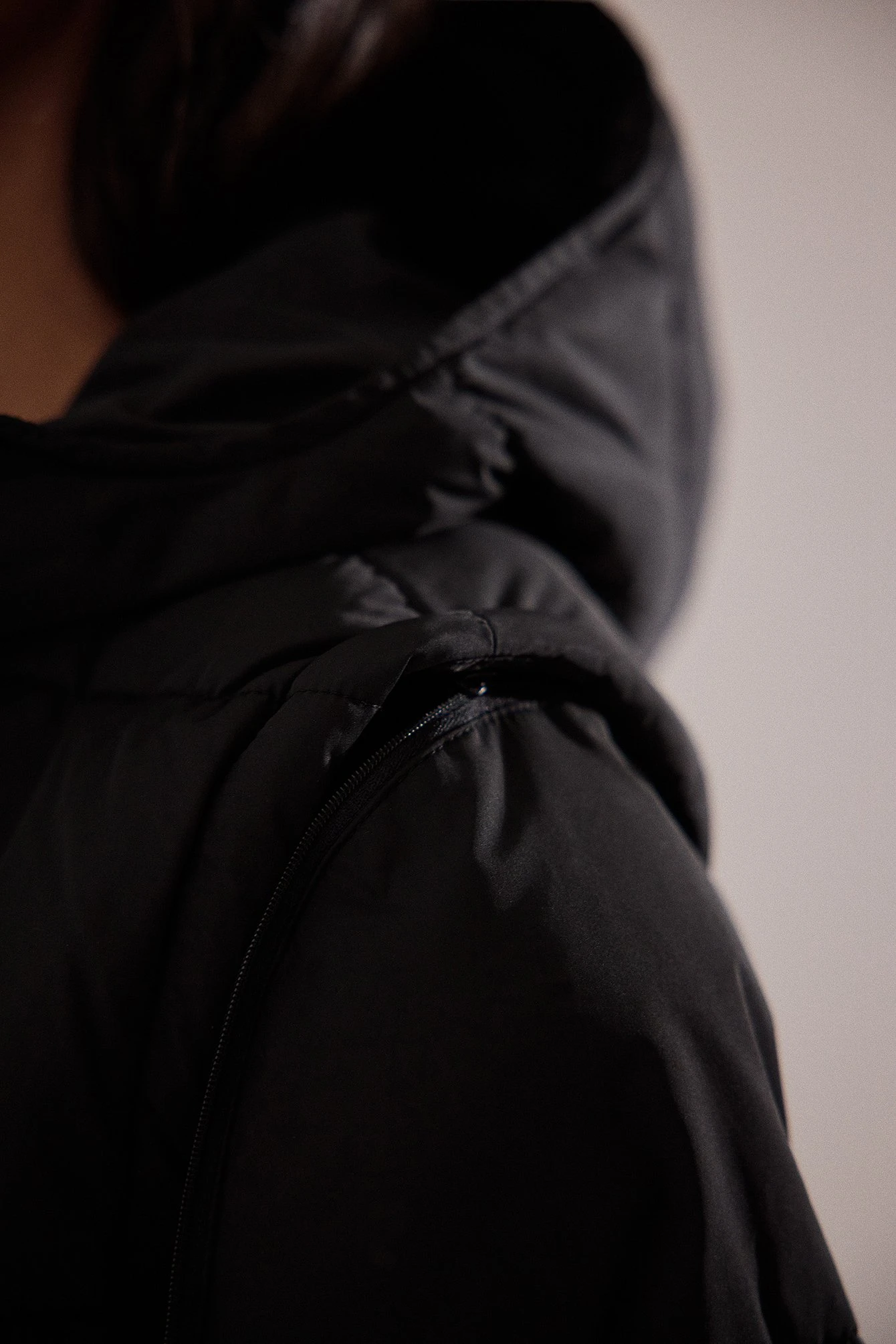 This padded jacket features a long fit. It has a hood and removable sleeves. This padded jacket features two side pockets.