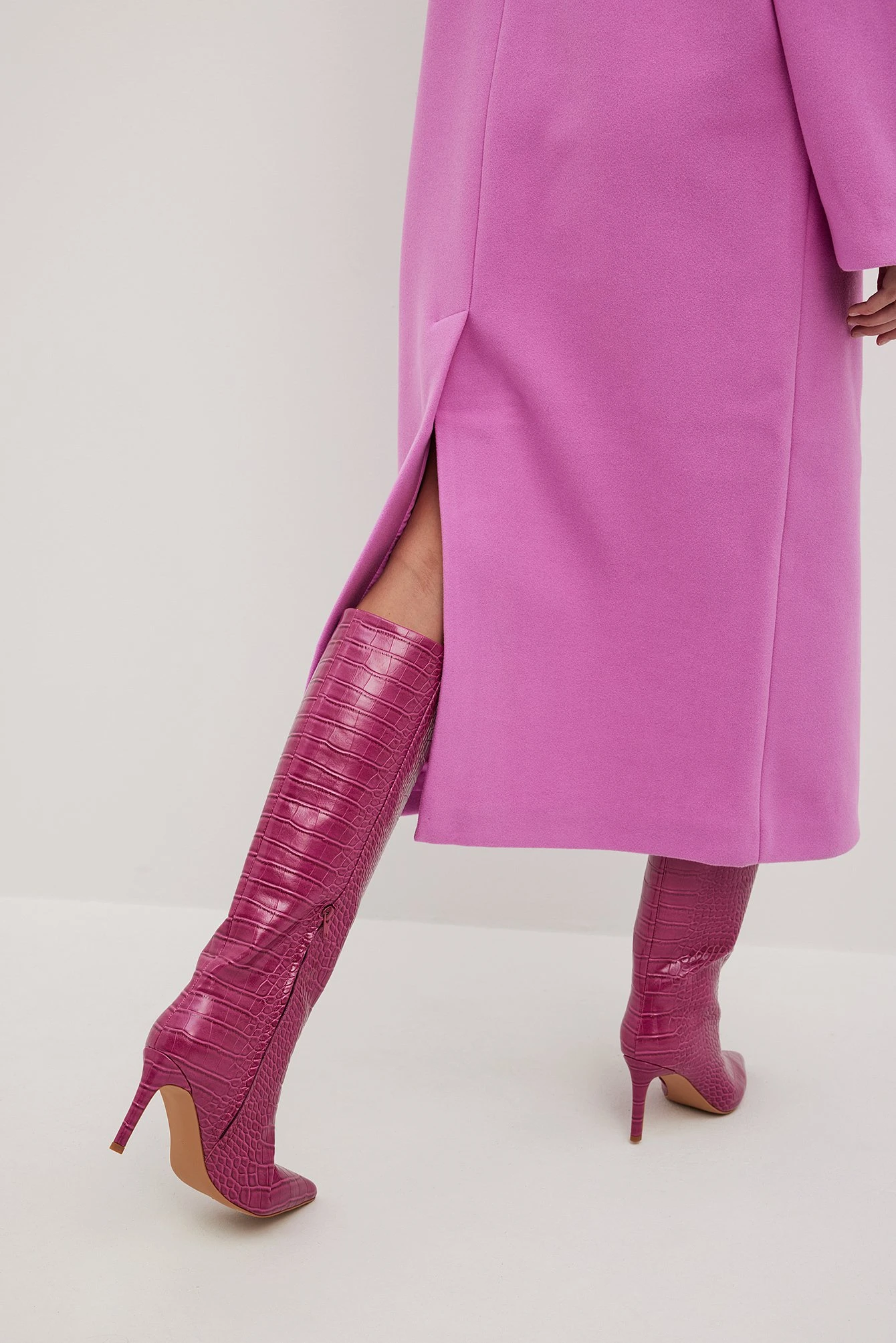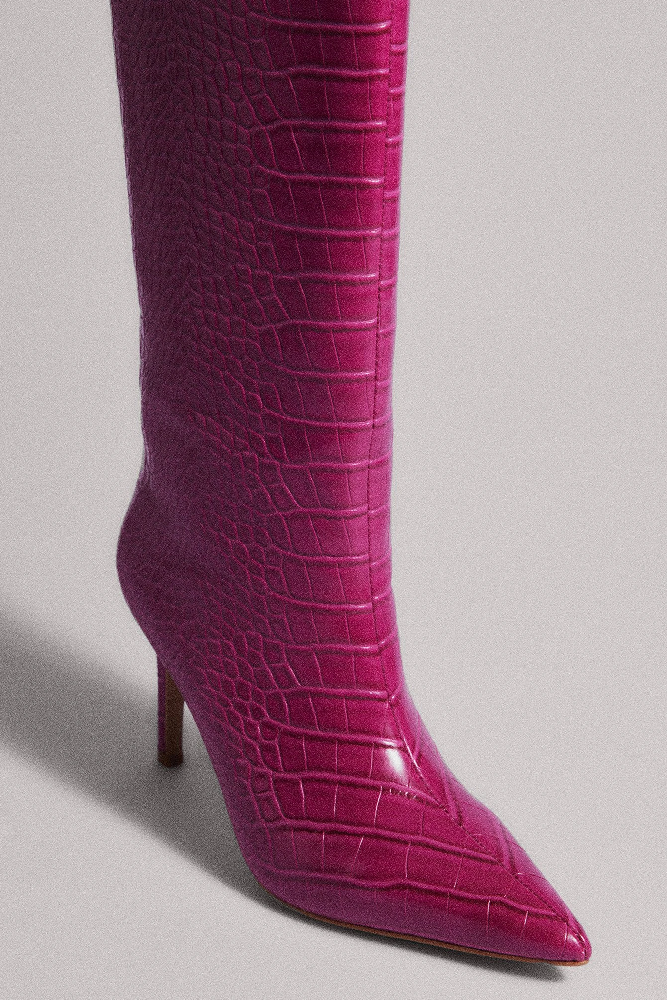 These boots feature a faux-leather design with a reptile pattern. They have a knee-high fit and a half-up zipper. These boots feature a stiletto heel and a pointed toe. Measurements in size 39: Heel height: 8 cm / 3.1 in. Shaft height: 41 cm / 16.1 in. Shaft circumference around the calf: 40 cm / 15.8 in..