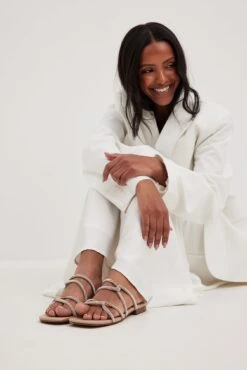 This flat features a strappy sandal. They have a slip-on design and a thin sole. This flat features a square toe, a rhinestone embellishment on the straps and a slim fit. Measurements in size 39: Heel height: 2 cm / 0.78 in. Insole length: 25,5 cm / 10.03 in.