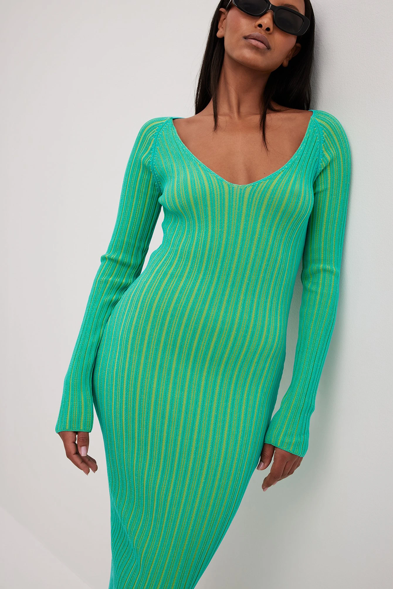 This midi dress is knitted and ribbed and features a bodycon fit. It is contrast-colored and has a v neckline.