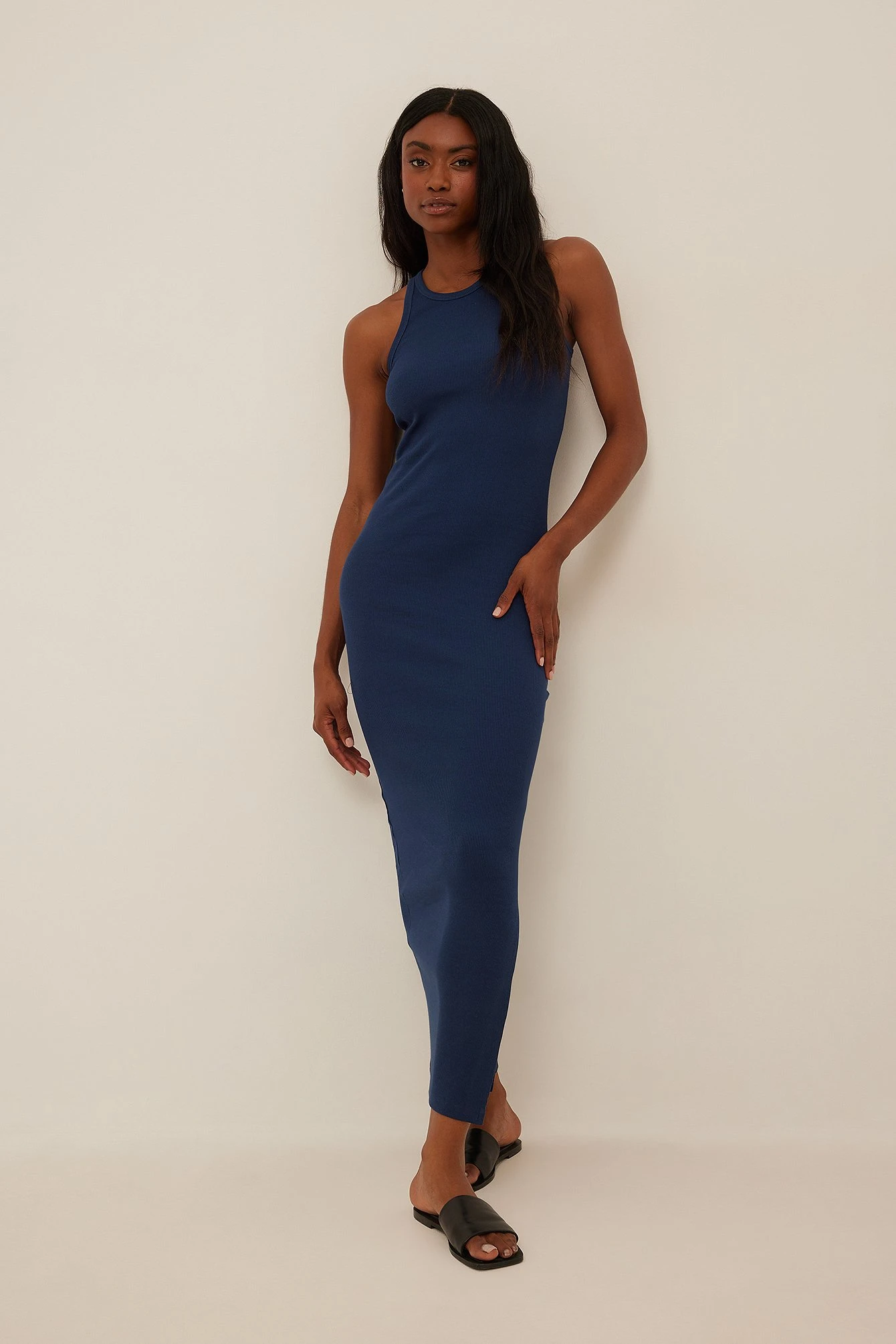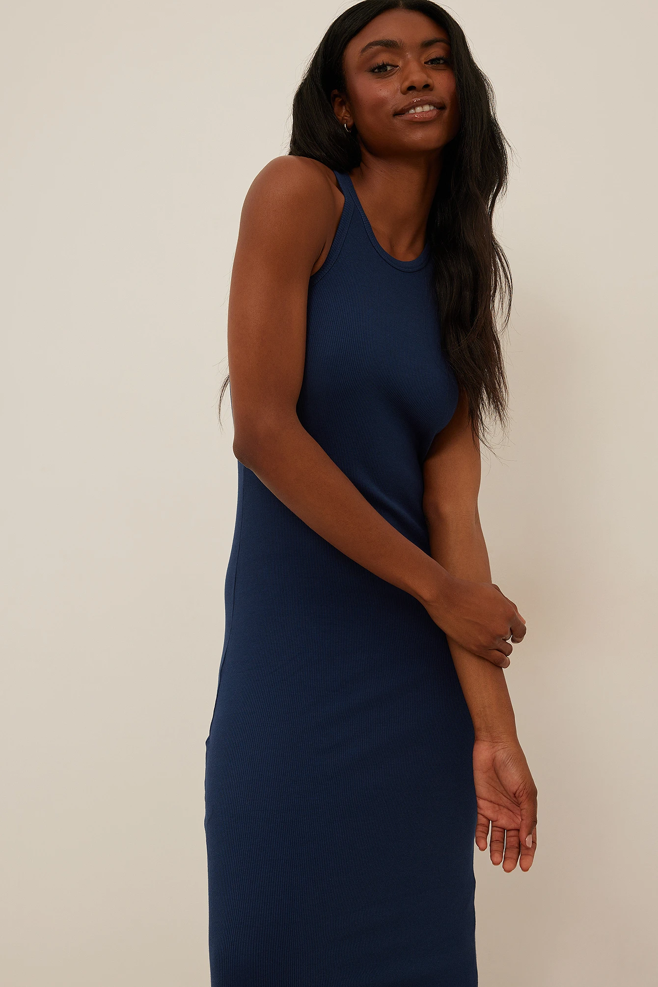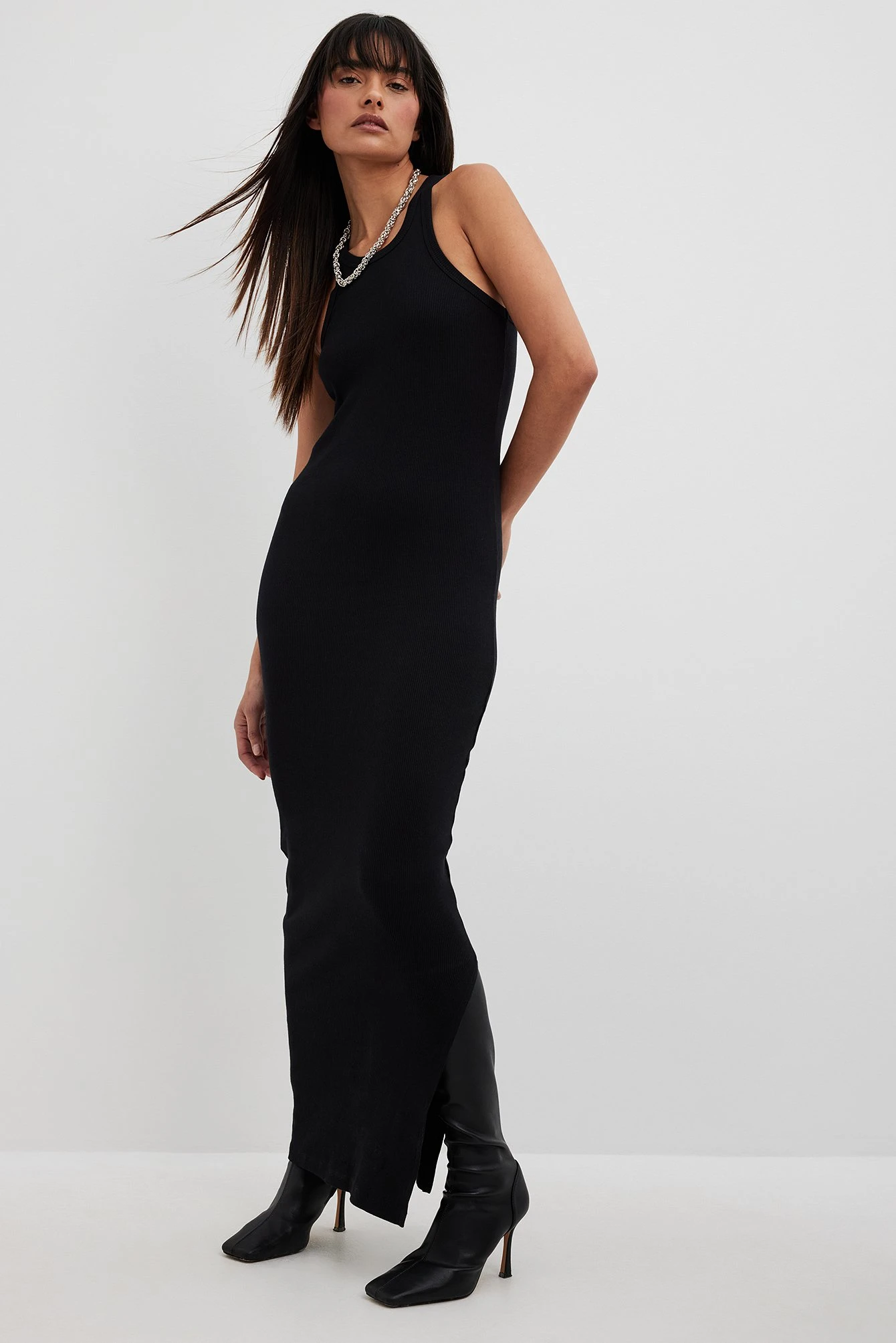 This maxi dress features a round neck. It has thick spaghetti straps and a slit detail. This maxi dress features a ribbed material.