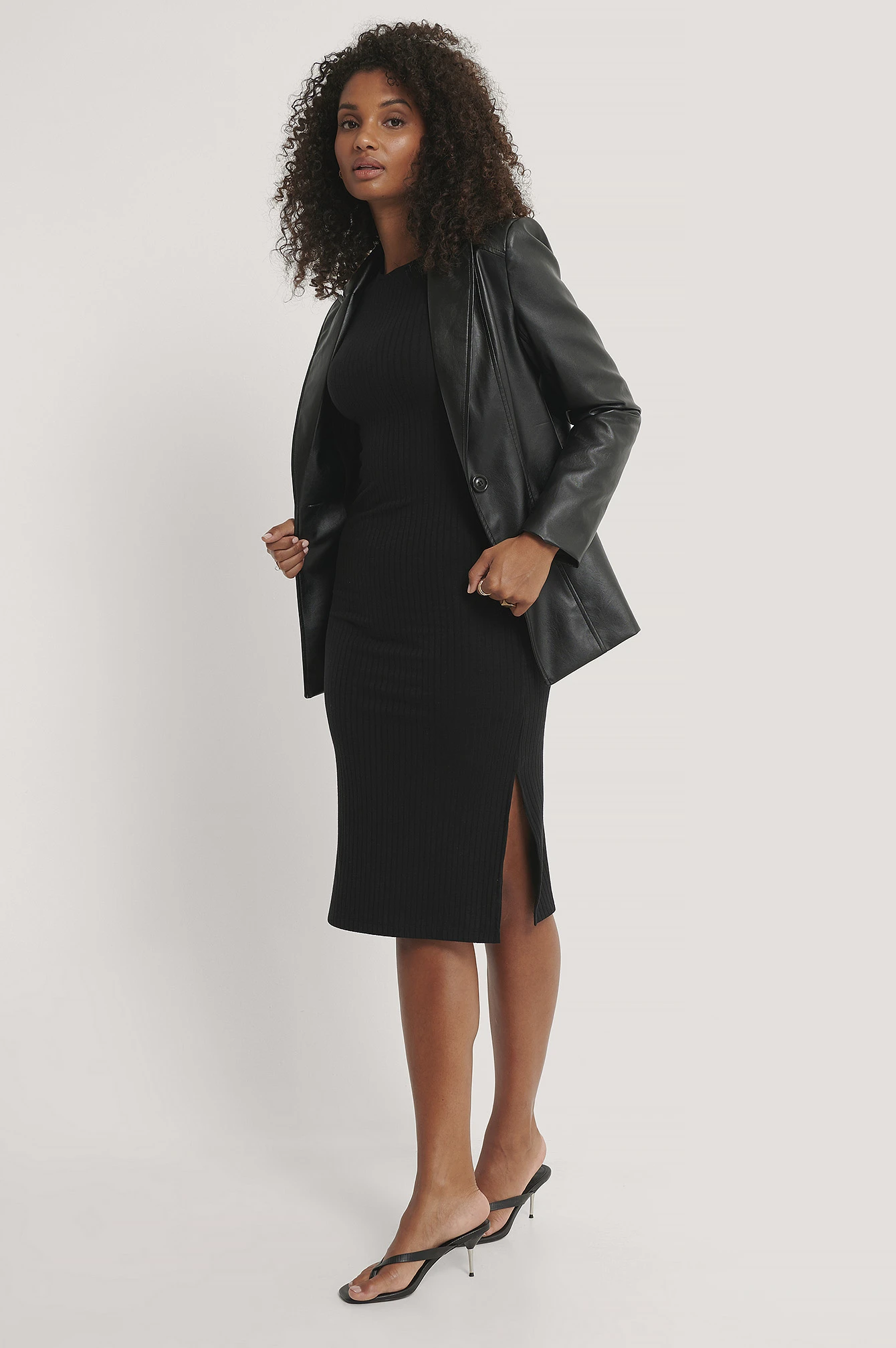 This dress features a round neckline, long sleeves, a ribbed design with a slit on each side and a midi length.