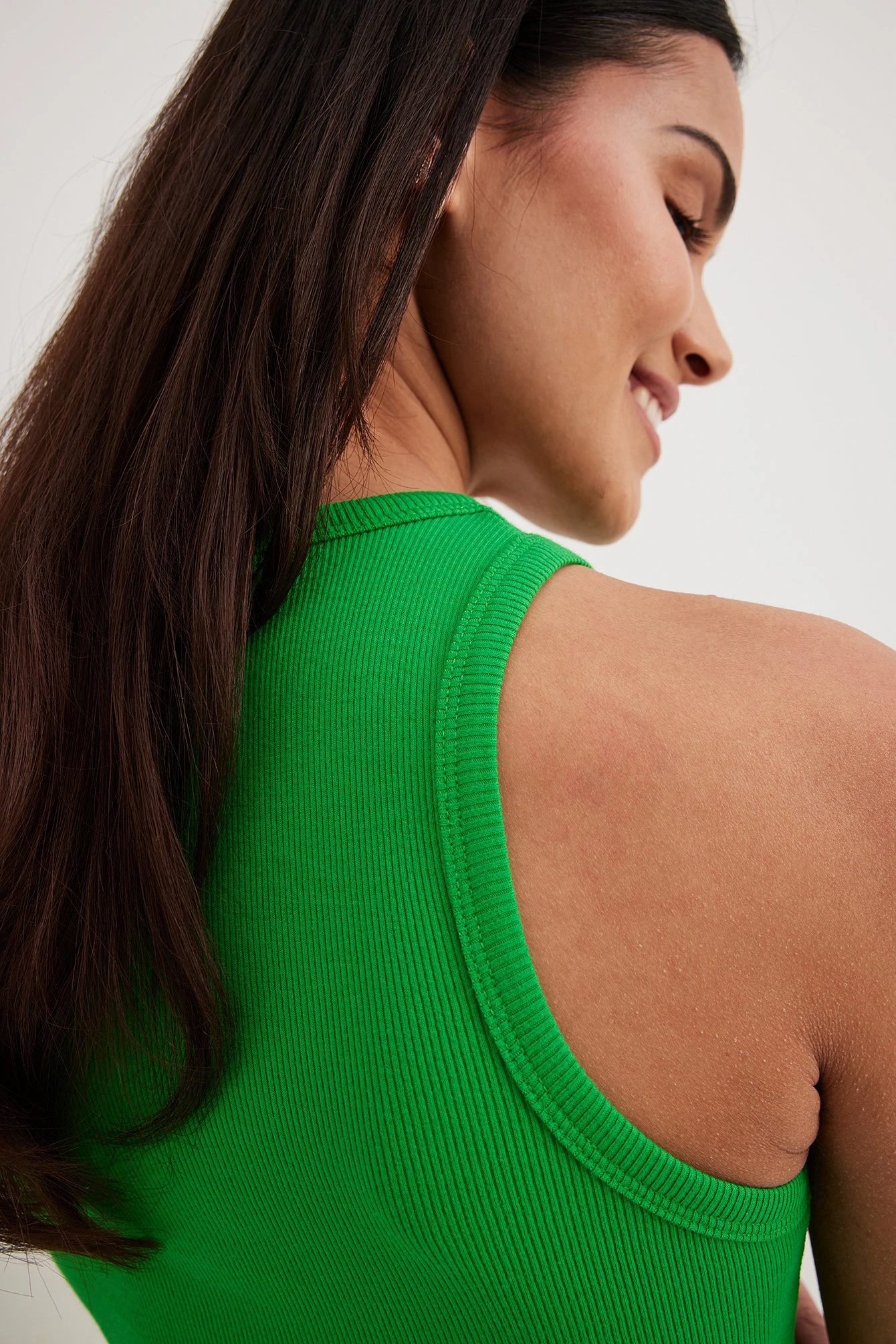 This dress features a round neckline. It has a sleeveless design and a ribbed, stretchy material. This dress features a mini length.
