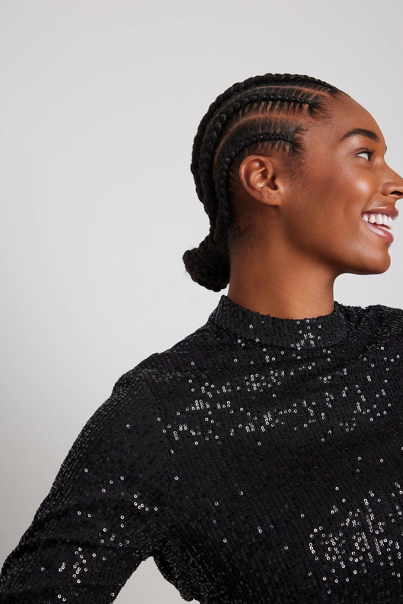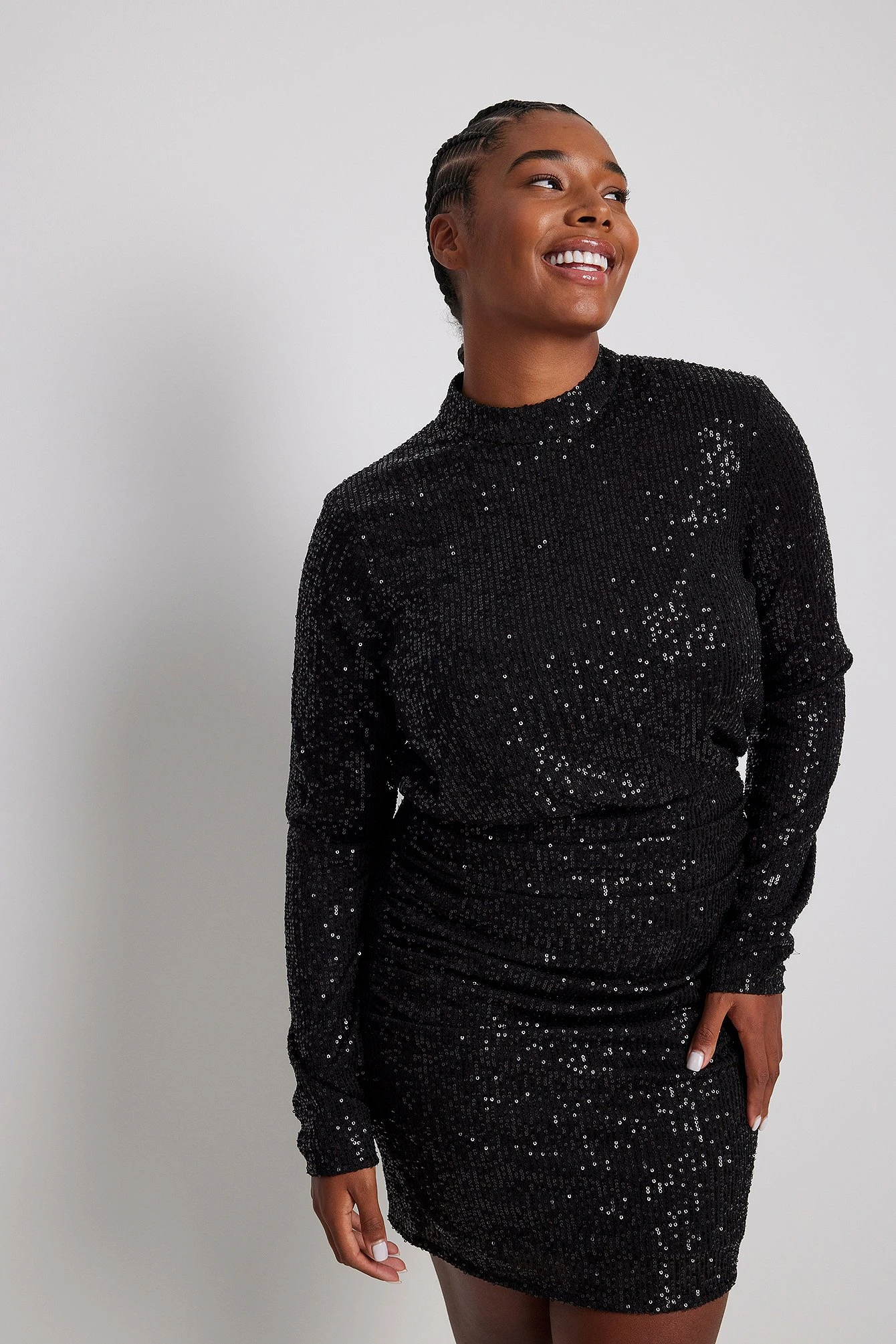 This mini dress features a high neckline, long sleeves, a concealed back zipper, rouched details on the sides and a sequin material.