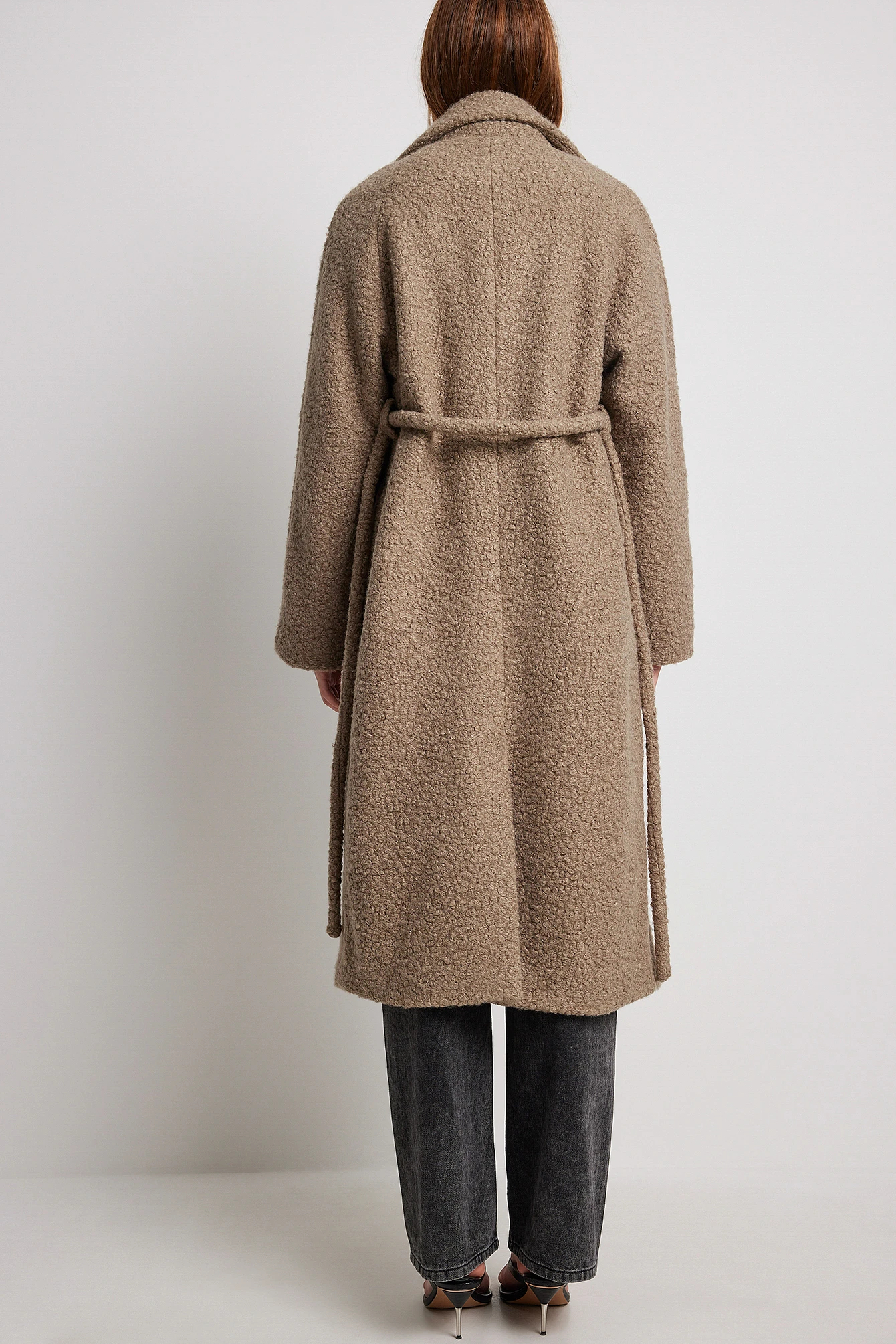 This coat features a wide lapel neckline, long sleeves, a double-breasted button closure, side pockets, a belt tie and a soft, lined material.