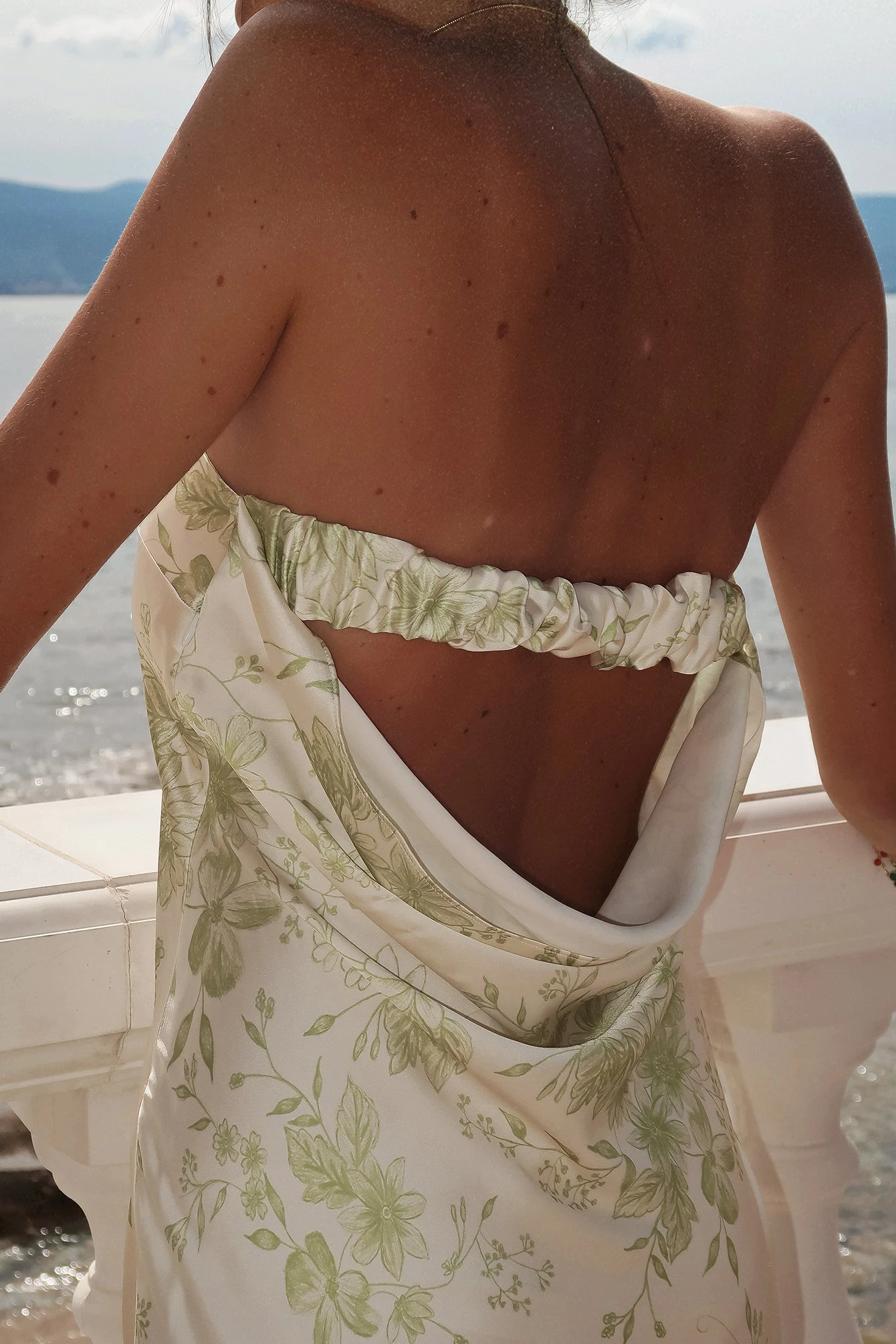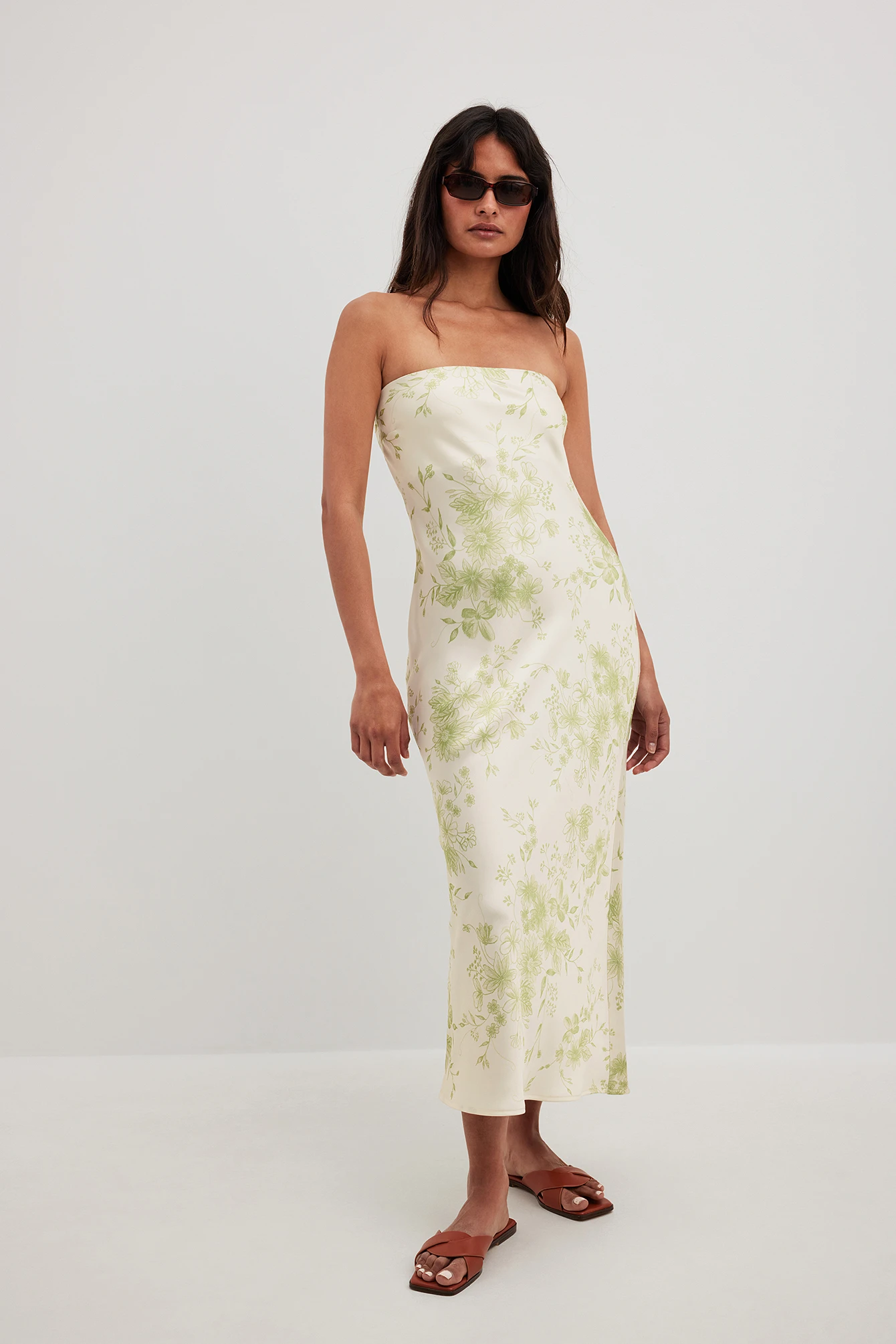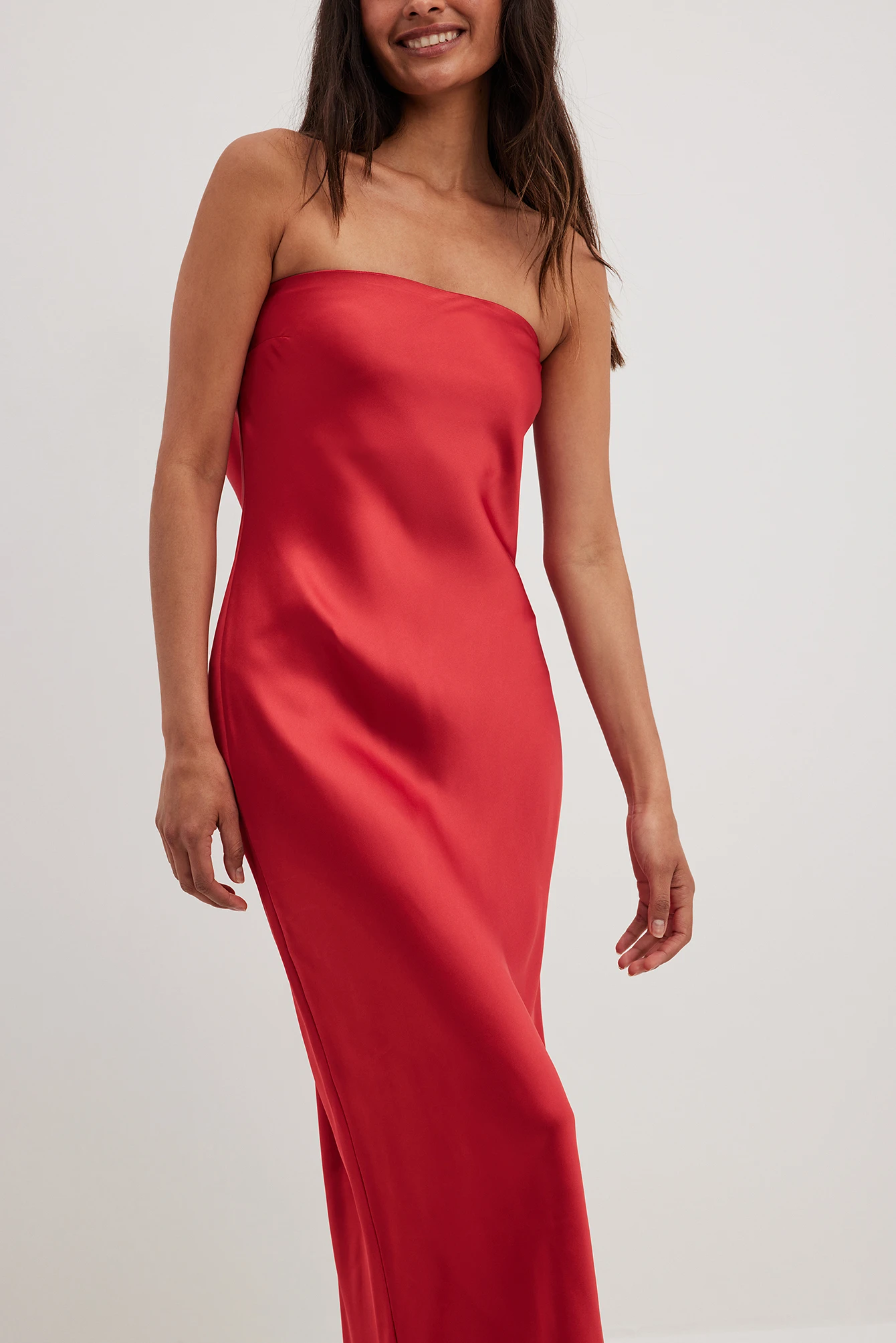 This midi dress is satin and features a bandeau design. It has an inner silicone trim and a hidden side zipper closure on the side. This midi dress features an elasticated band on the back, a cut out detail and a waterfall hem on the back.