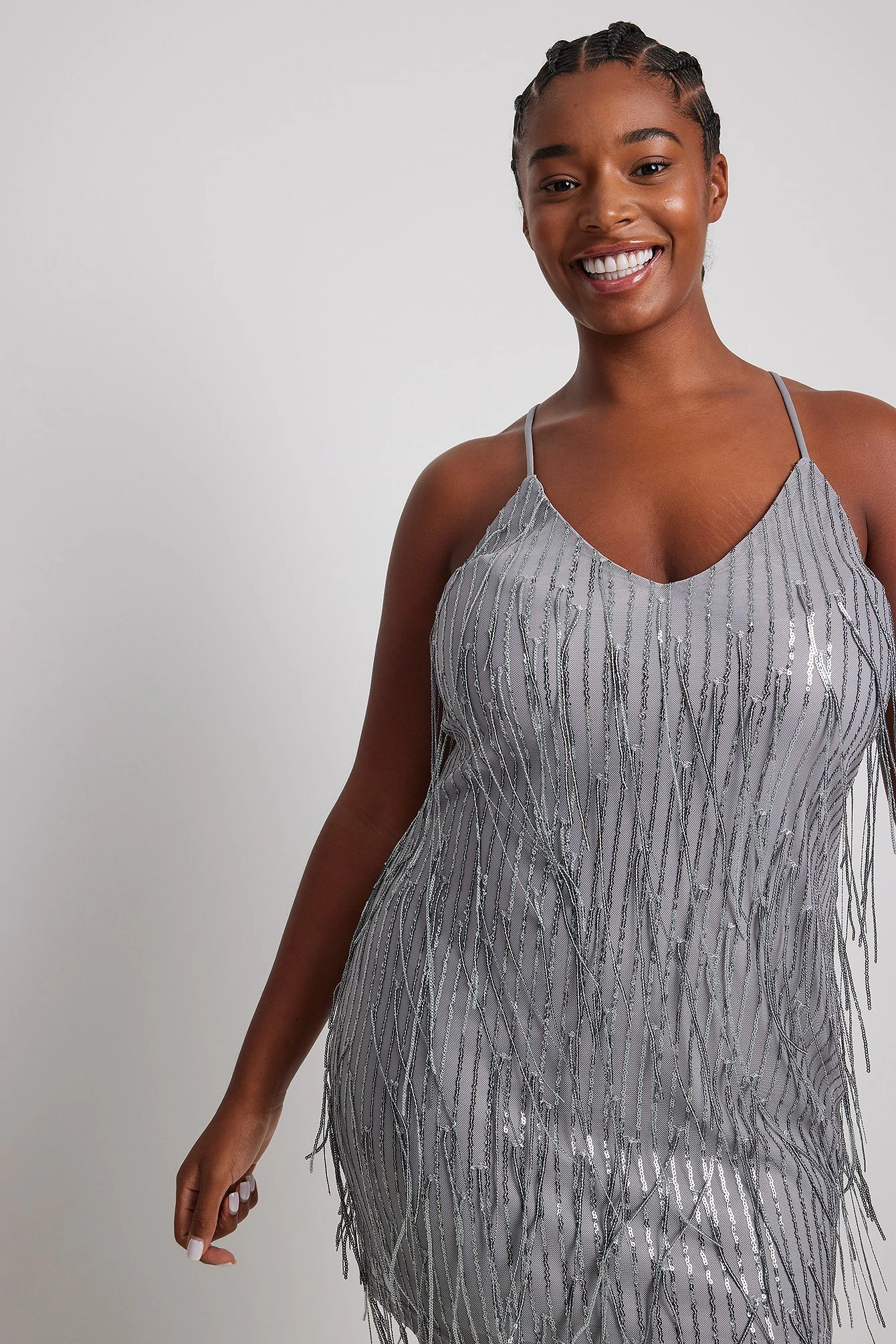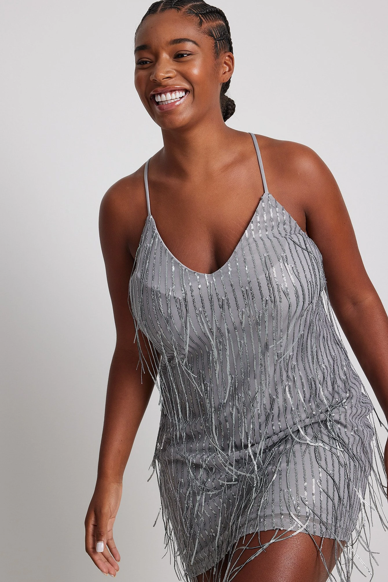 This mini dress features fringe details in sequin, thin, crossed adjustable shoulder straps and a fabric lining.