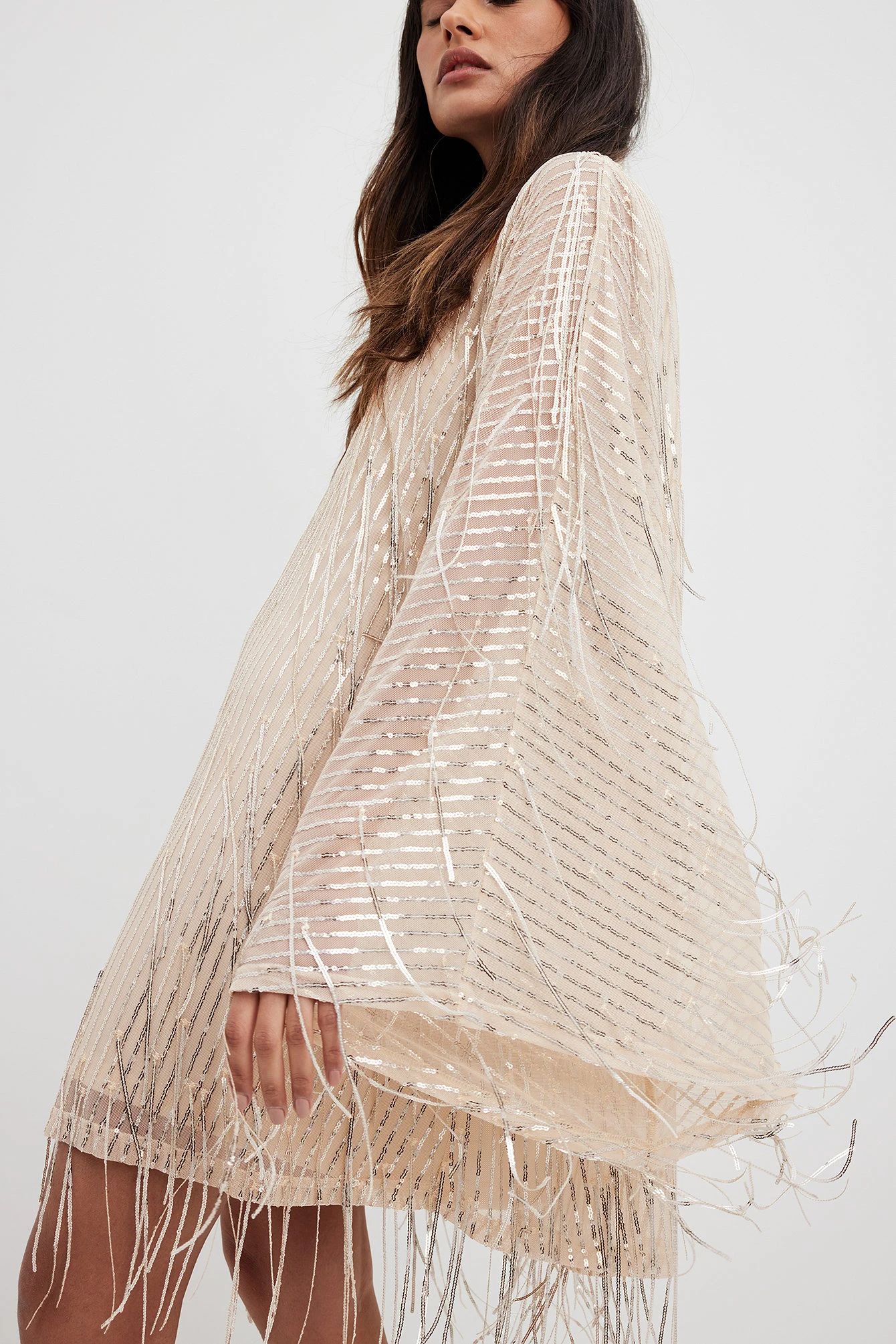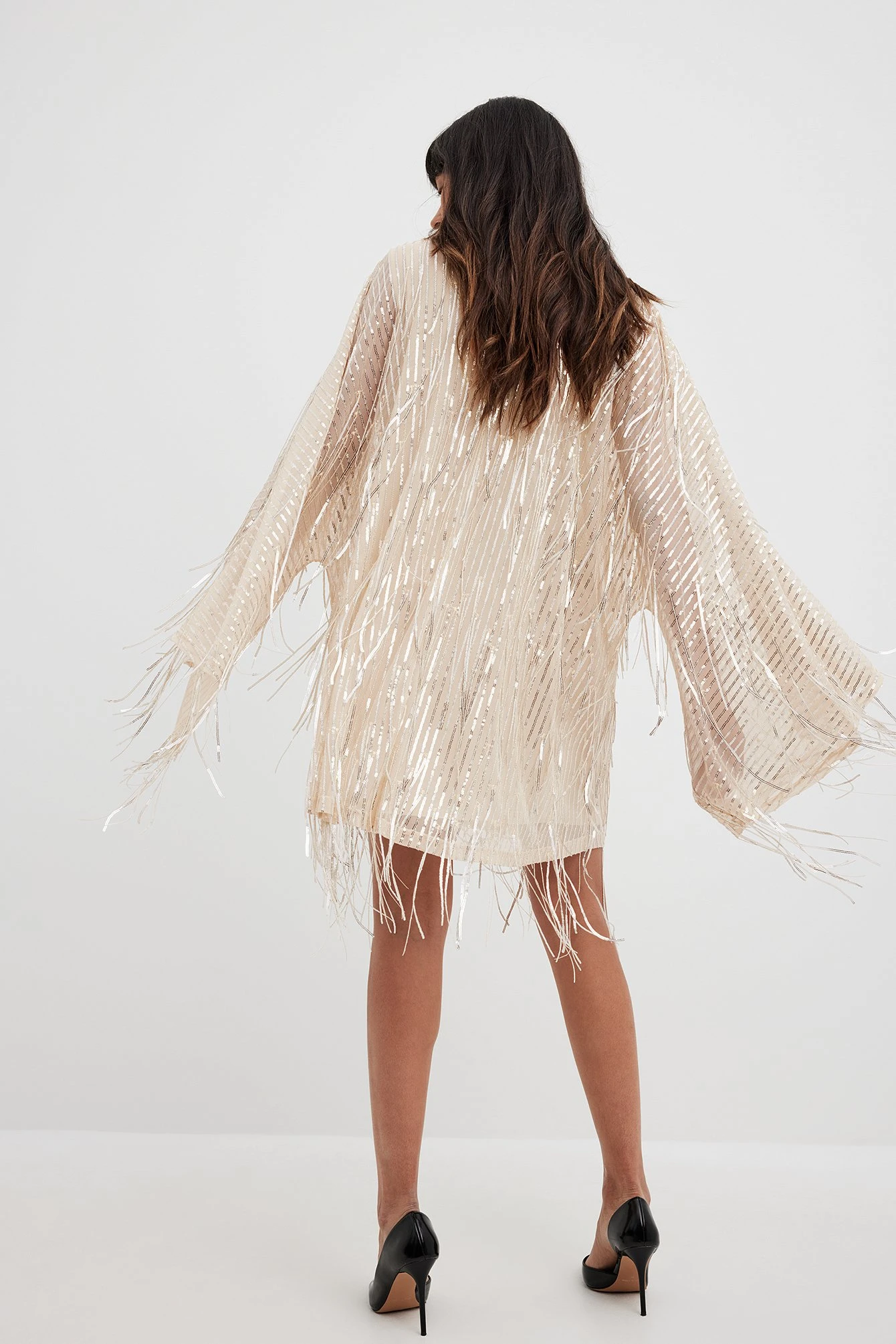 This mini dress features a flowy fit. It has a high neckline with a zipper closure and wide long sleeves. This mini dress features fringes in sequin.
