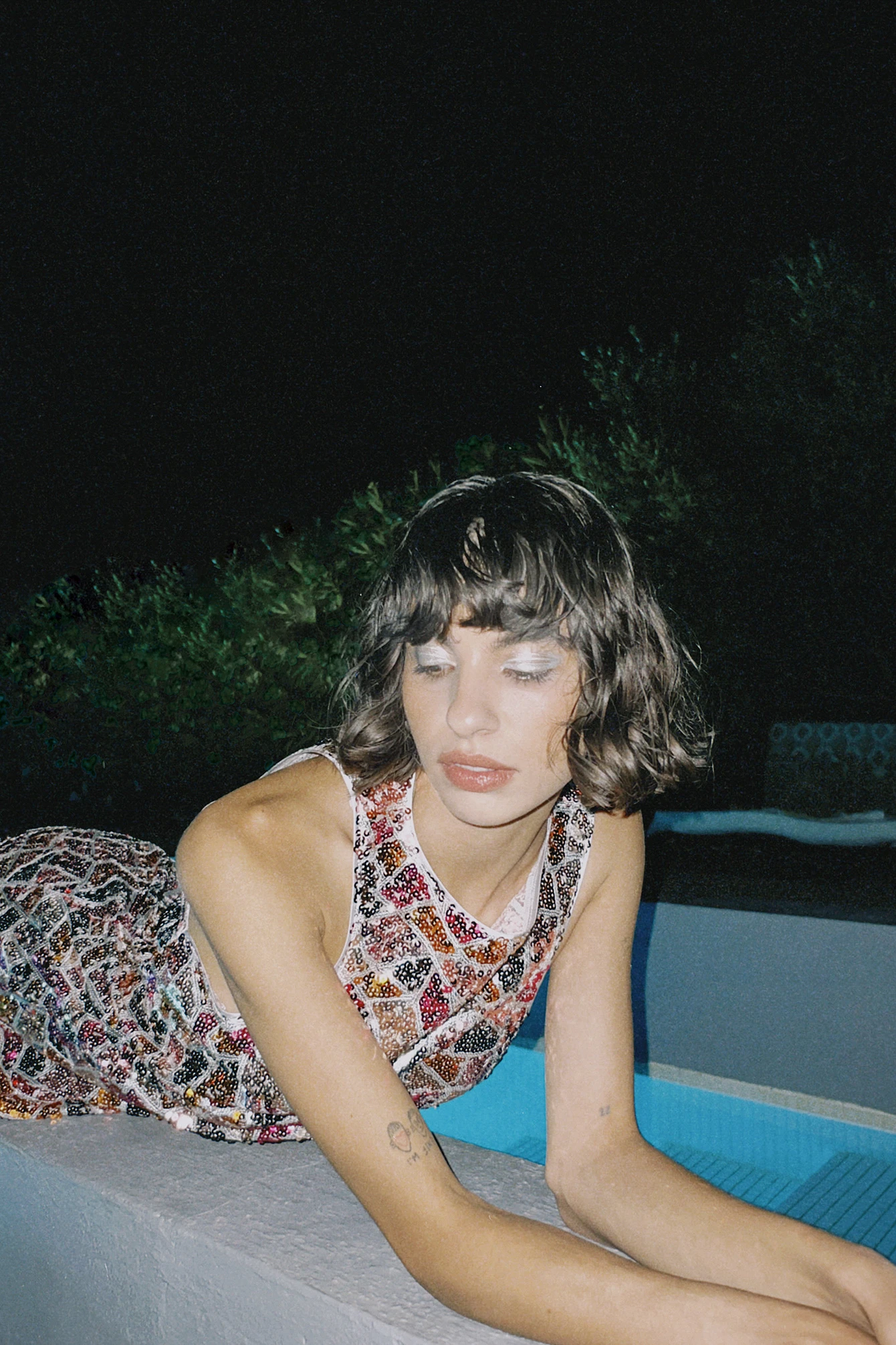 This maxi dress is sleeveless and made of sequin and features a side slit and a slip-on design.