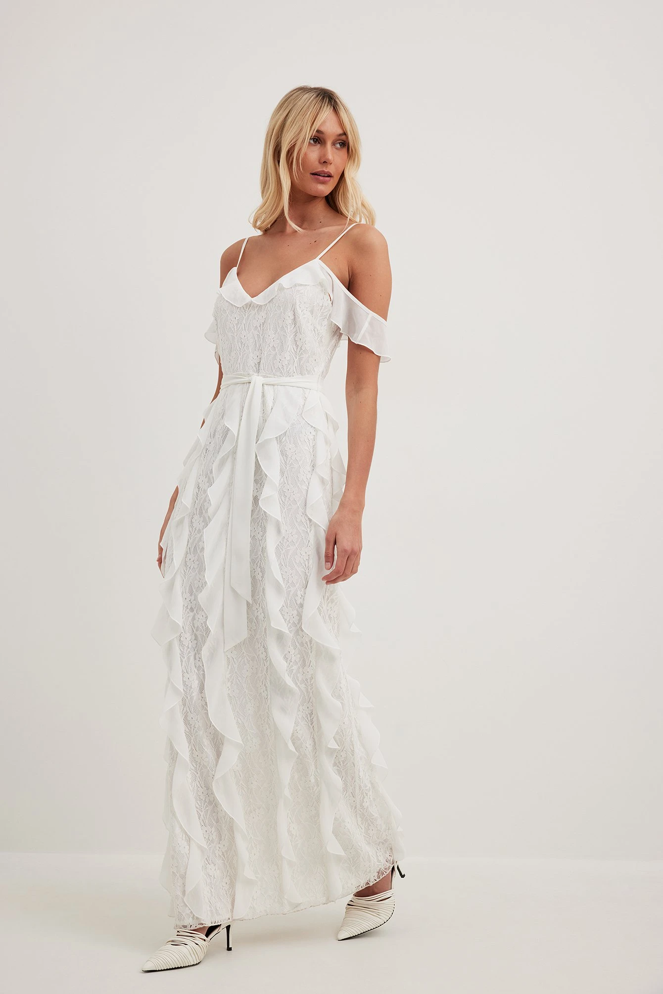 This maxi dress is made of lace and features adjustable shoulder straps. It has an off shoulder look with a rouched detail and rouched details along the item. This maxi dress features a belted detail and a side zipper closure.
