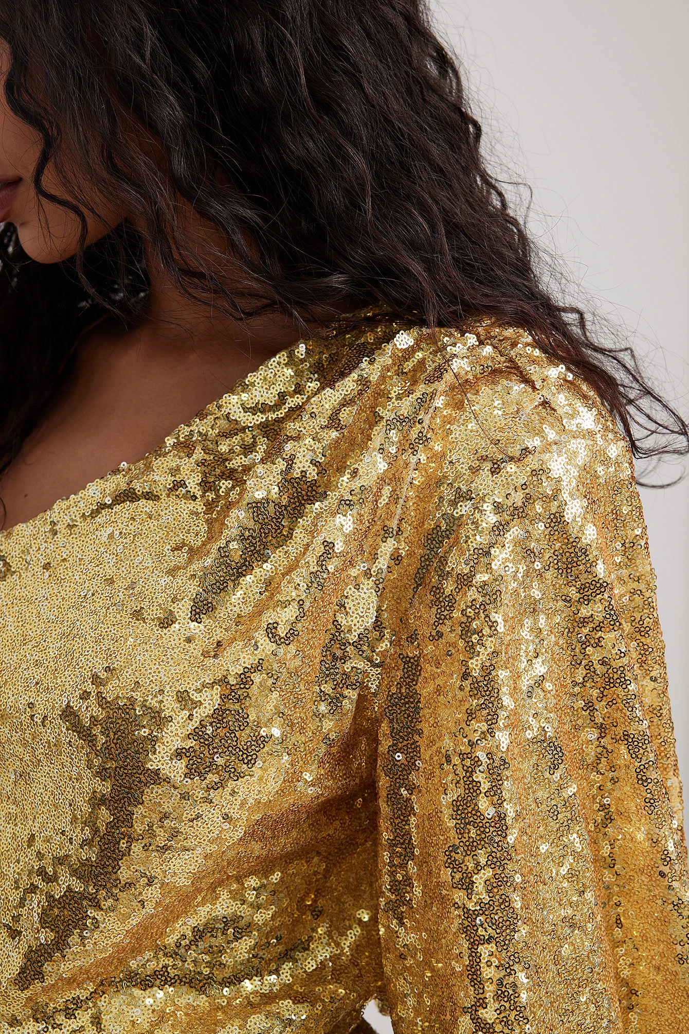 This mini dress is made of sequin and features a one sleeve design with a wide cut and a padded shoulder and a waterfall neckline at the back with a strap detail.
