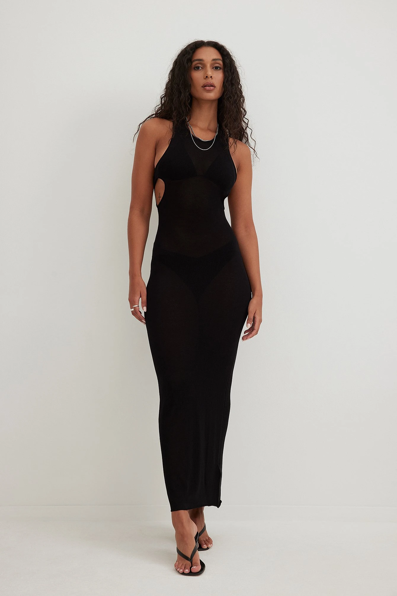 This maxi dress features cut out details on the sides, a round neckline and a sheer, fine-knit material.