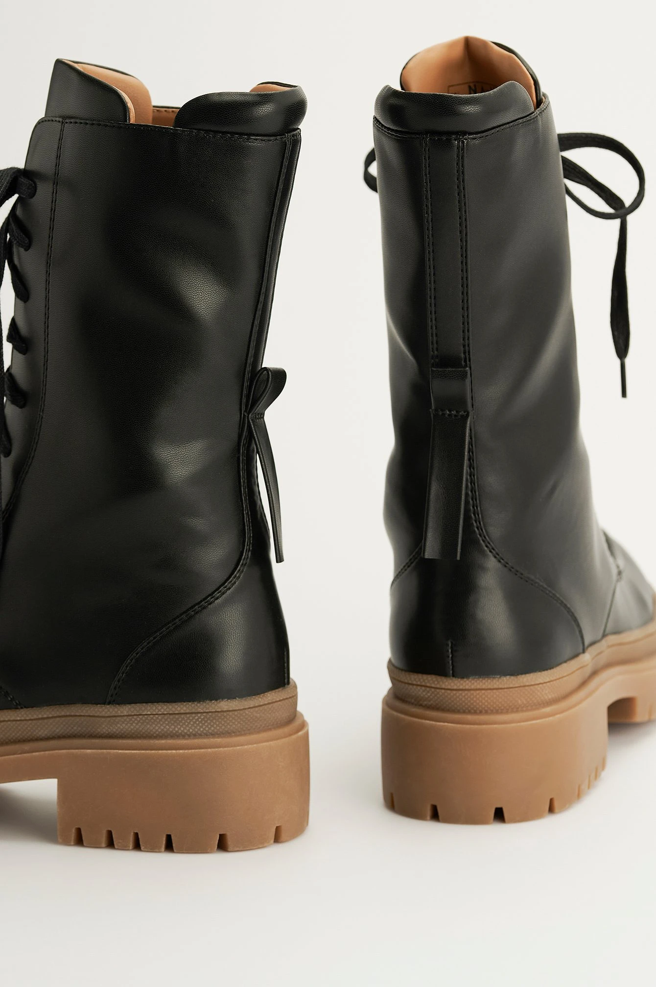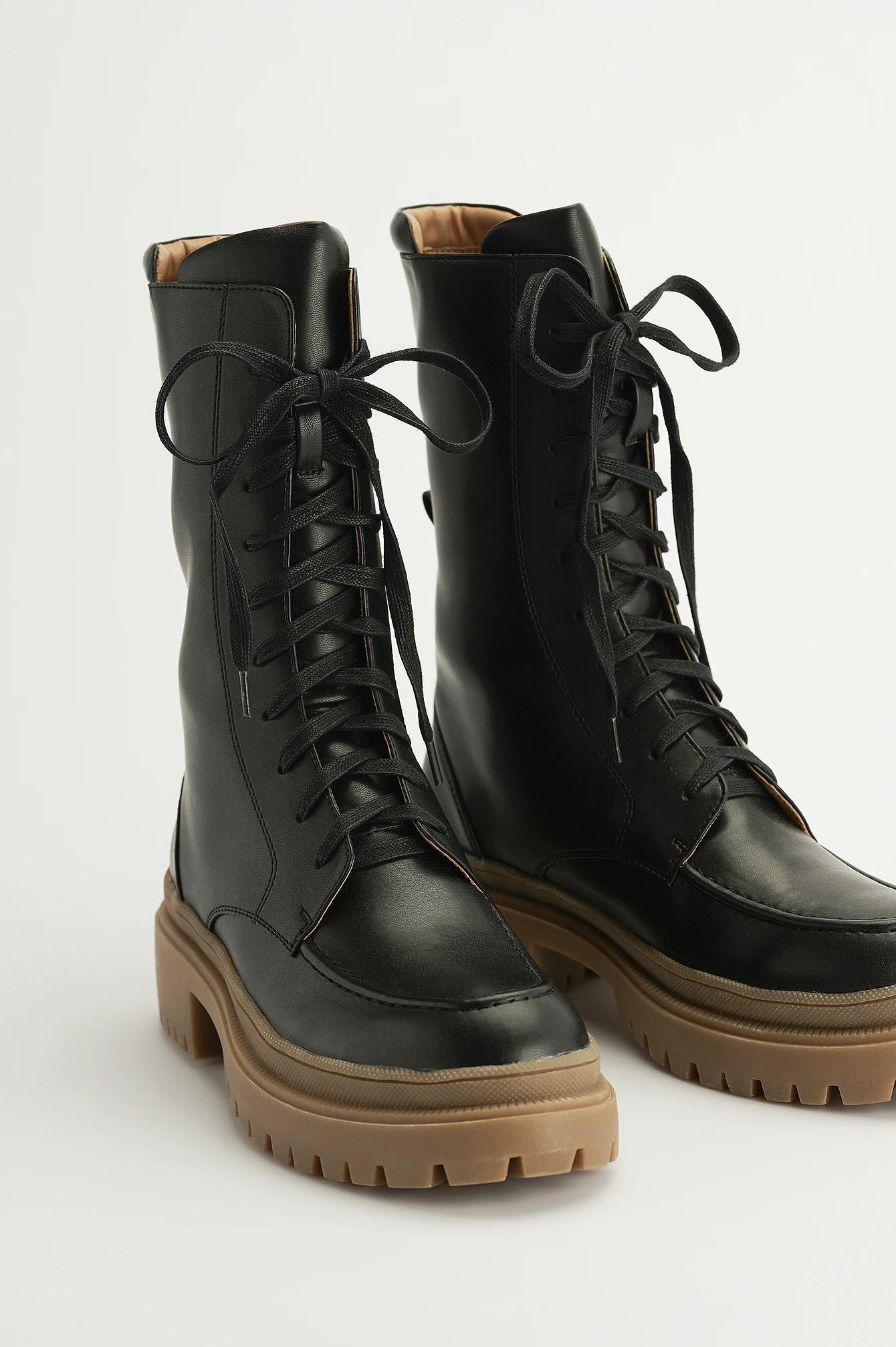 These boots are calf-length and feature a lace up design, a chunky sole and a seam detail on the shaft. Sole Height: 5,5 cm / 2.2 in. The shaft height on this boot measures 21,5 cm / 8.46 in in size 39. The shaft height might differ from size to size.
