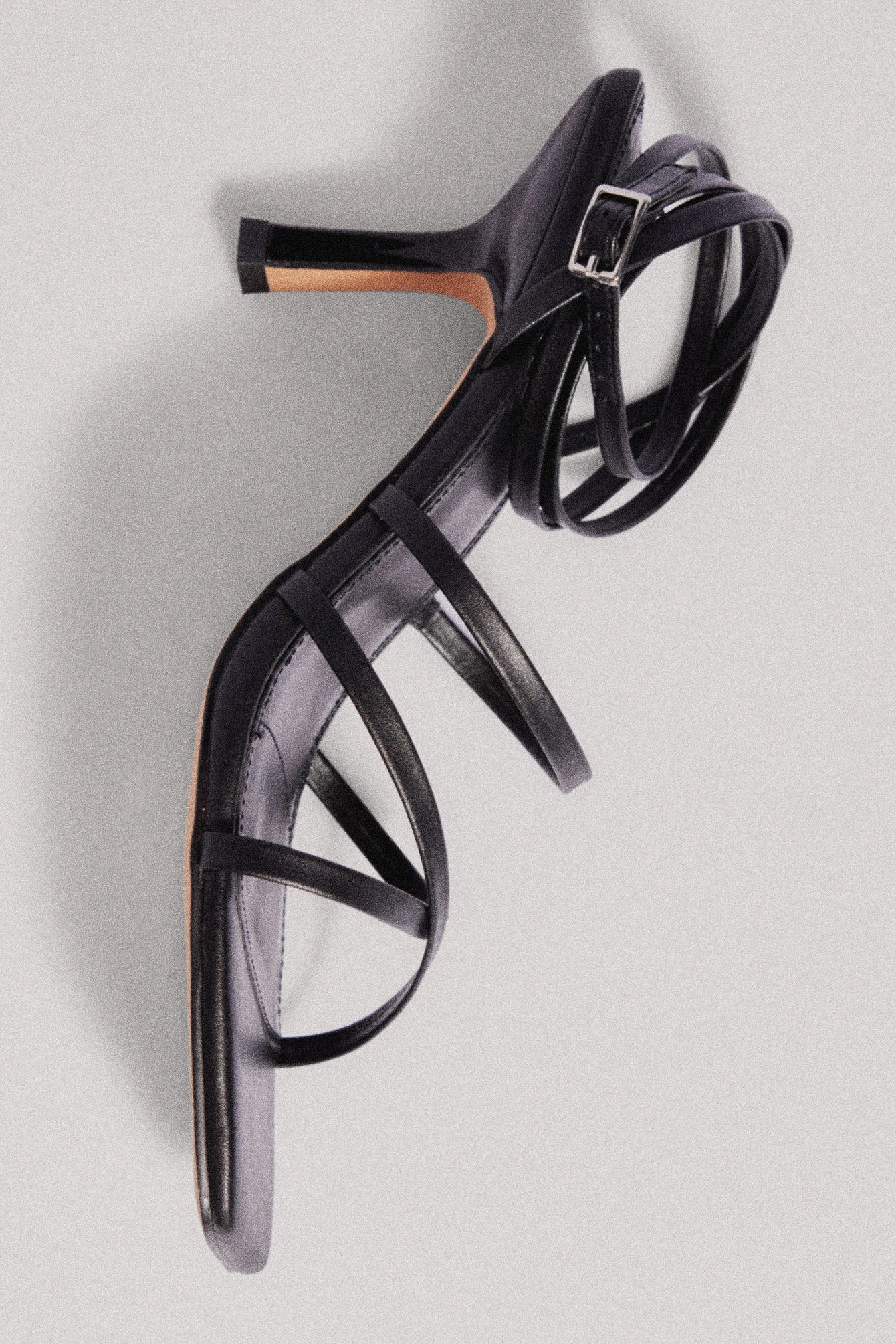 These sandals feature a heeled sandal with a square toe. They have a faux leather material and thinner crossover straps. Our sandals feature an ankle-strap fastening with a buckle detail. Measurements in size 39: Heel height: 7.5 cm / 2.95 in.