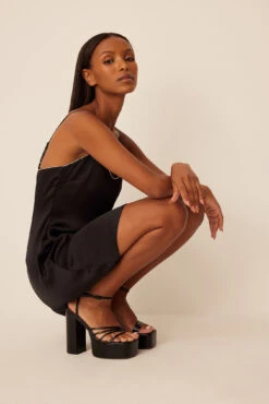 This mini dress is stretchy and features a square neckline with wide shoulder straps and tight fit.