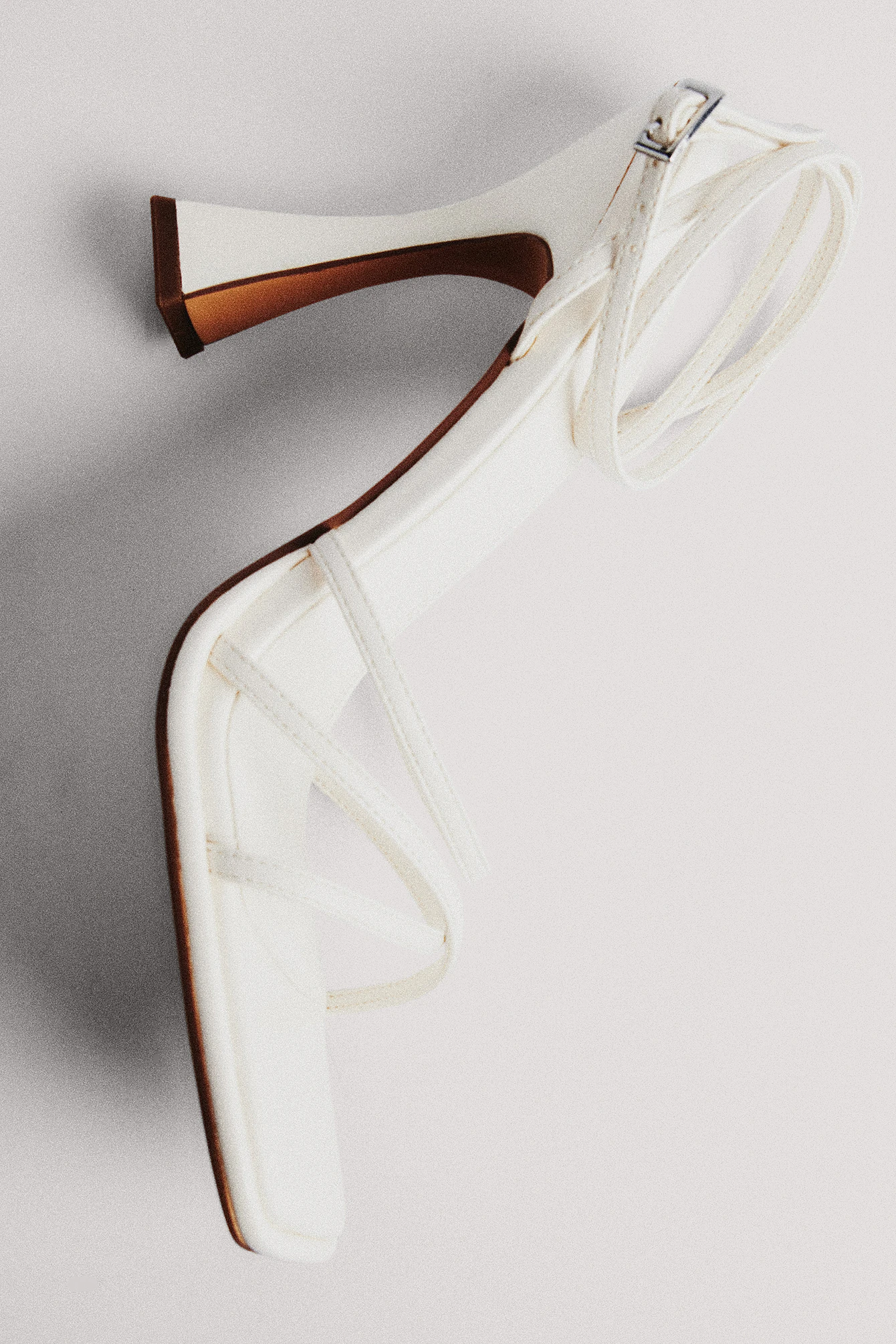 These heels feature a square toe. They have crossover straps and an adjustable, thin ankle-strap fastening. These heels feature a curved high heel. Measurements in size 39: Heel height: 12 cm / 4.72 in.
