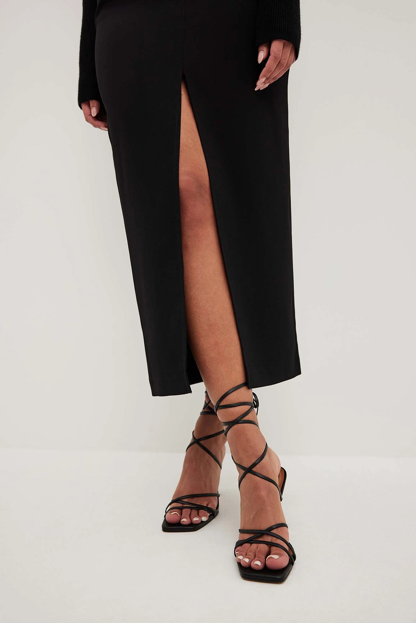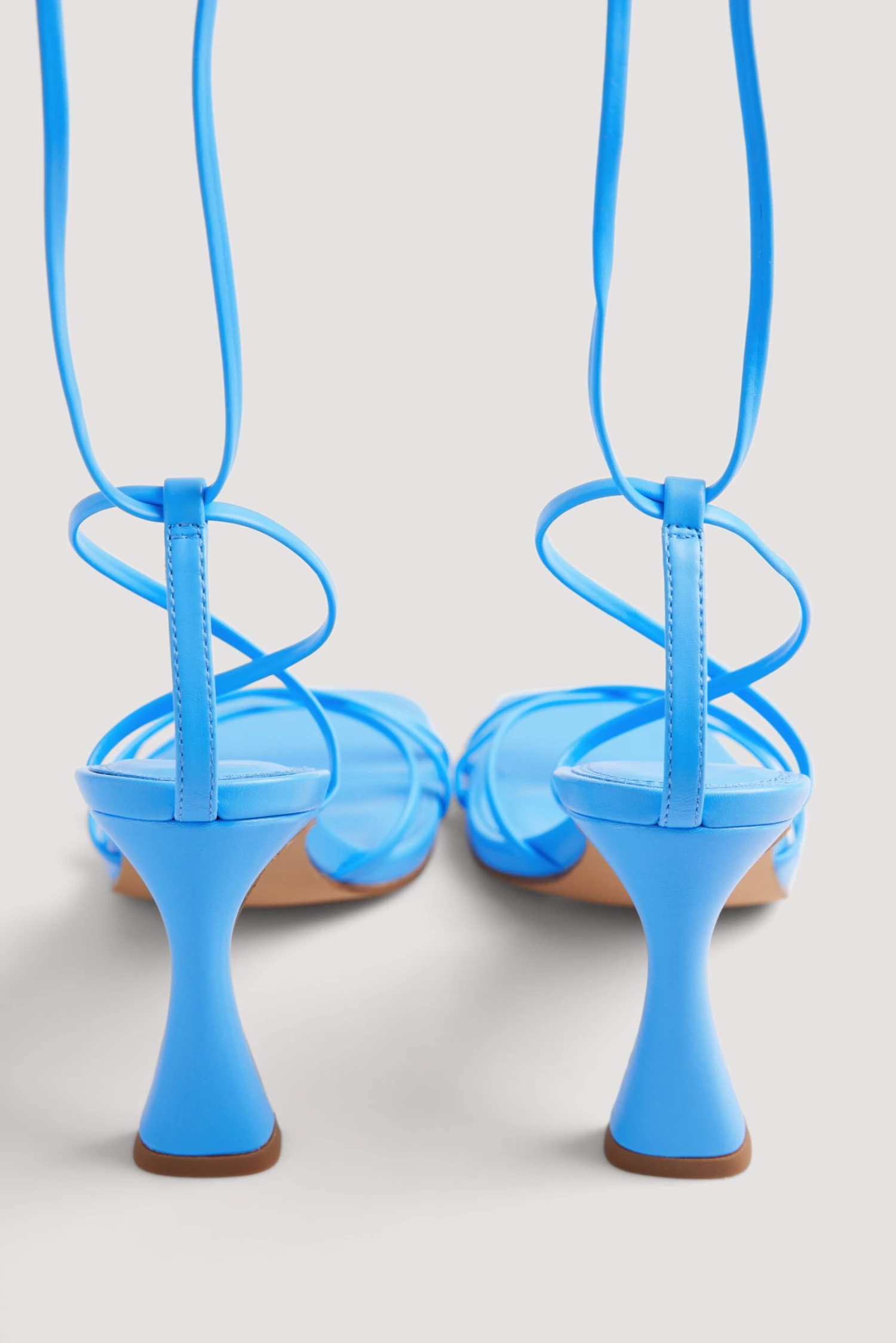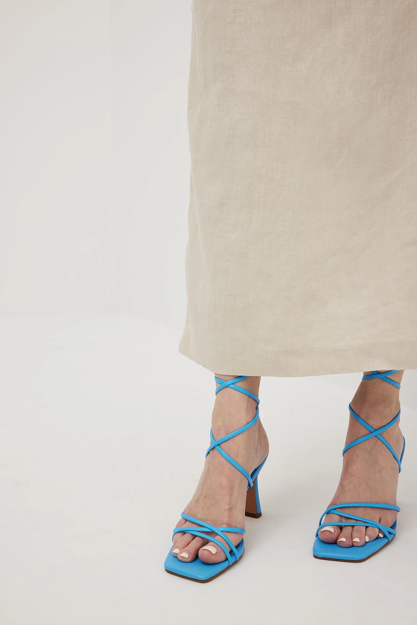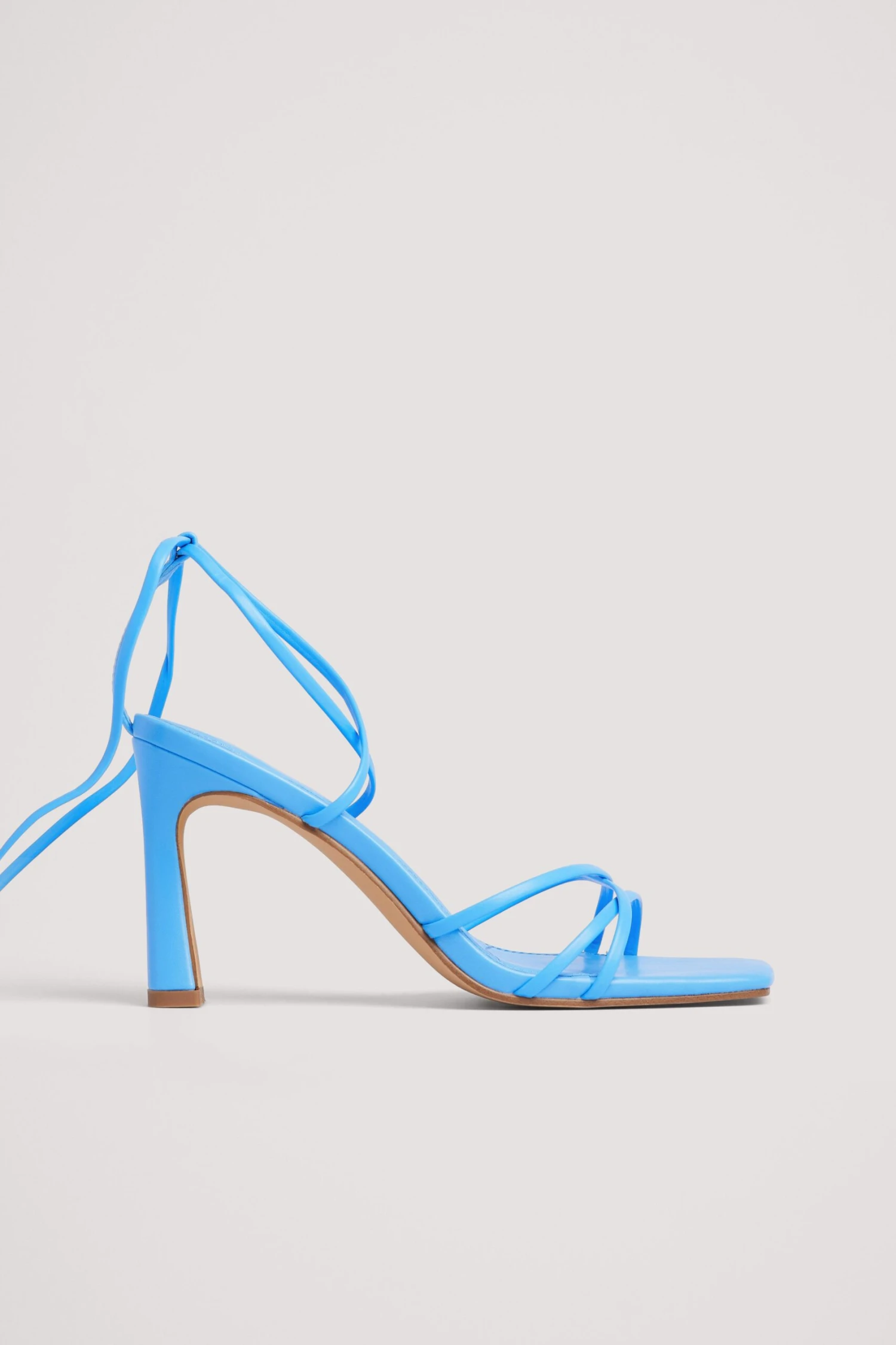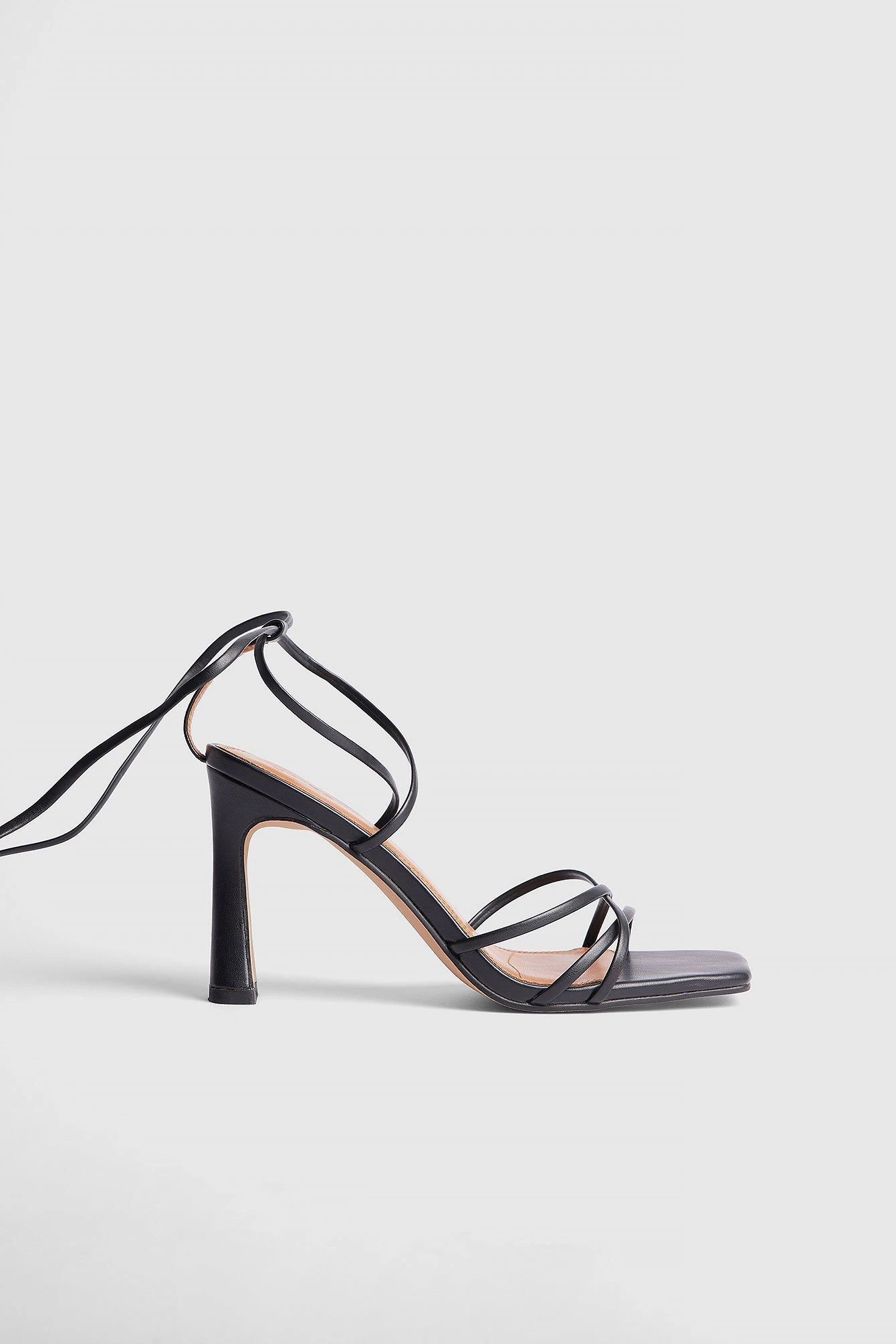 This strappy sandal is high-heeled and features a self tie closure. It has a square toe. Measurements in size 39: Heel height: 9 cm / 3.5 in.
