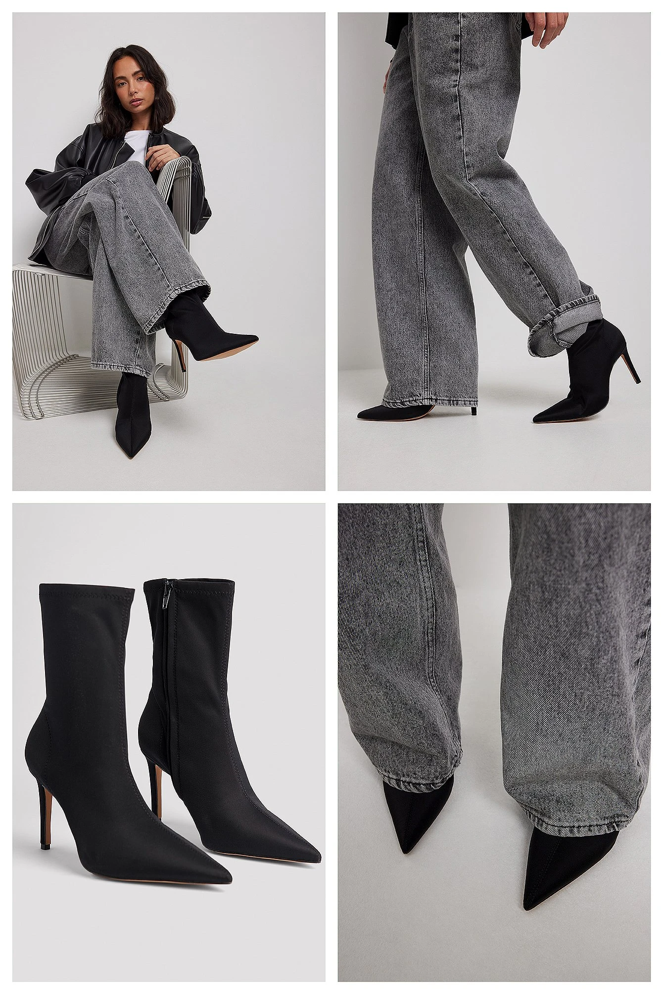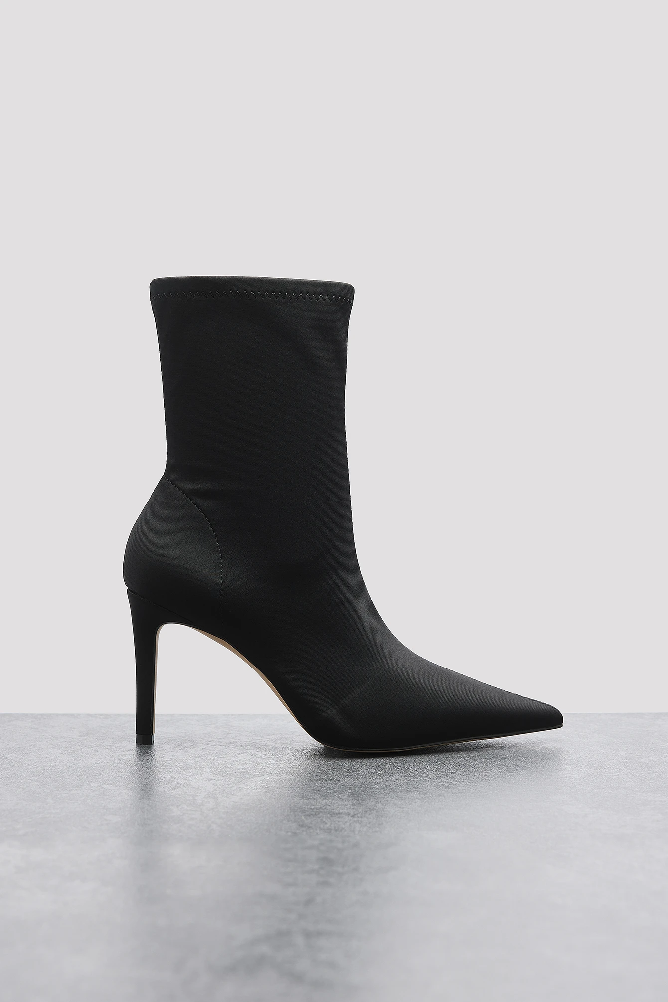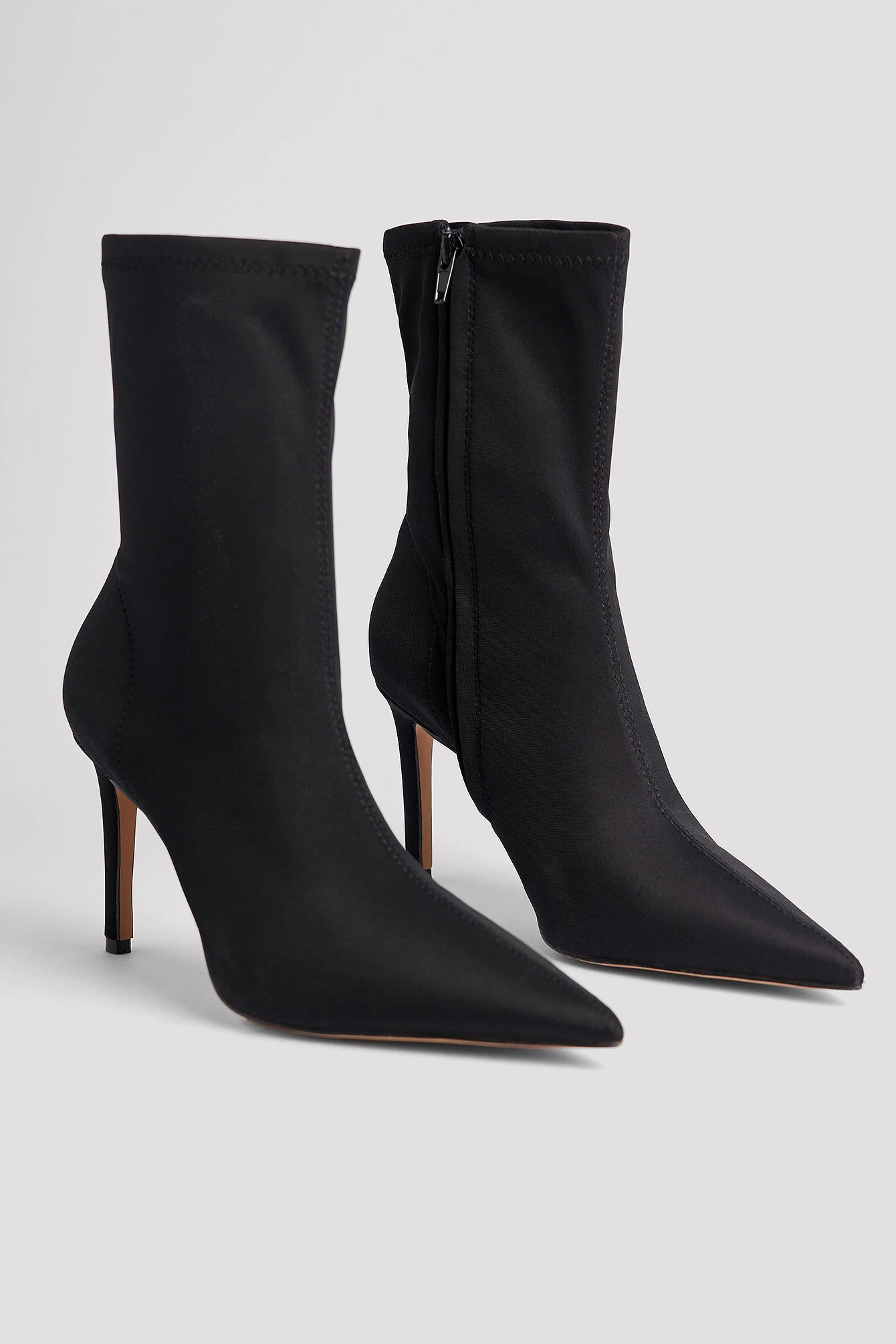 These sock boots are calf high and slightly stretchy and feature stiletto heels and a side zipper closure. Measurements in size 39: Heel height: 9 cm / 3.54 in. Shaft height: 18 cm / 7 in. Shaft circumference around the calf: 27 cm / 10.62 in.