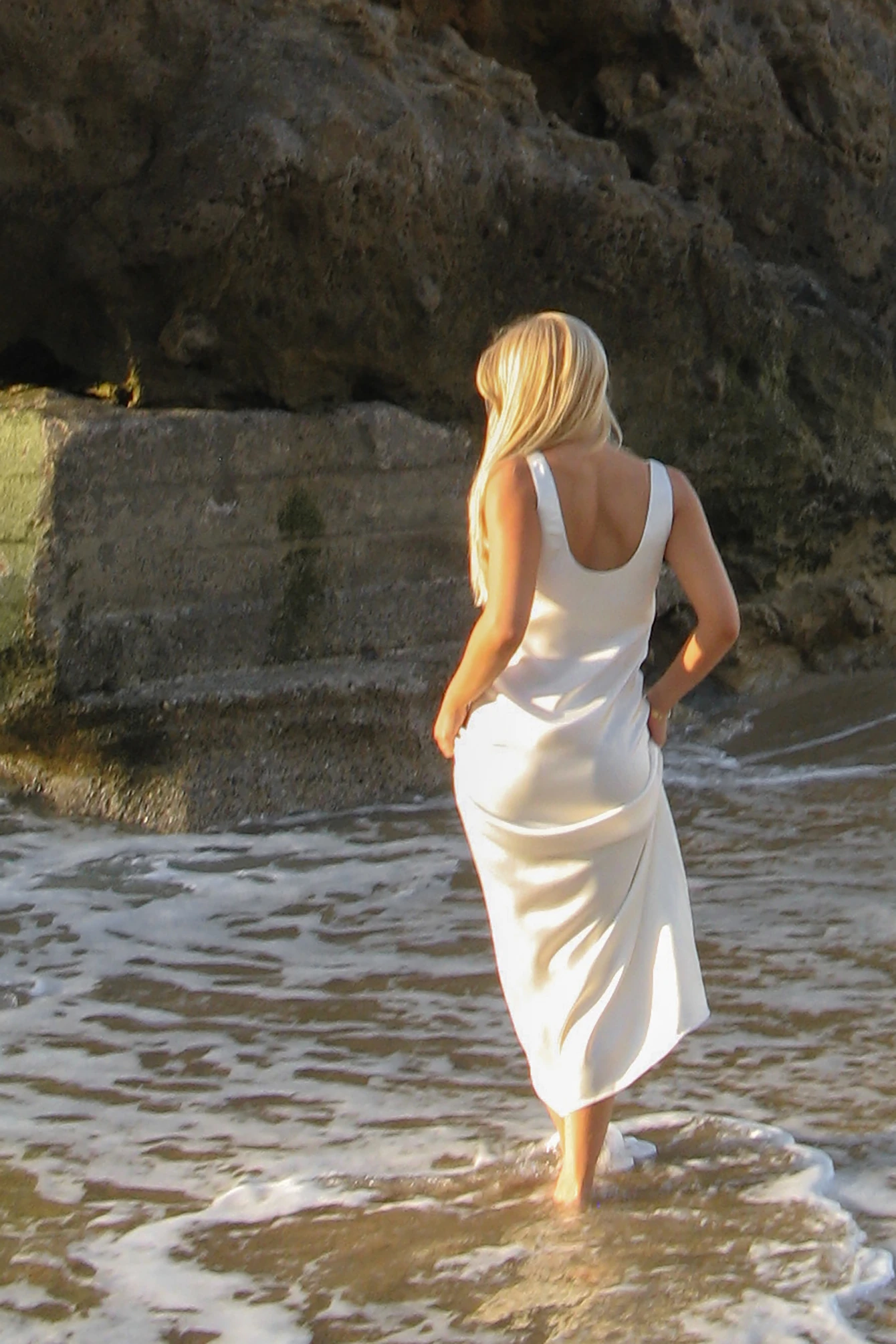 This dress features satin fabric. It has a straight fit and a maxi length. This dress features a round neckline and a deep back.