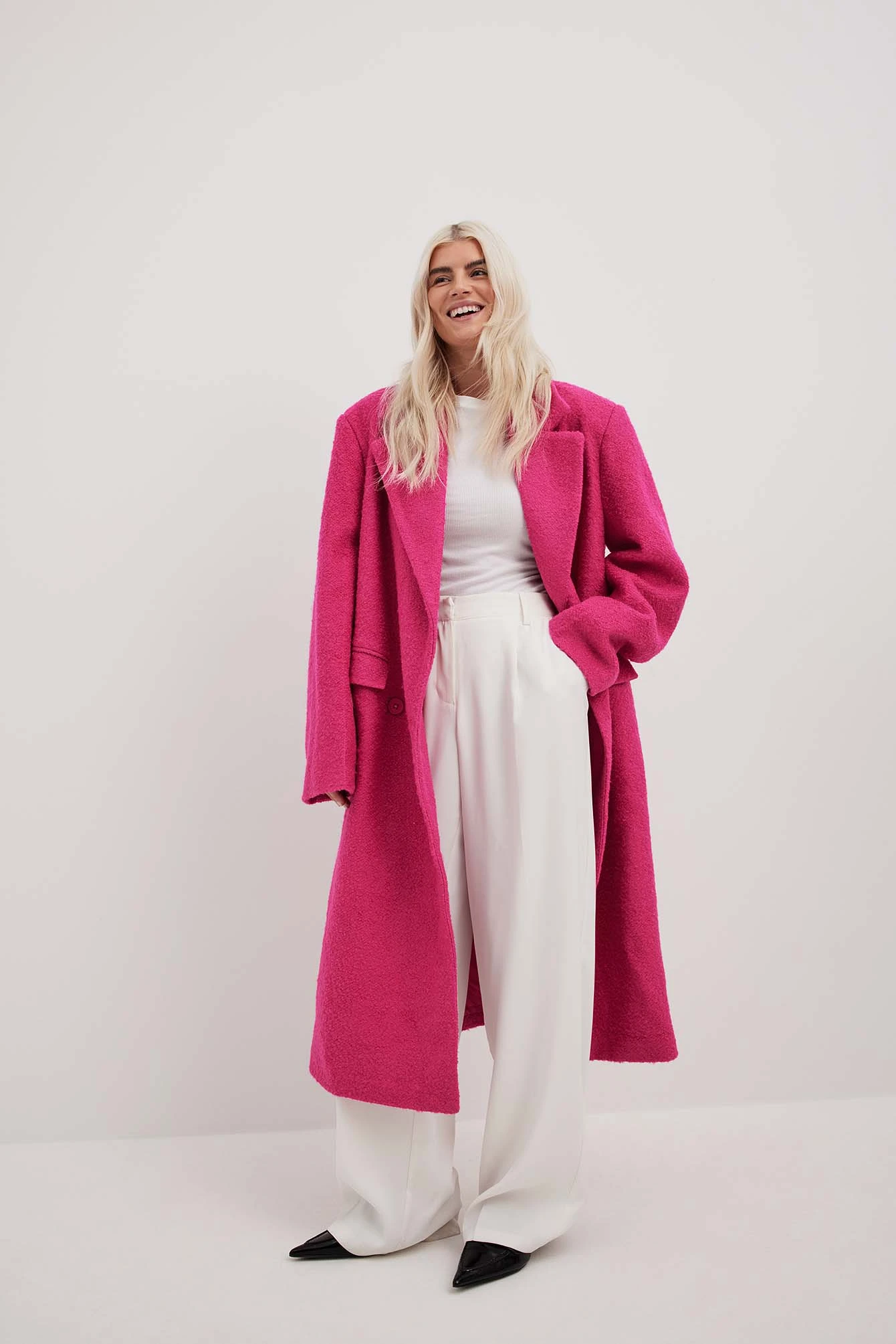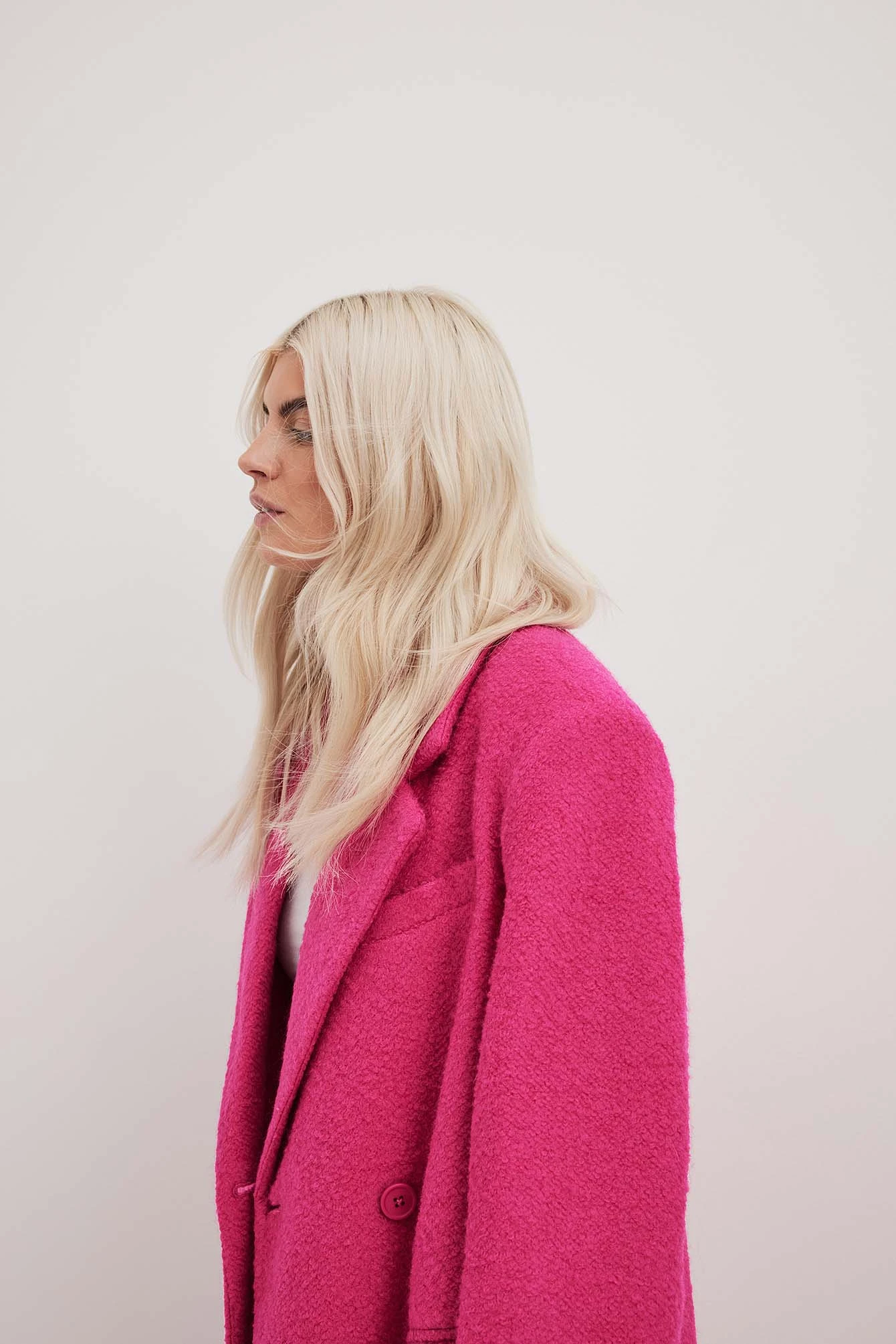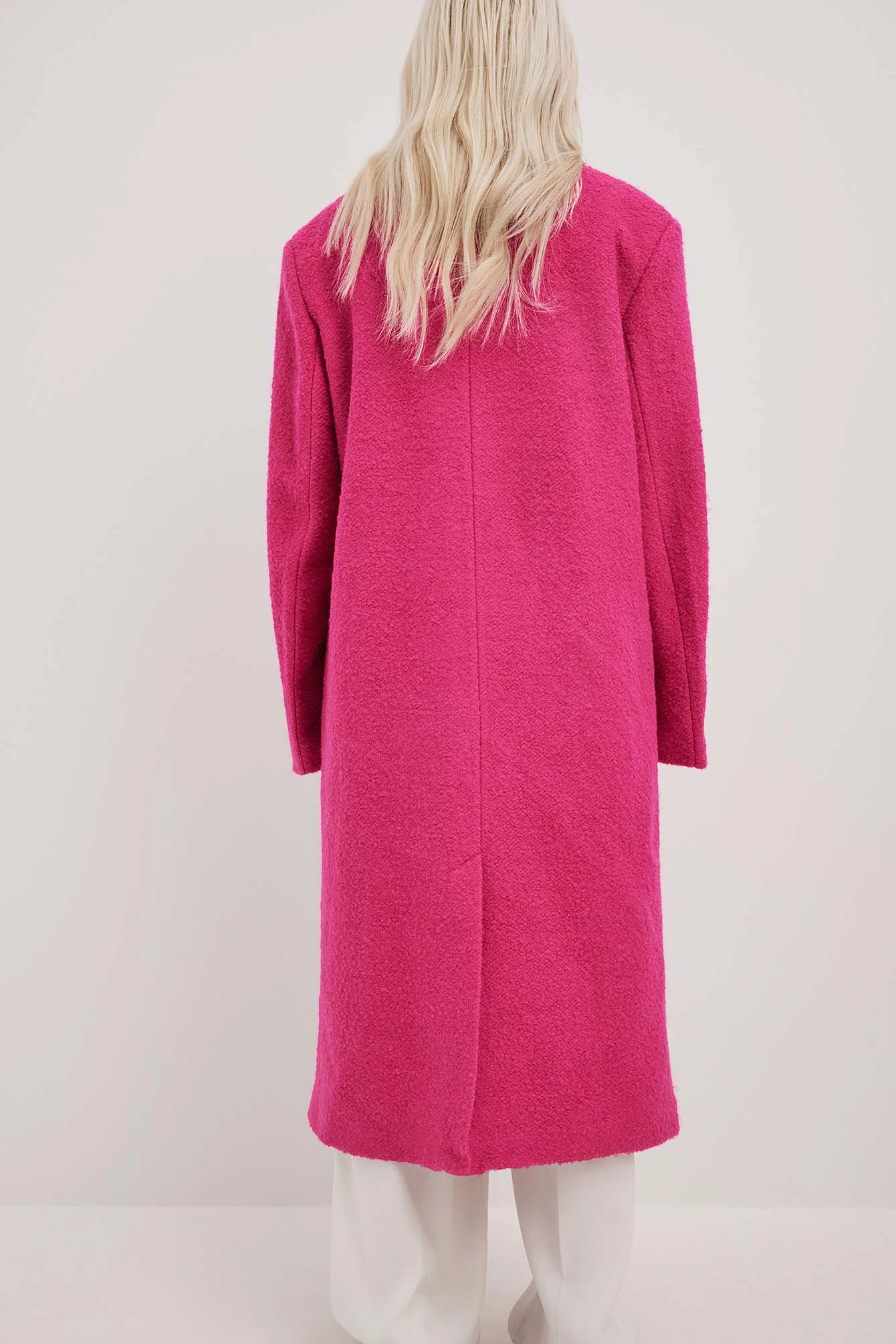 This coat features a textured material. It has a lapel neckline and padded shoulders. This coat features button closures down the front, two front flap pockets, a back slit detail and a lining.