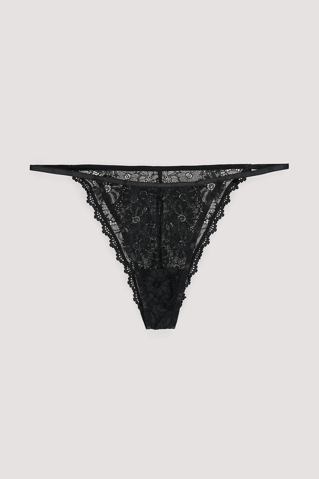 These panties are v-shaped and feature a high cut leg. They have a lace design with details with a flower pattern and thin, stretchy side straps. These panties feature a crotch lining.