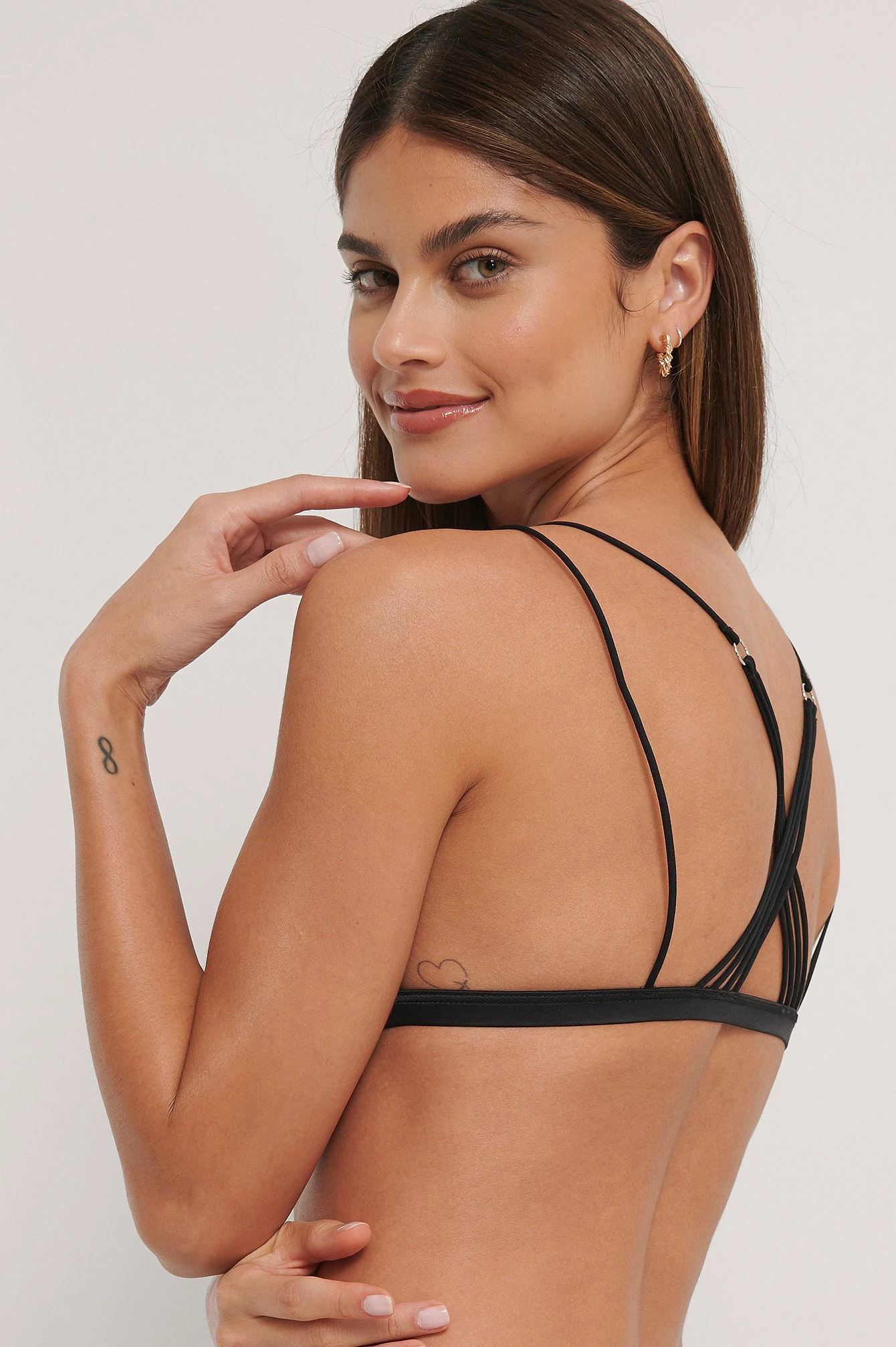 This bralette features non adjustable cross straps, a padded, soft triangle design, satin touch and a hook closure at the front.