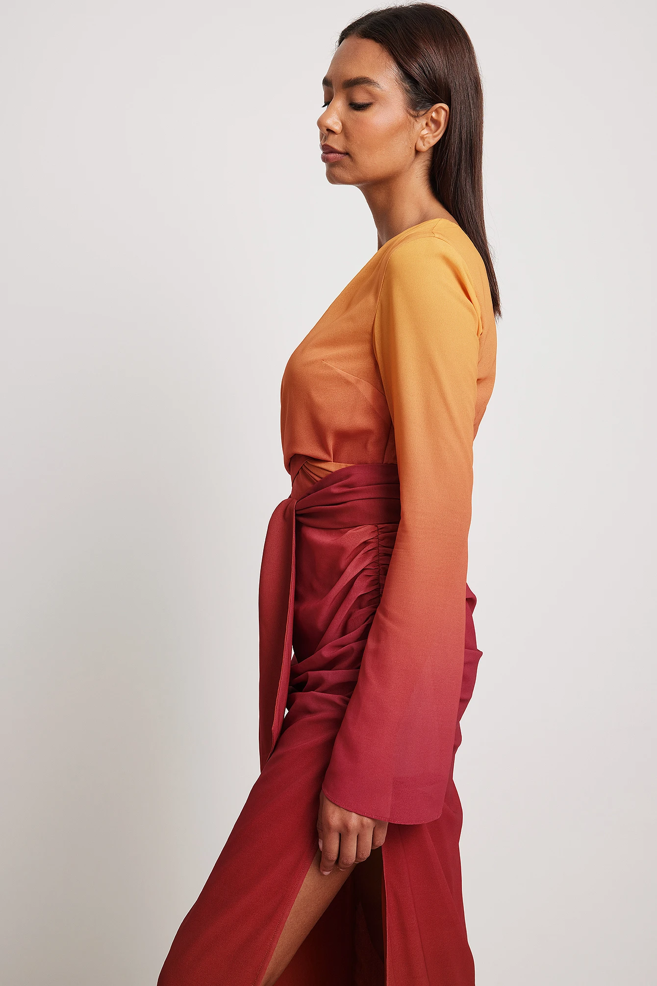 This maxi dress features a v neckline with a wide tie strap, long trumpet sleeves, a side zipper closure with a gathered detail, a flowy fit and a lining.
