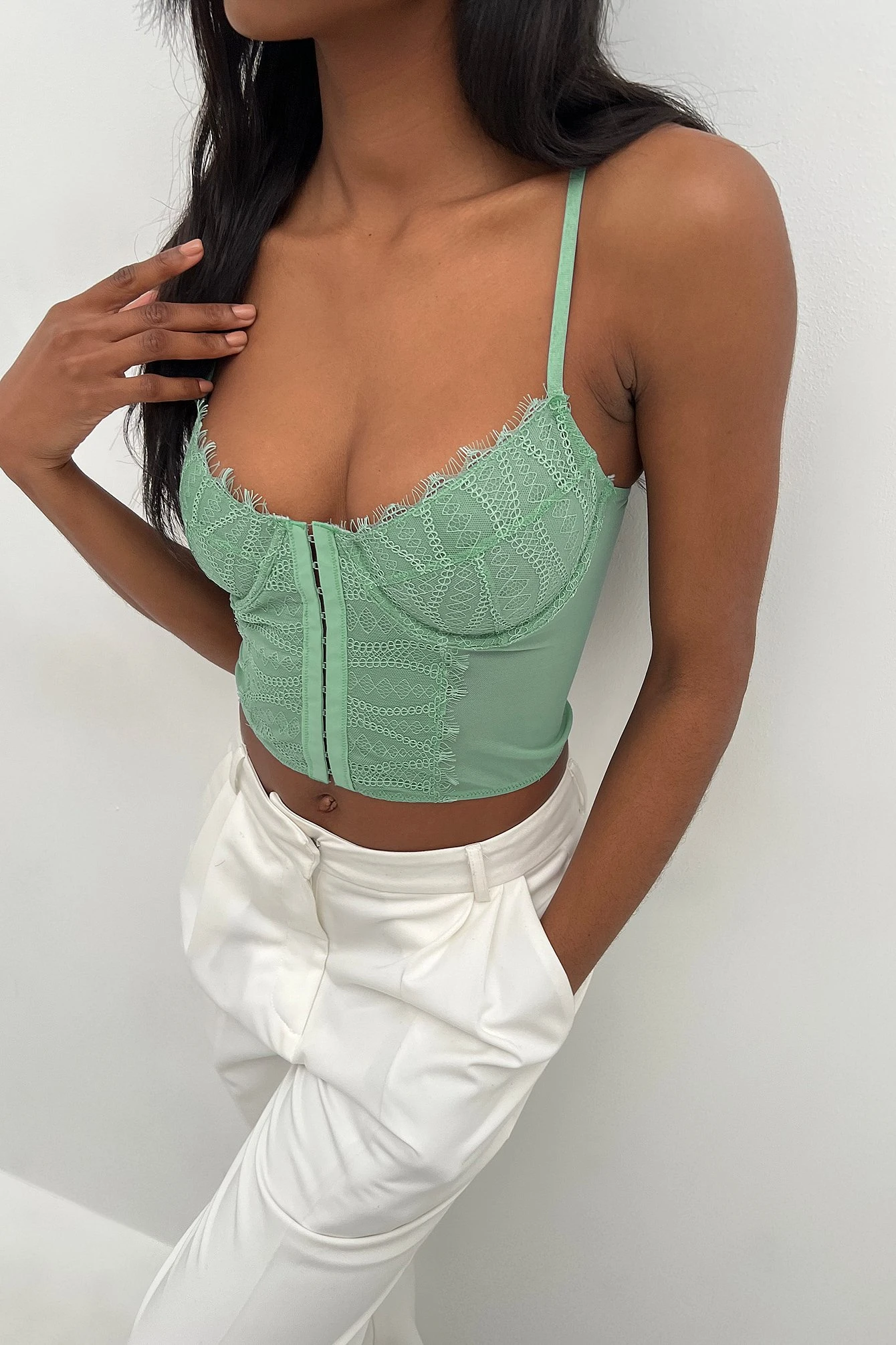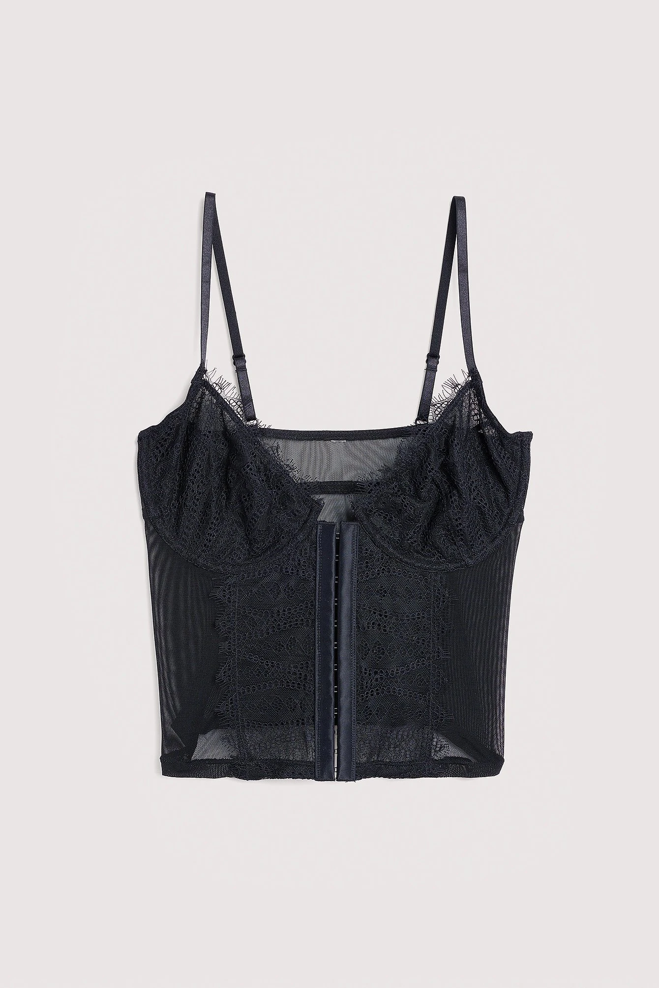 This corset is made of lace and features a lace bra with an underwire cup. It has a hook closure at the front and adjustable shoulder straps.