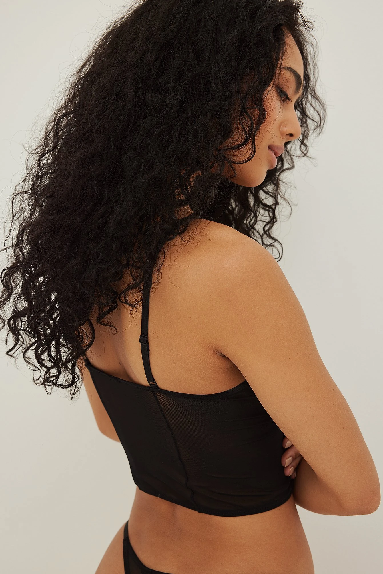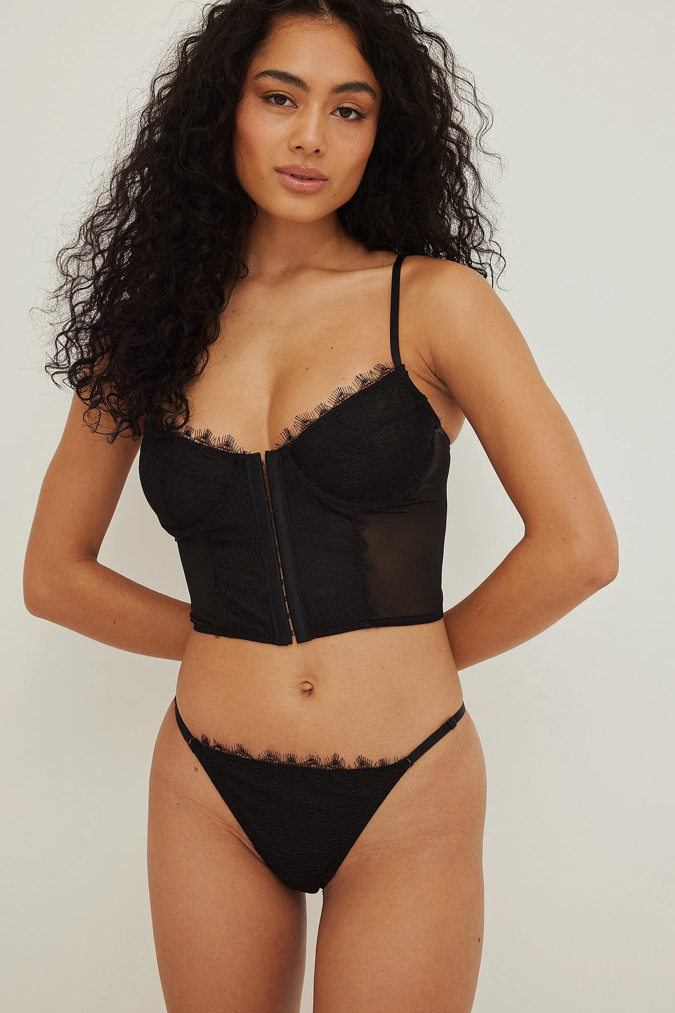 This corset is made of lace and features a lace bra with an underwire cup. It has a hook closure at the front and adjustable shoulder straps.