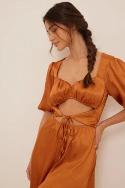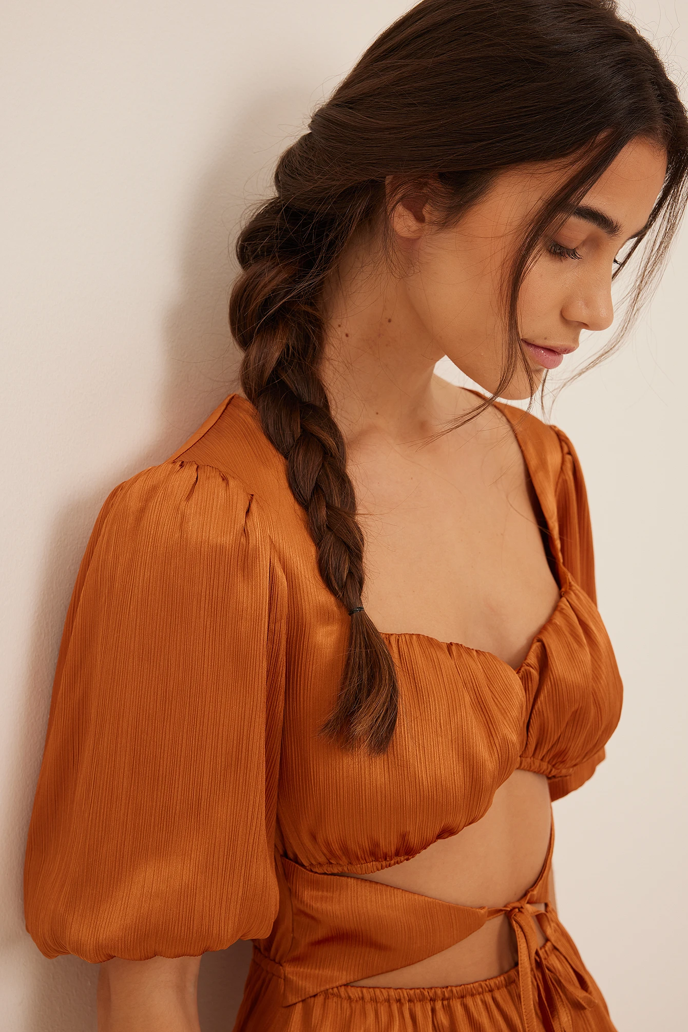 This mini dress features a v neckline, puffy shoulders with an elasticized cuff, a cut out detail with an adjustable tie strap on the front, a lining, an elasticized waist and a silky material.