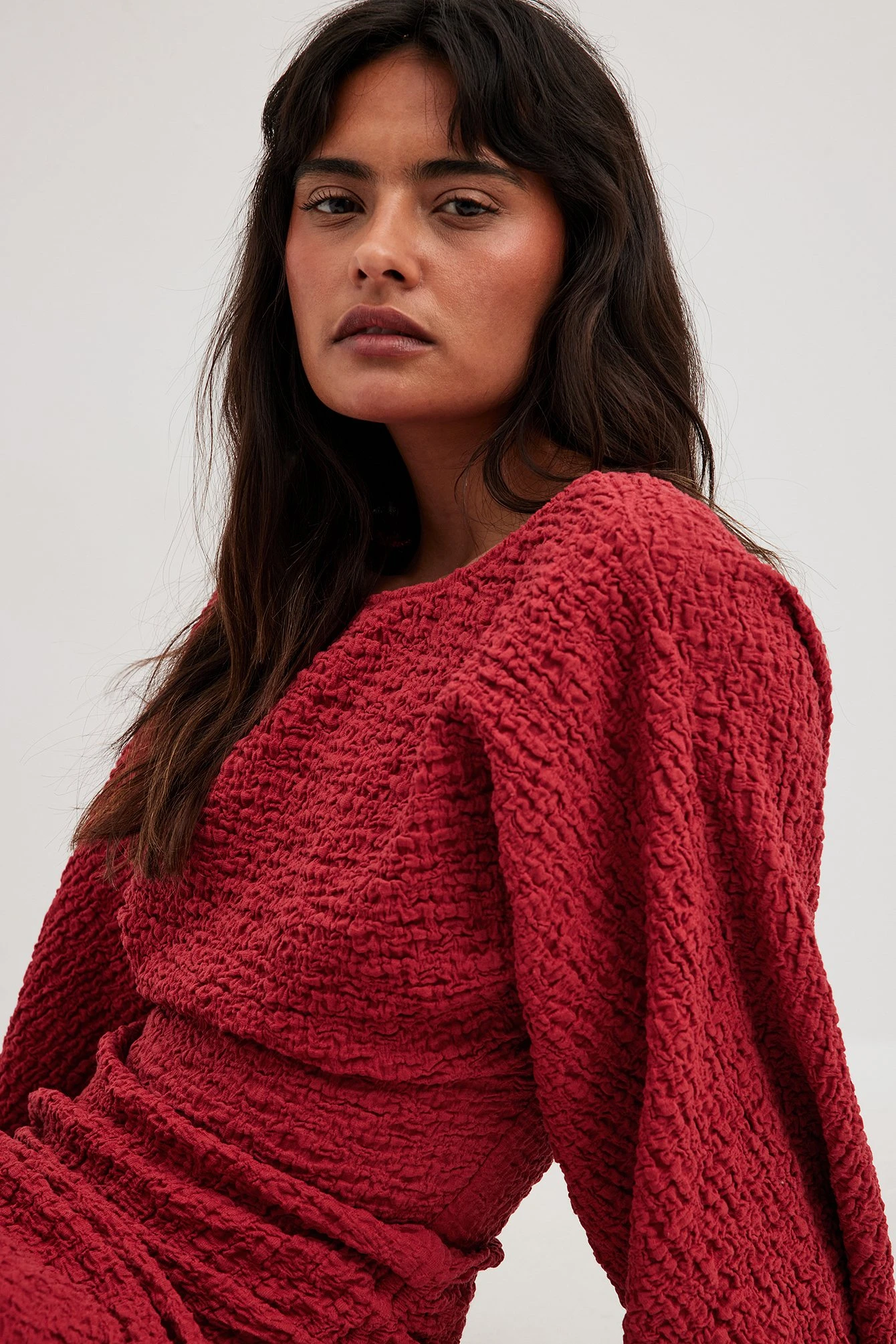 This maxi dress features a textured material. It has a round neck and wide long sleeves. This maxi dress features a side slit with an adjustable drawstring detail.