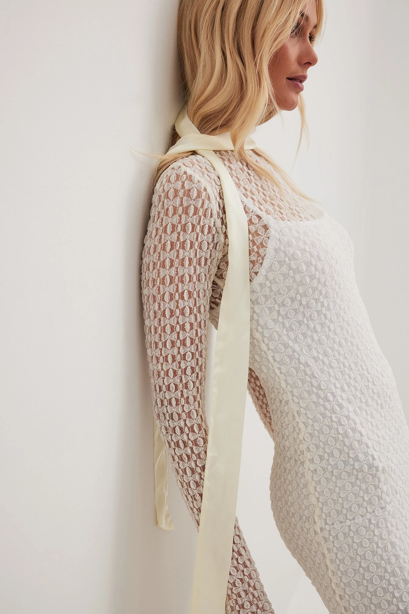 This midi dress is seethrough and made of lace and features a textured material. It has long sleeves and a crew neckline.