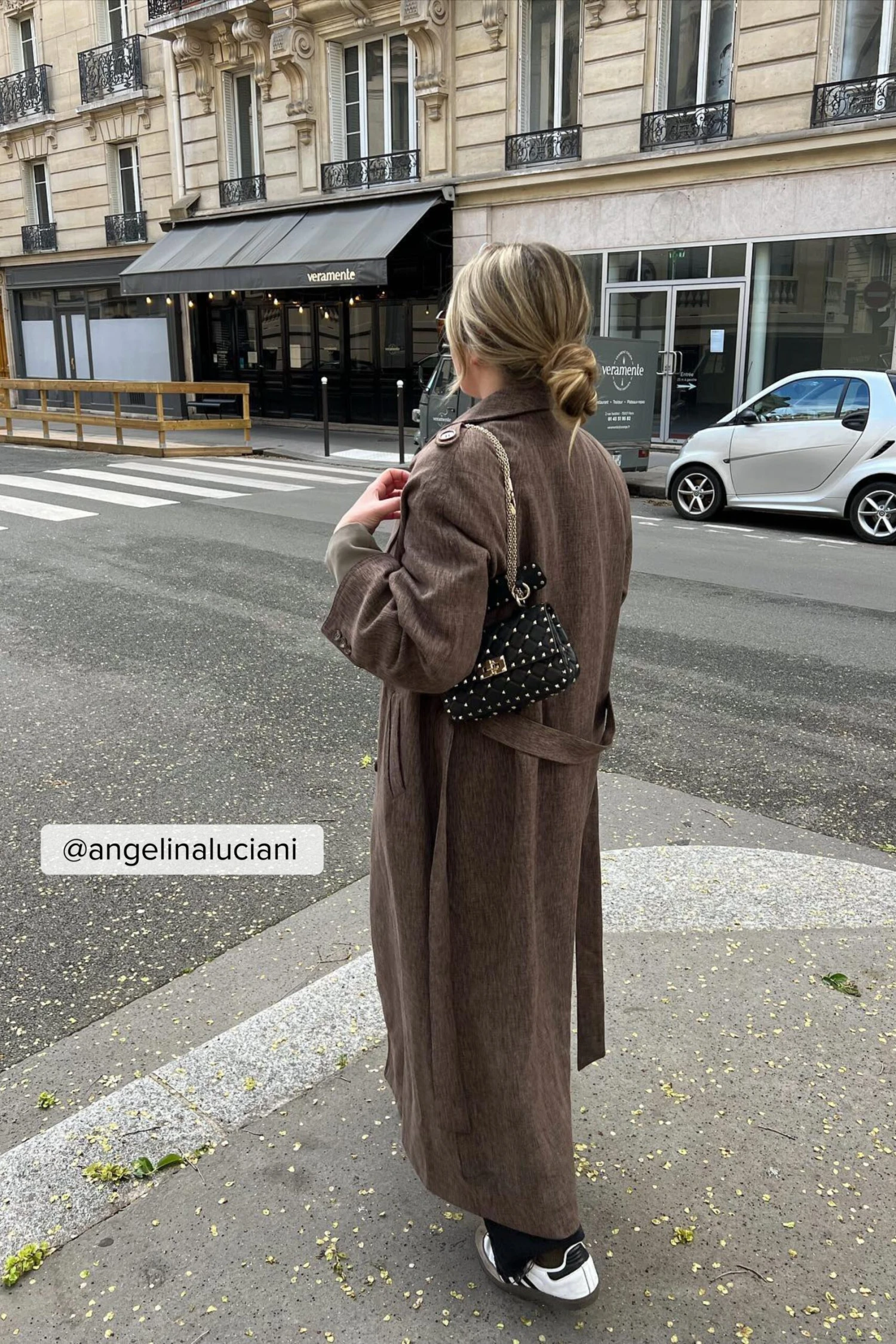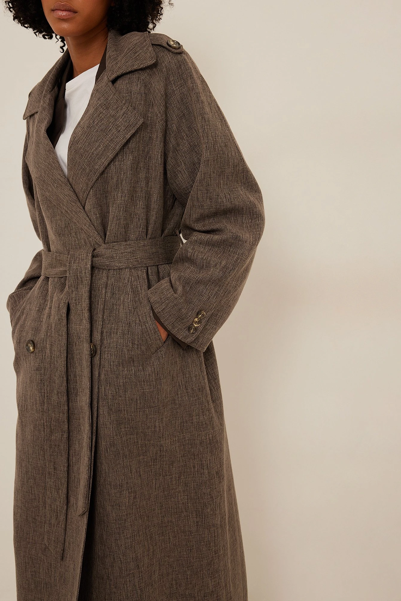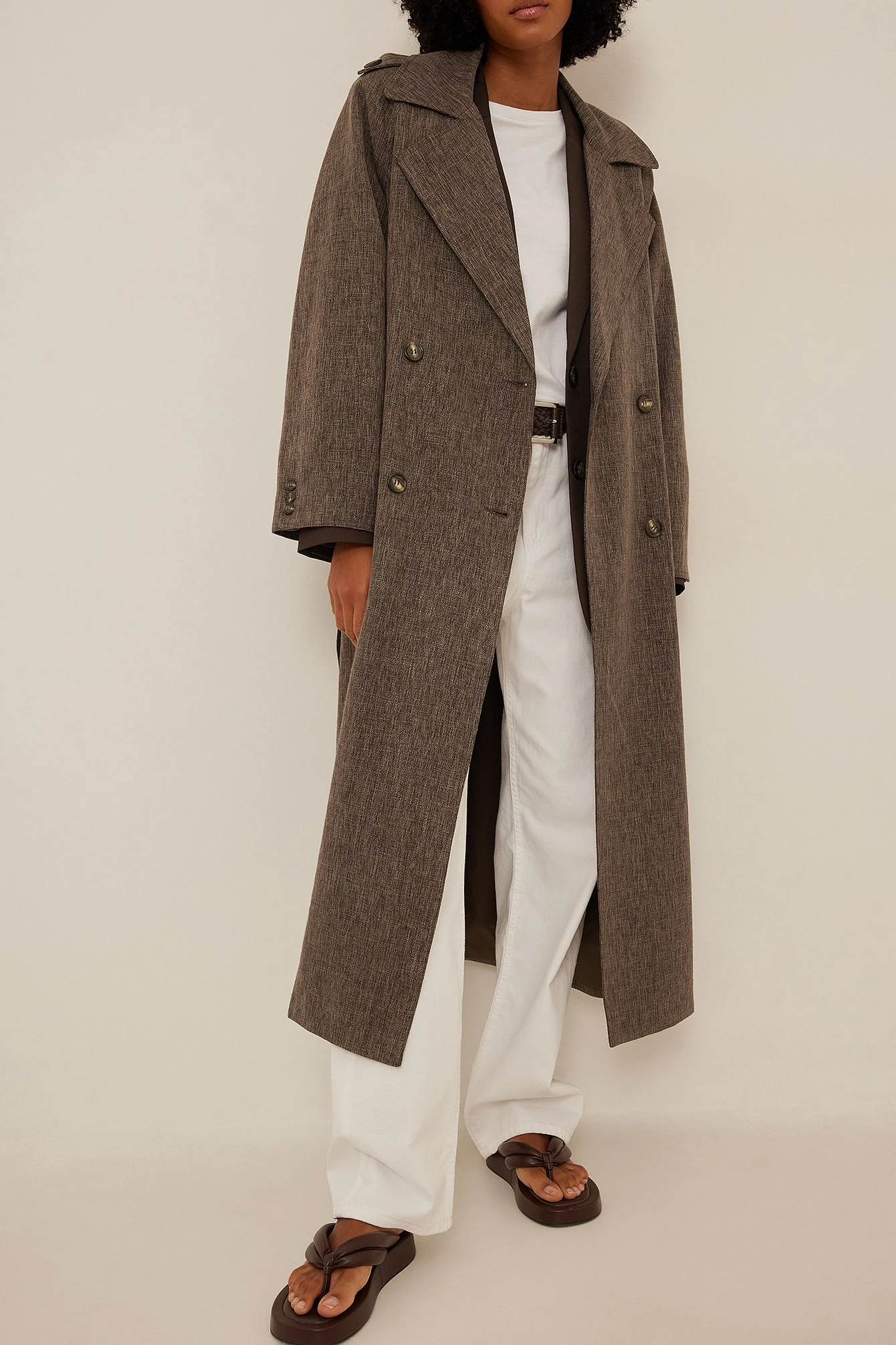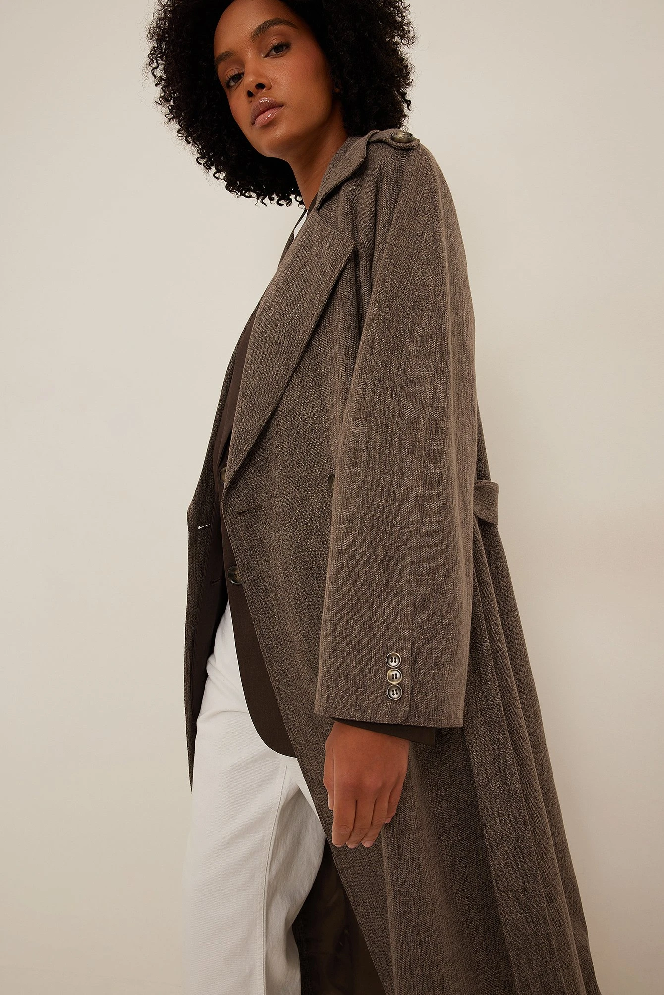 This trenchcoat is structured and belted and features a double-breasted button closure and padded shoulders with embellishments.