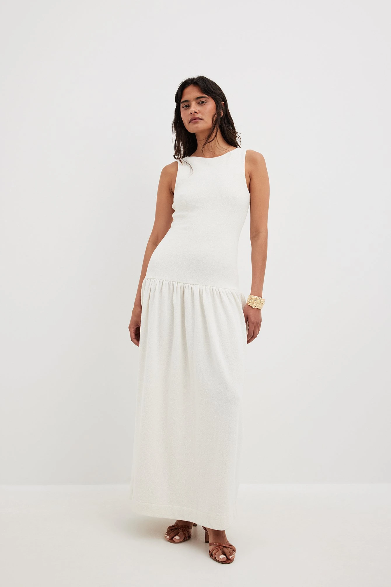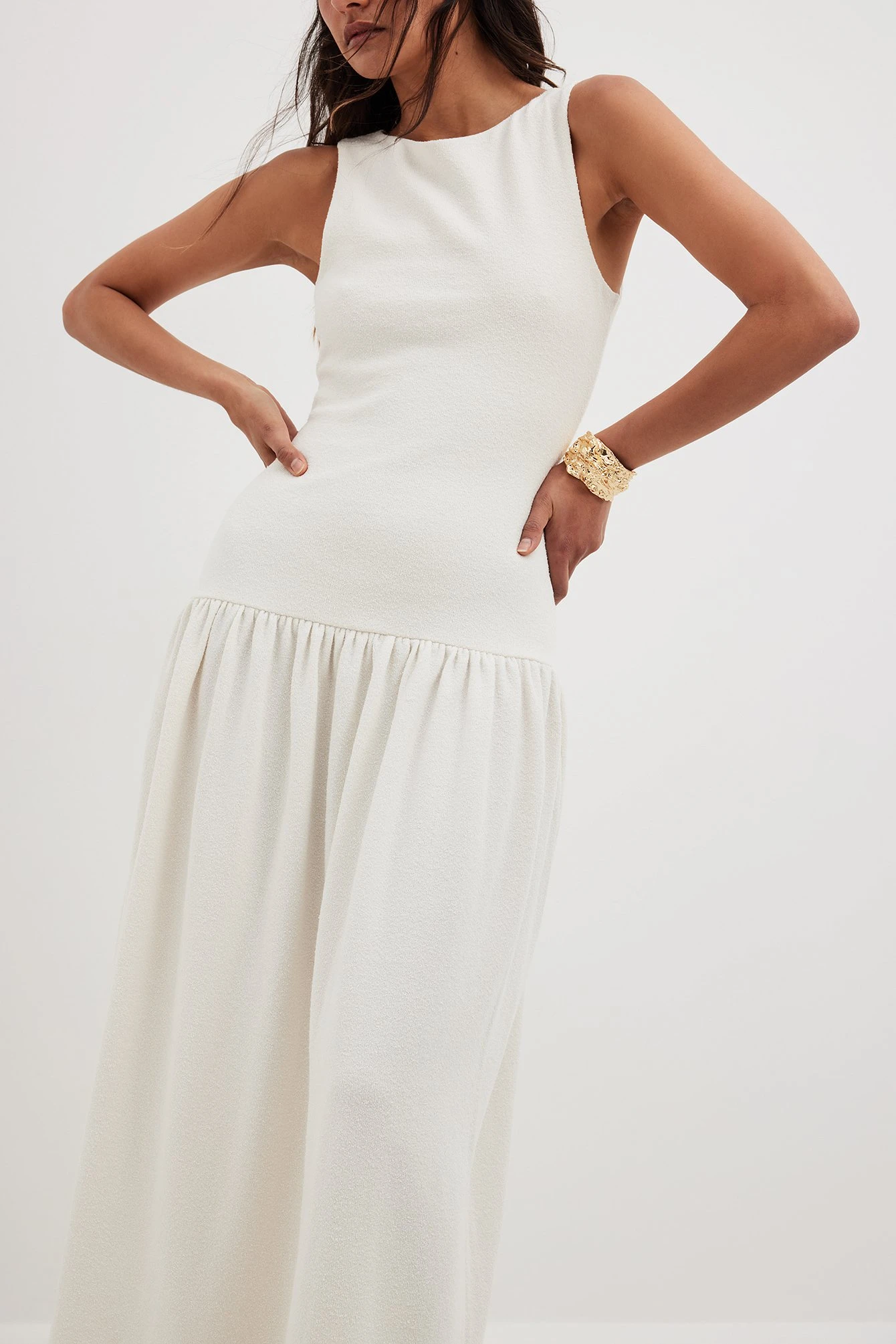 This maxi dress features a rounded high neckline. It has a textured feel and a lining. This maxi dress features a bodycon fit and a balloon skirt design.