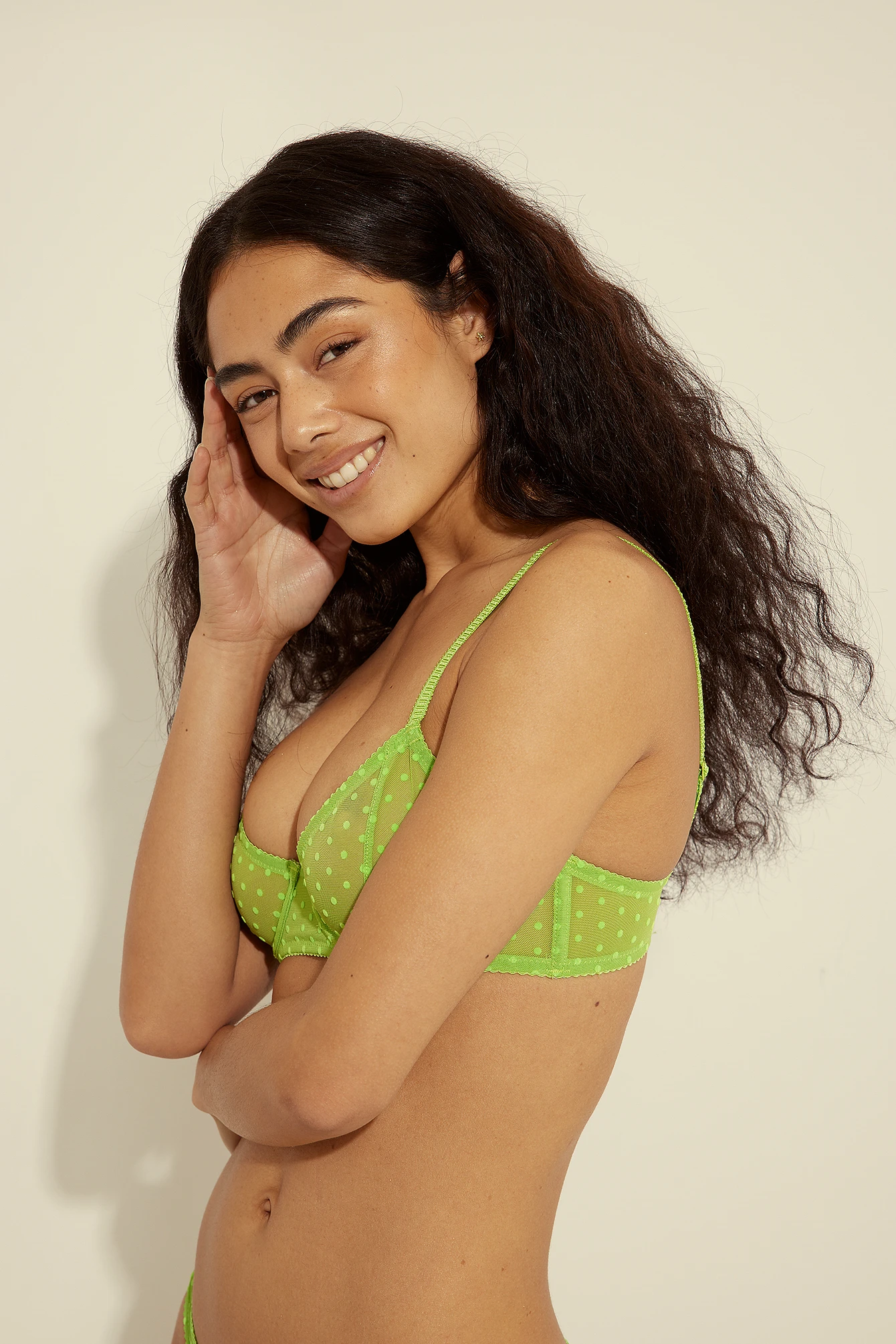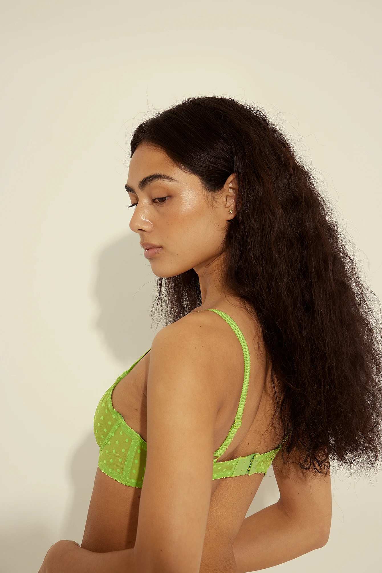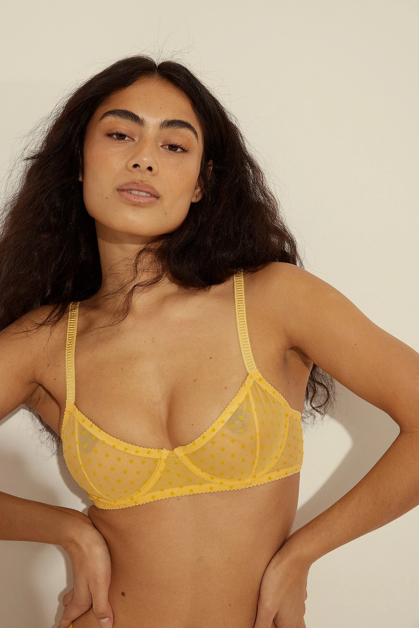 This bra features detailed, adjustable, non removable, thin shoulder straps, unpadded, underwired, seethrough cups, an adjustable hook-and-eye closure and a dotted pattern.