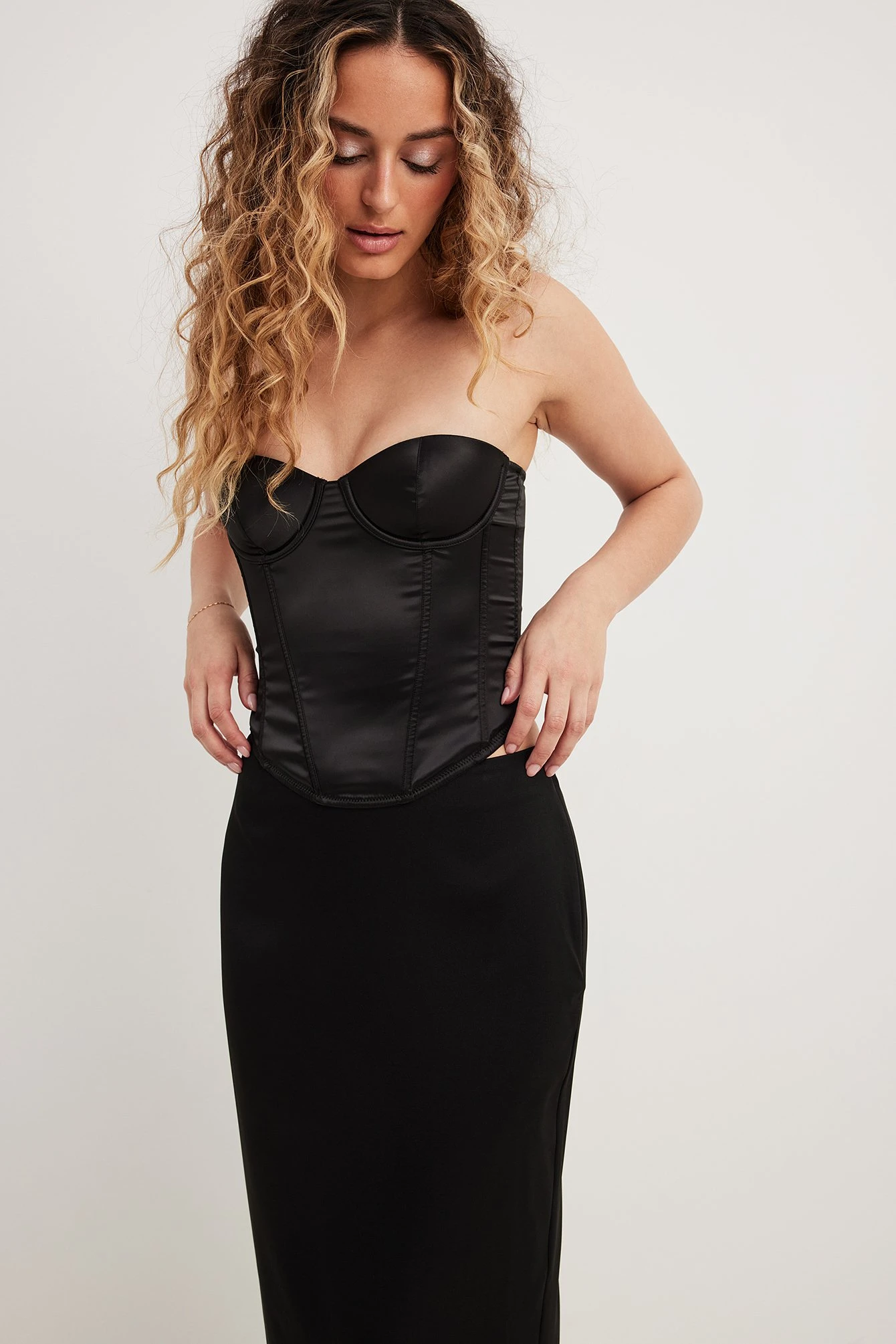 This corset is made of satin and features an inner silicone trim. It has a padded underwire cup and an adjustable hook closure on the back. This corset features a stretchy material.