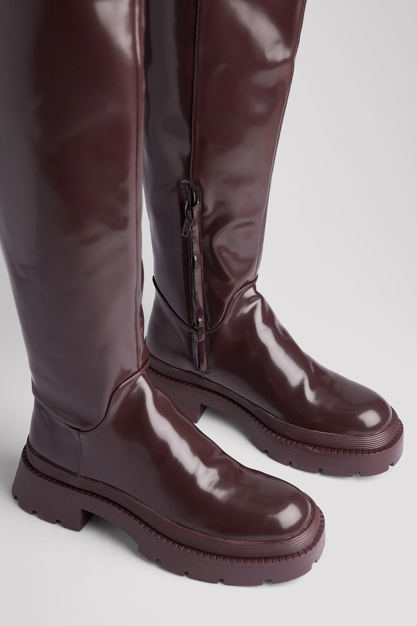 These boots are chunky and feature a thigh high design, a side zipper closure and a back slit detail. Measurements in size 39: Sole height: 4 cm / 1.6 in. Shaft height: 56 cm / 22 in. Shaft circumference around the calf: 37 cm / 14 in.