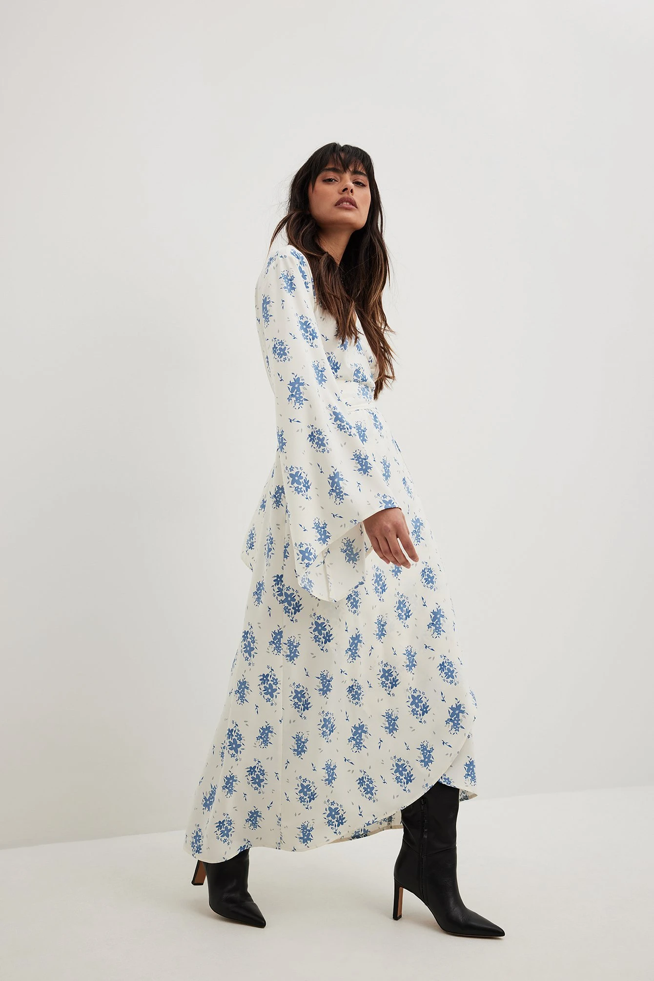 This maxi dress features a satin touch. It has a flowy fit and a wrap design with a self tie detail. This maxi dress features a v neckline and flared sleeves.