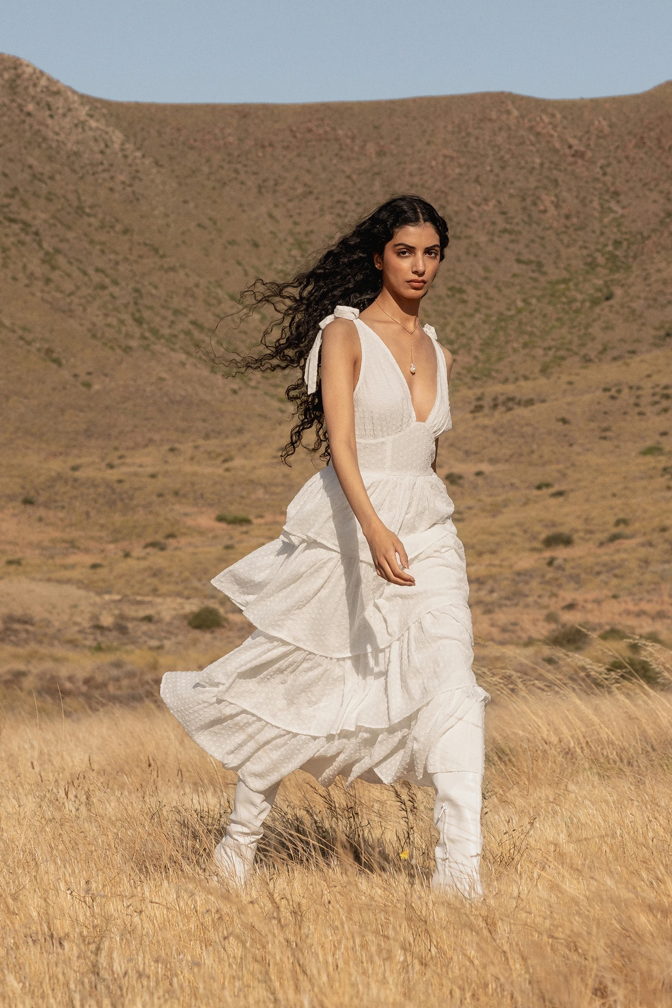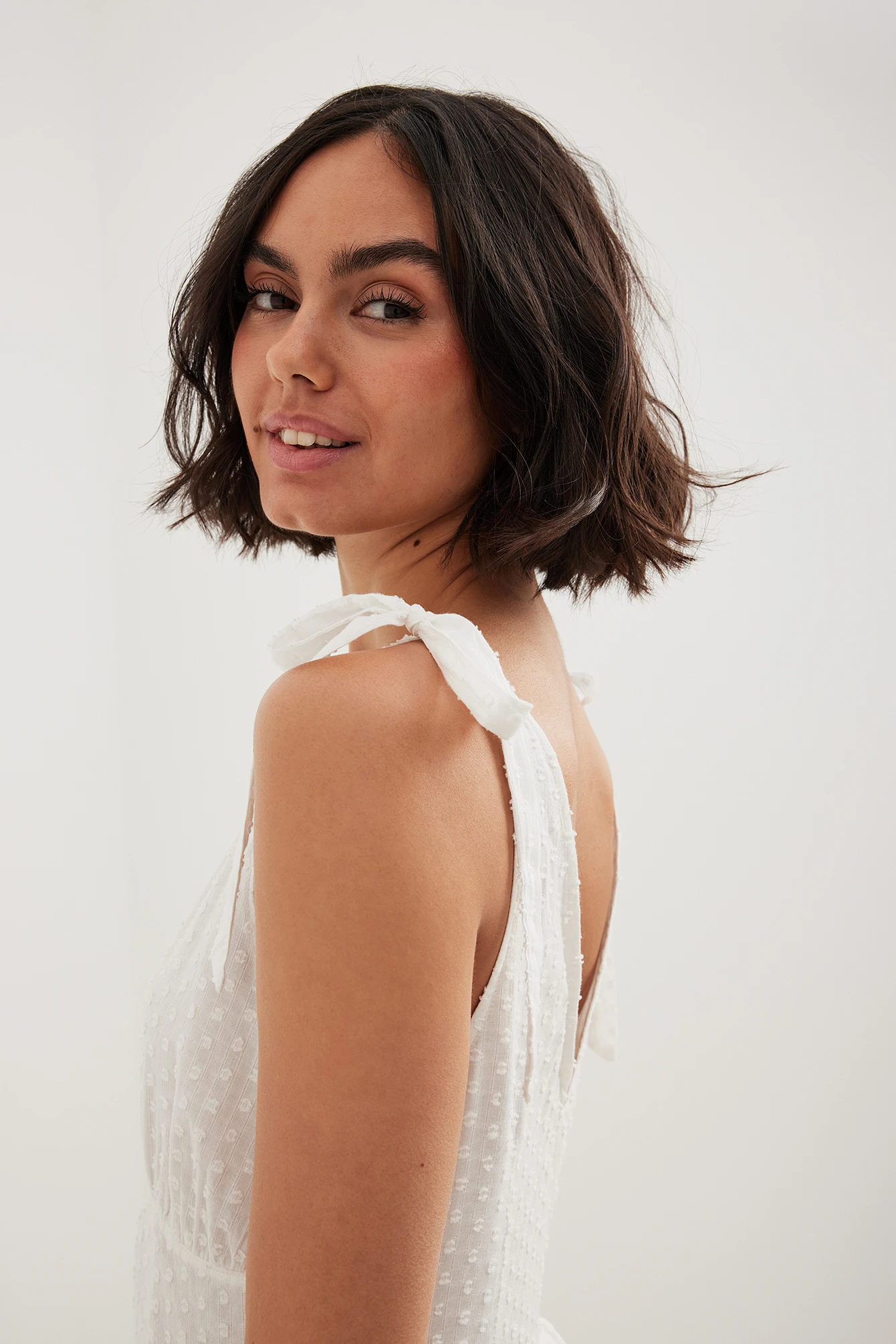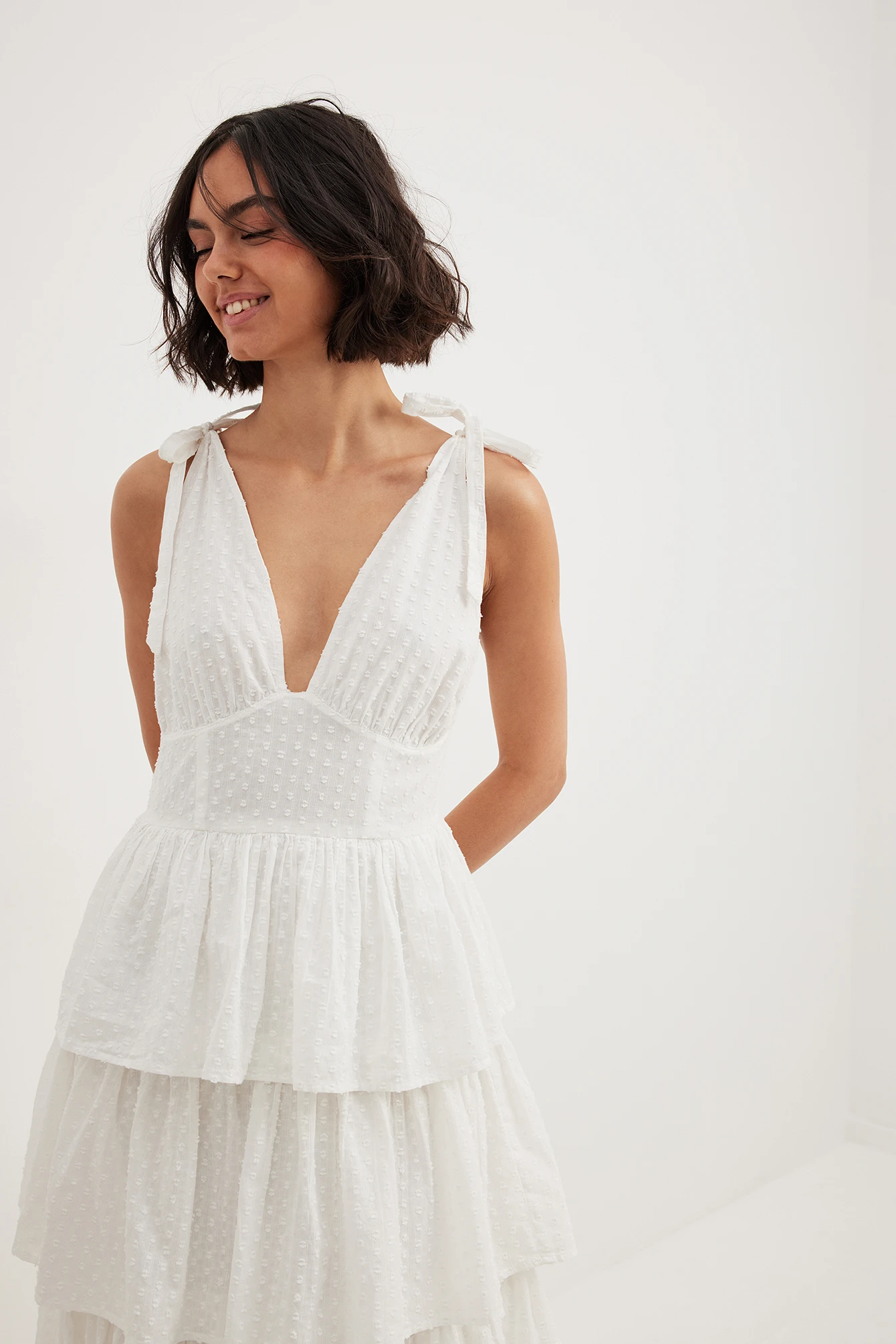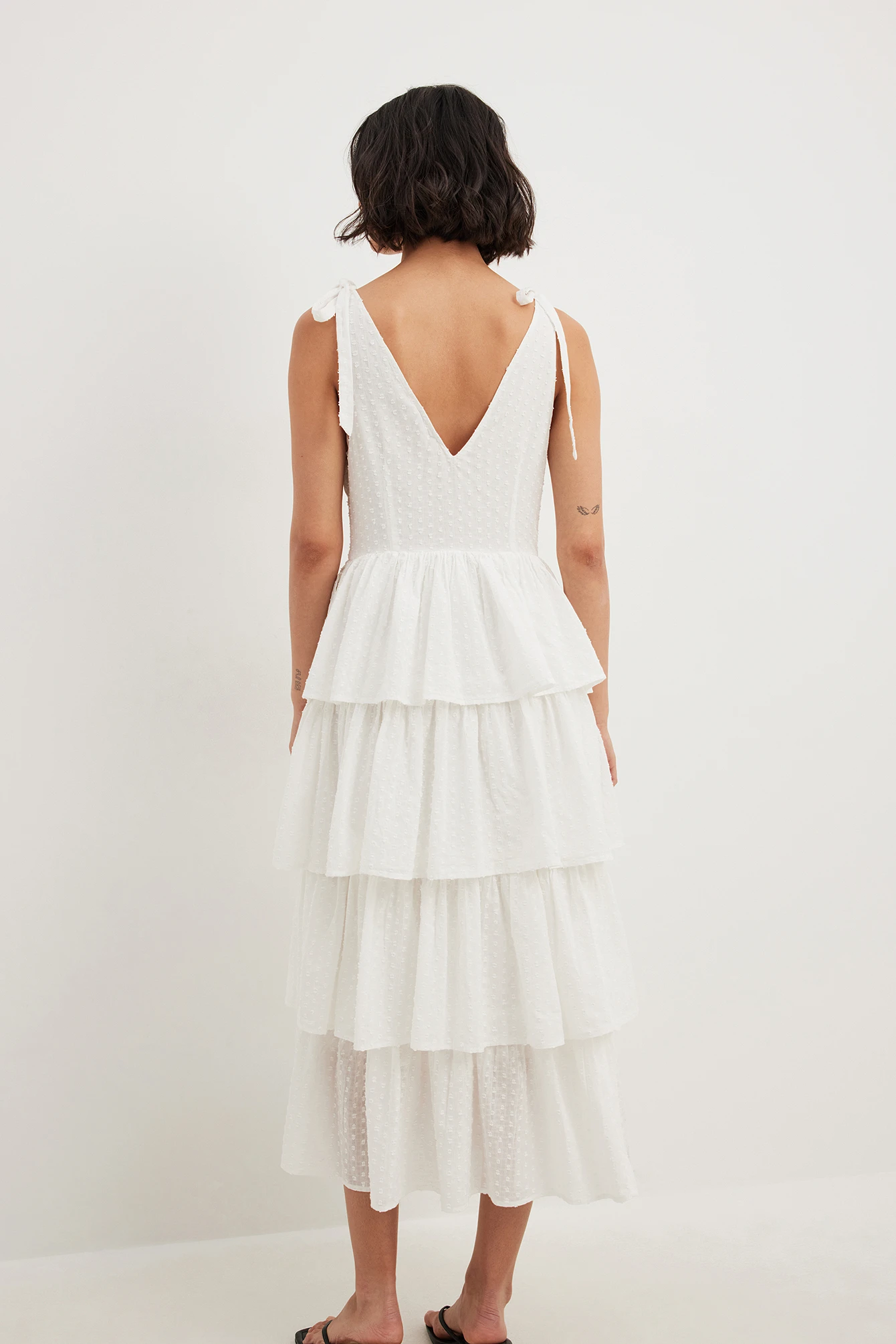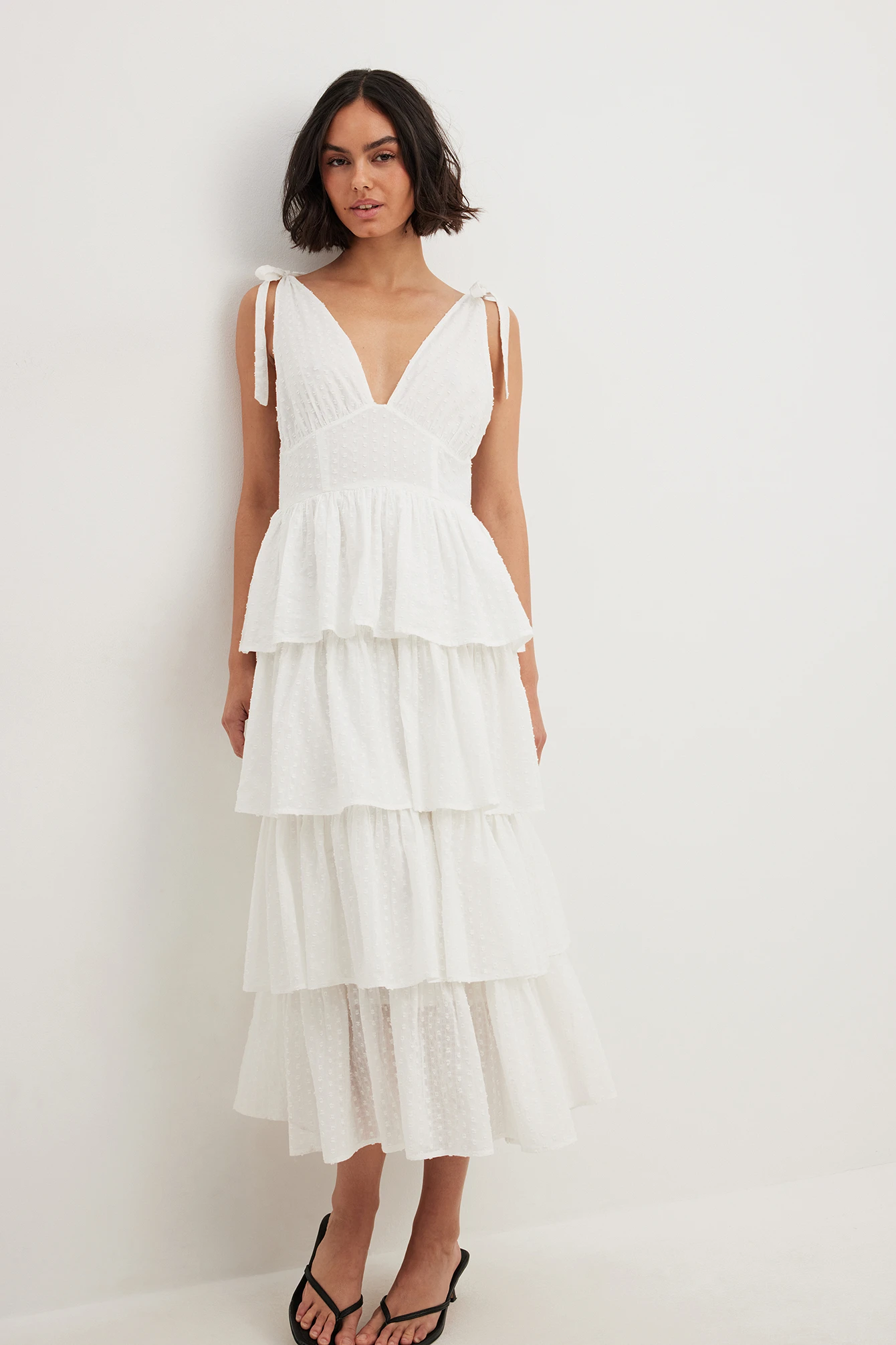 This midi dress features a textured material. It has self-tie shoulder straps and a plunge neckline. This midi dress features ruffle layers and a side zipper closure.