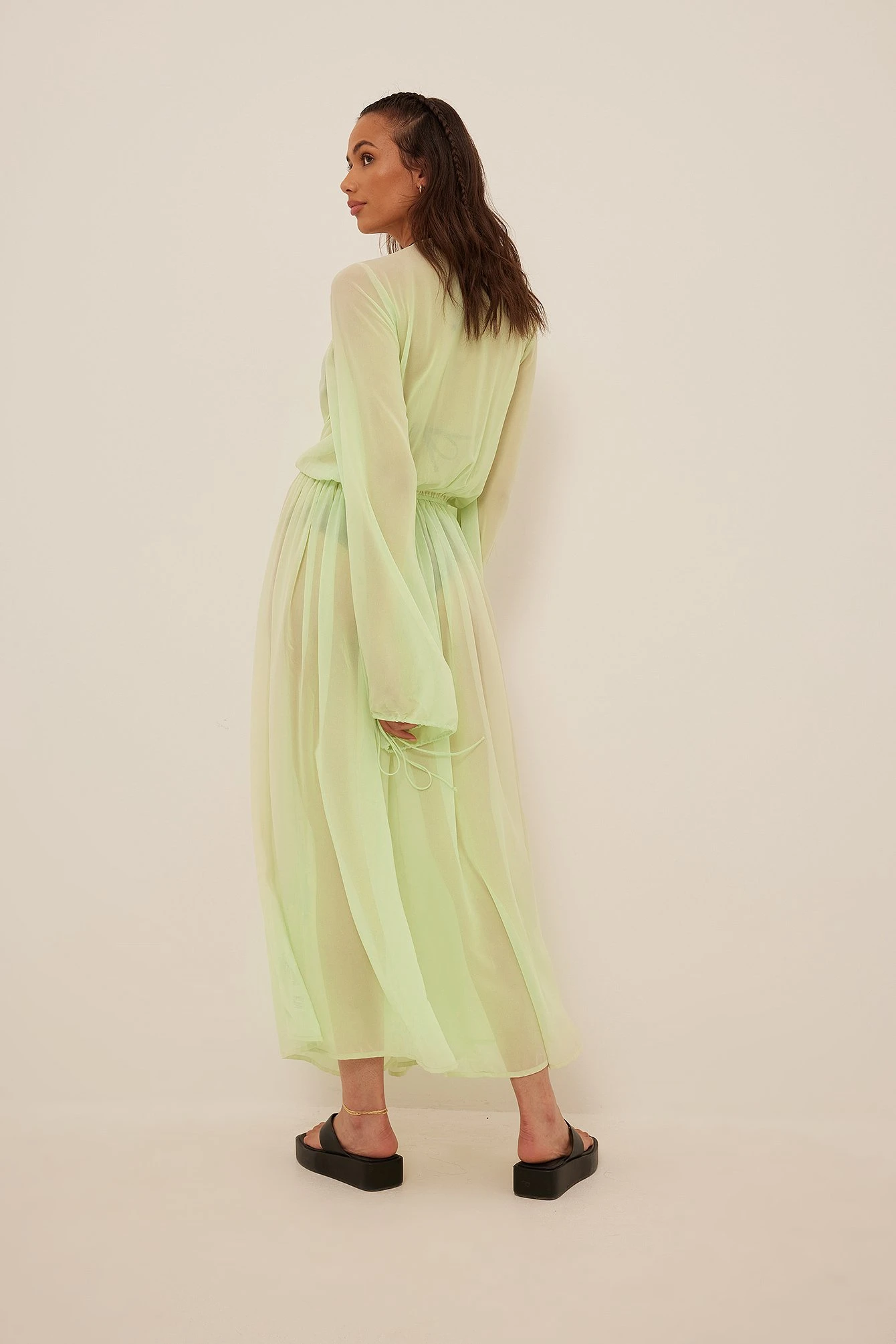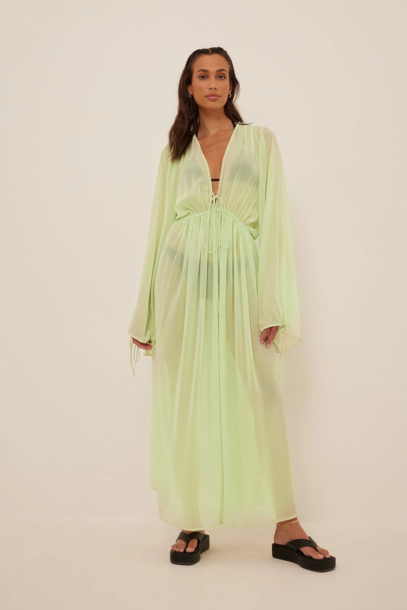 This caftan is perfect for the beach and seethrough and features a deep v neckline, long balloon sleeves with a gathered seam at the cuffs and a self tie knot waist.