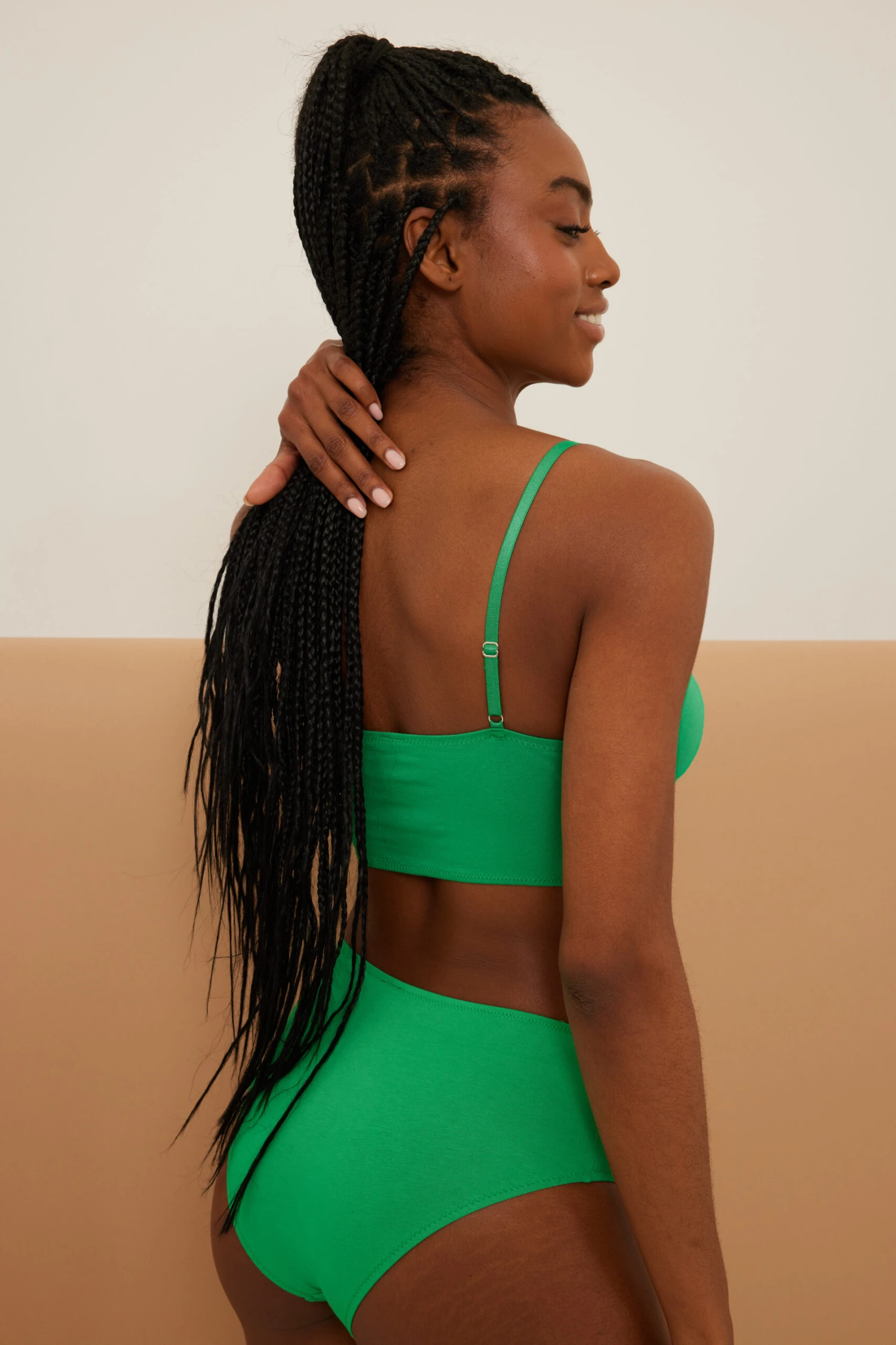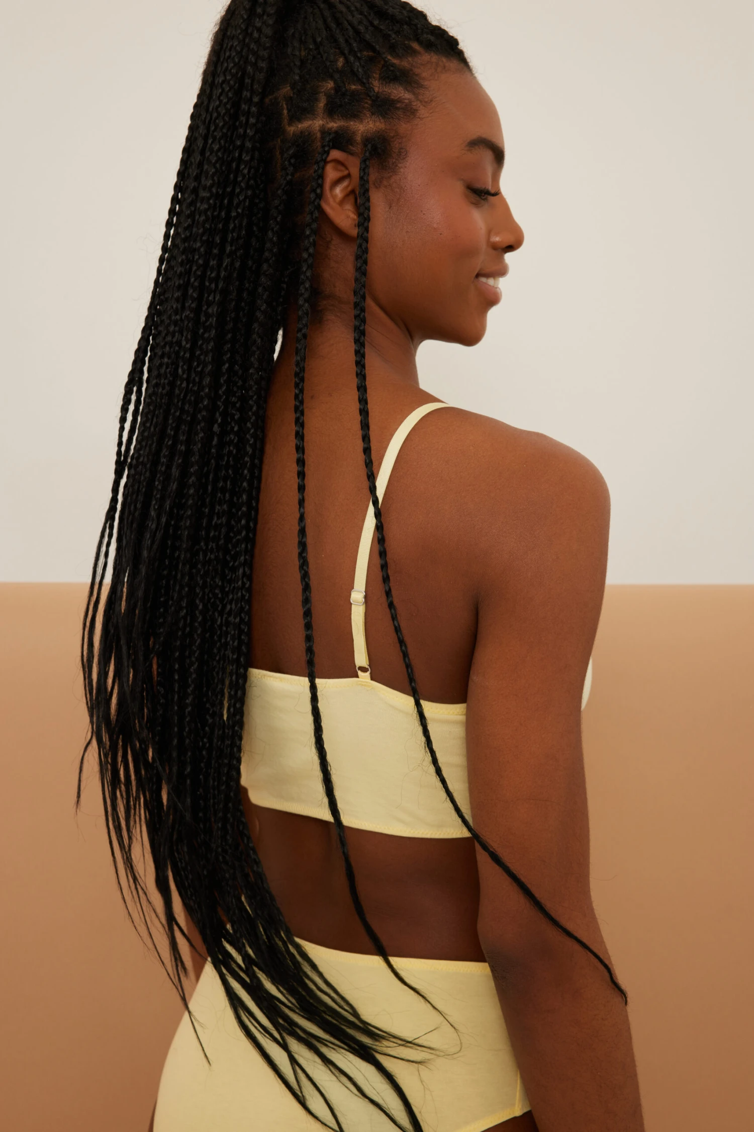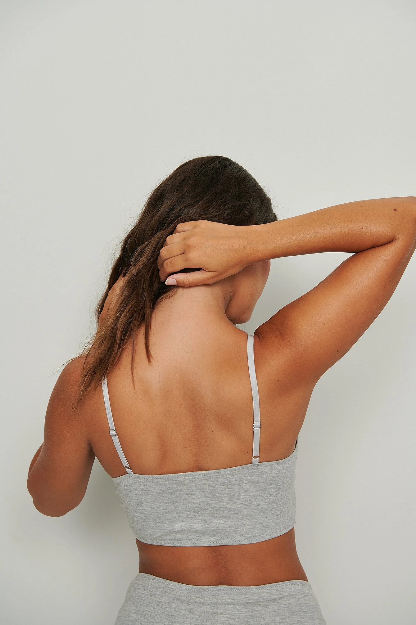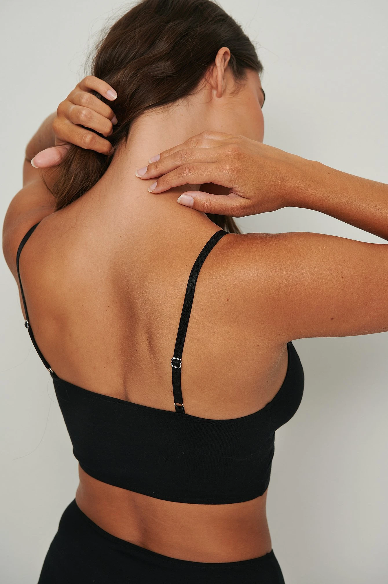 This bralette is elasticized and features triangle cups, an adjustable shoulder strap and a bandeau design.