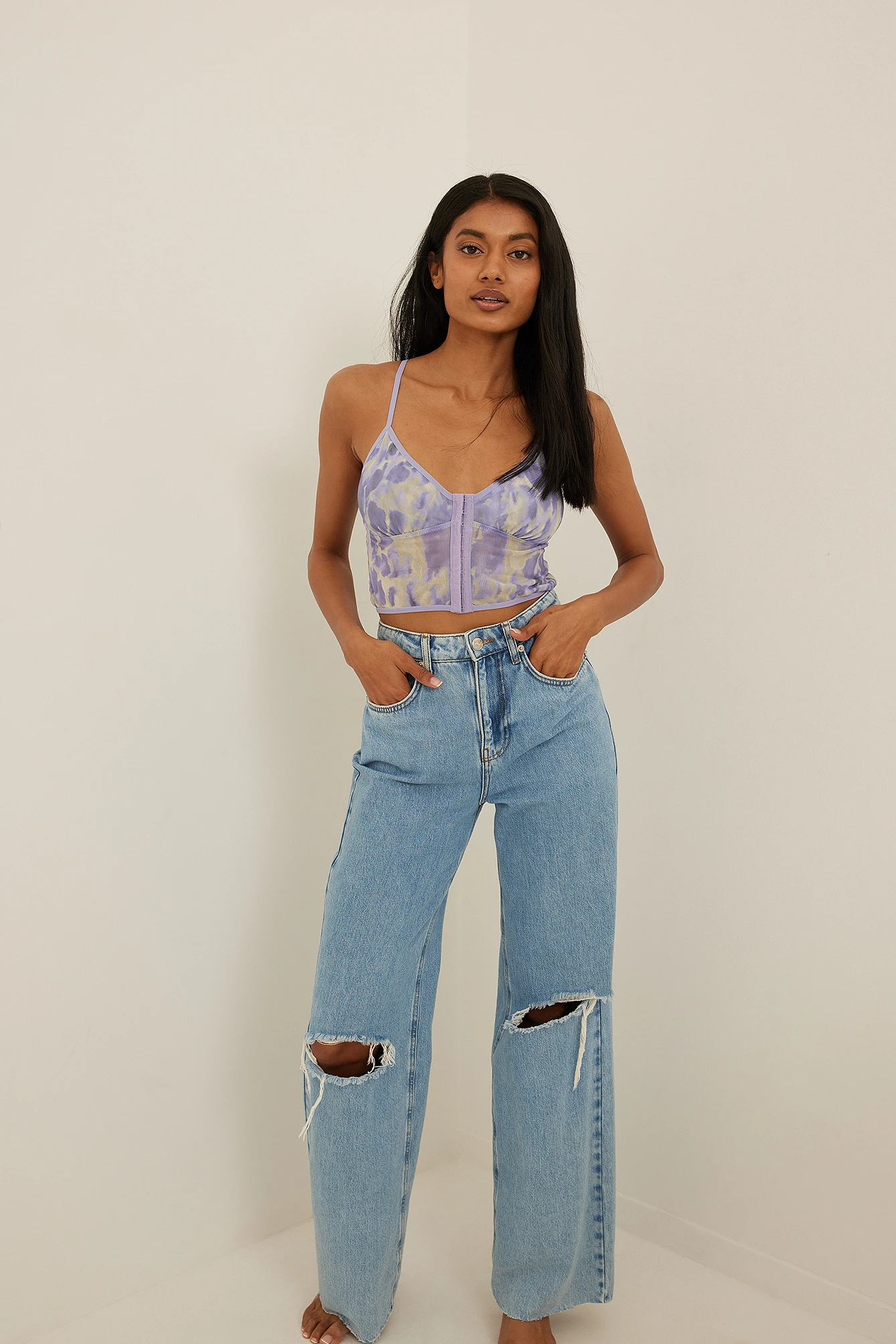 This corset is made of mesh and features a bralette design, adjustable shoulder straps, triangle shaped, unpadded, seethrough cups and a hook closure down the front.