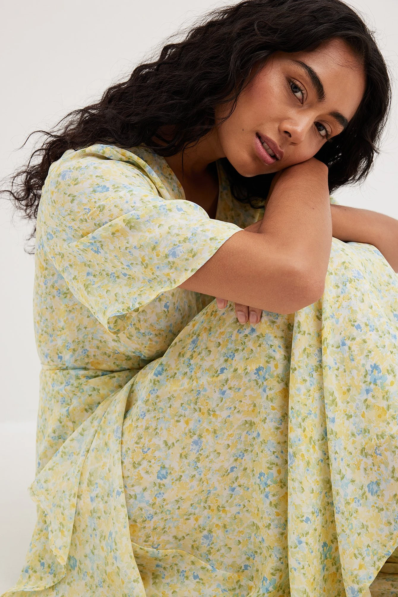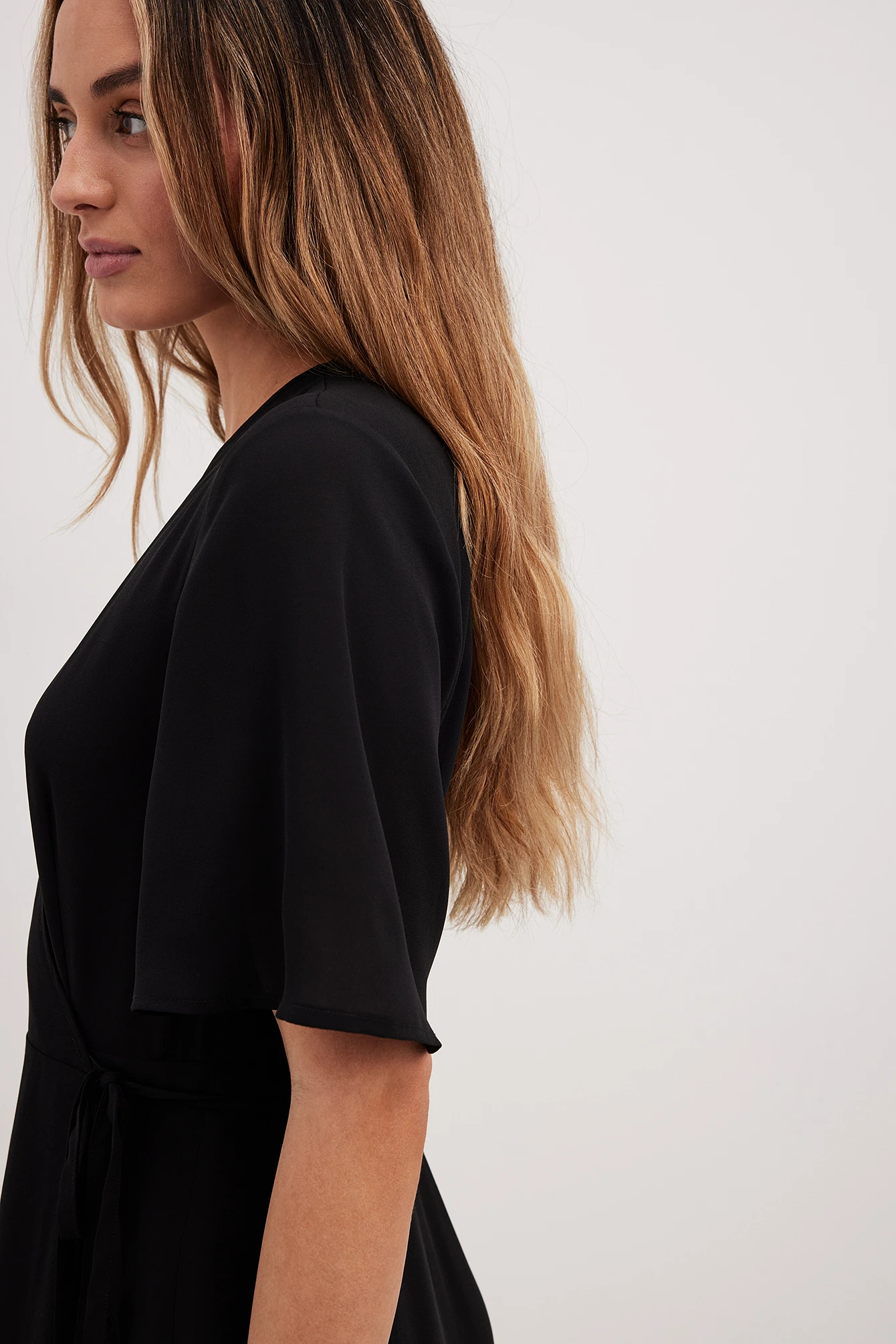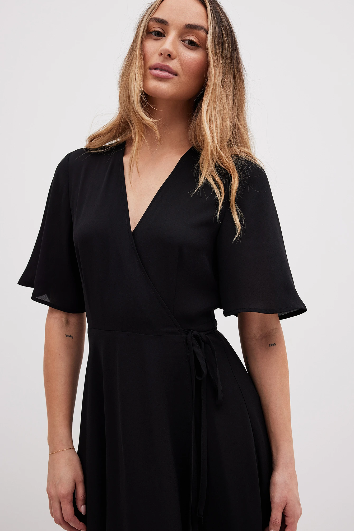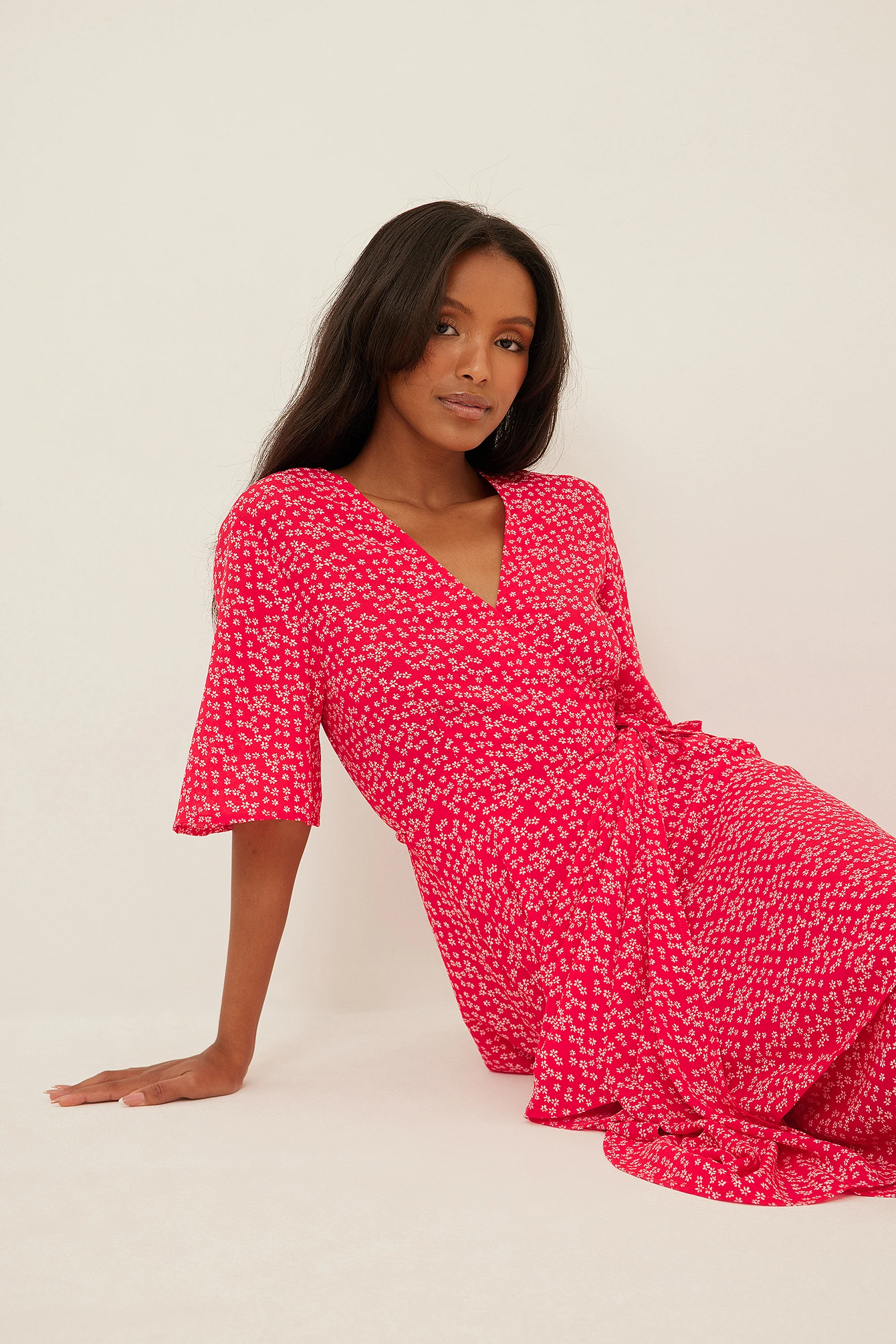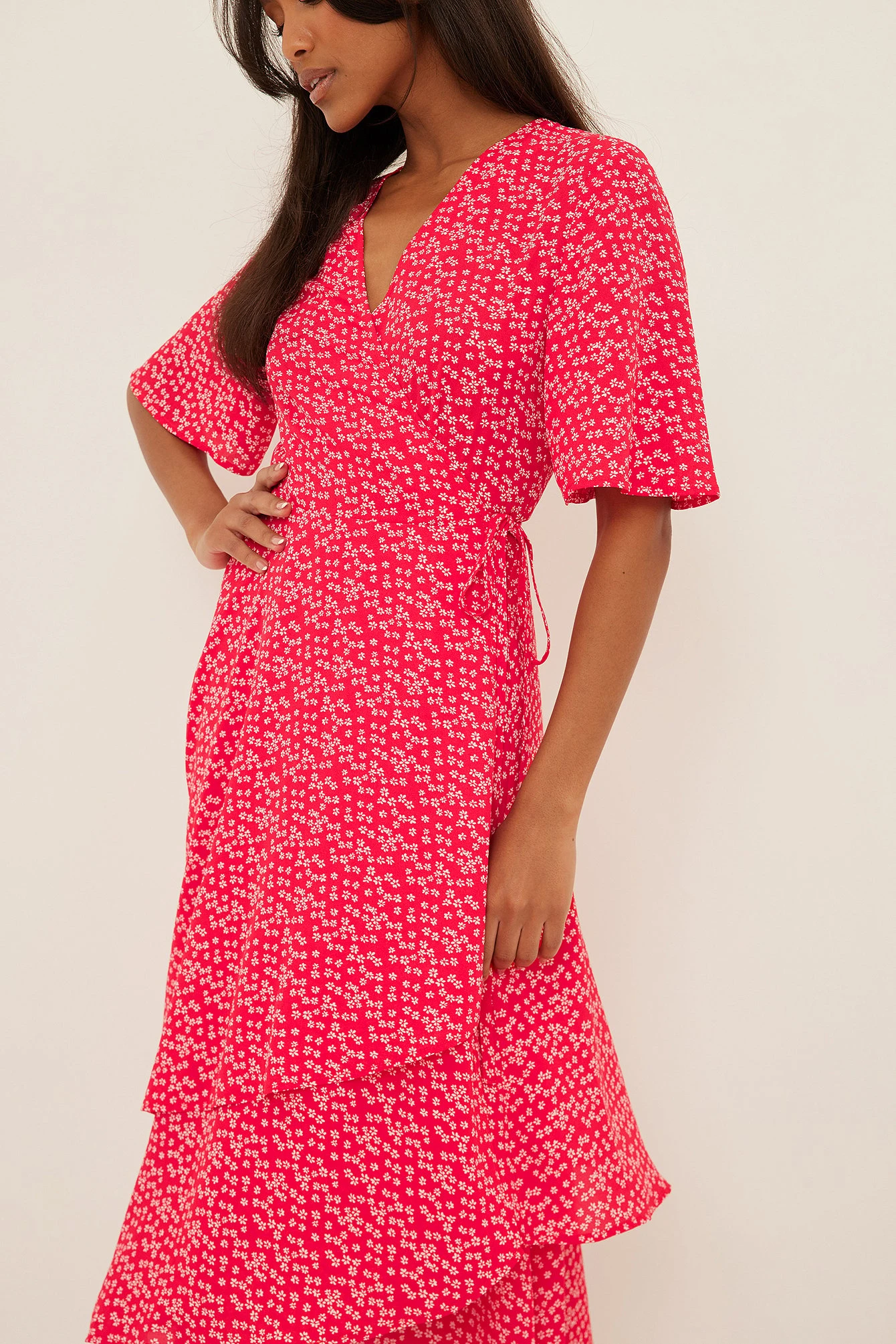 This wrap dress features short sleeves. It has wrapped straps around the waist with a self-tie knot and double layers at the bottom half. This wrap dress features a relaxed flowy fit and a light material in chiffon.