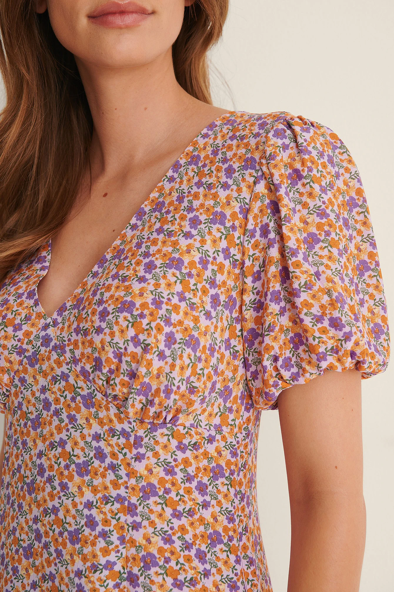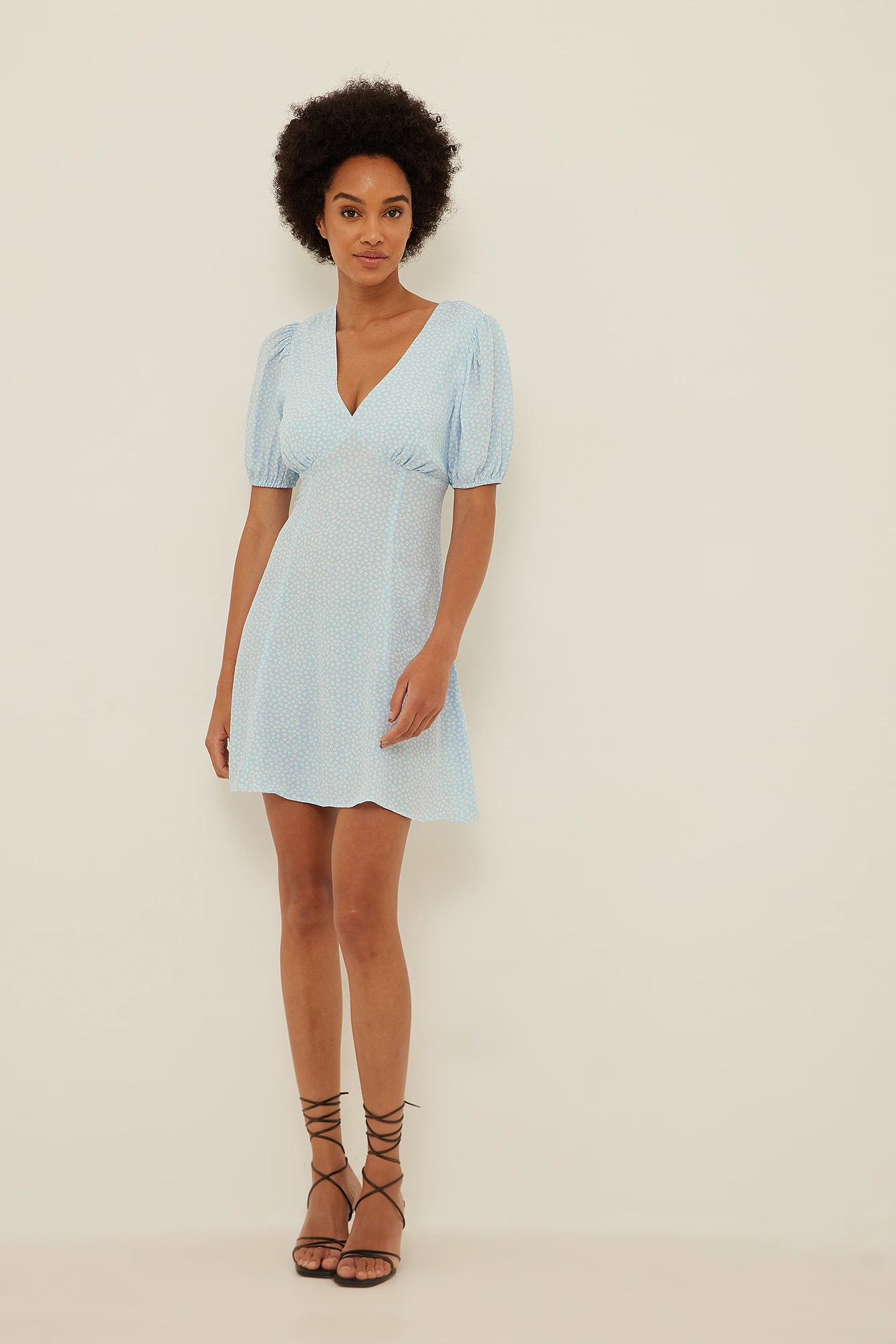 This mini dress features a v neckline, puff sleeves with an elasticated band, a gathered seam on the chest, a side zipper and a flowy fit.