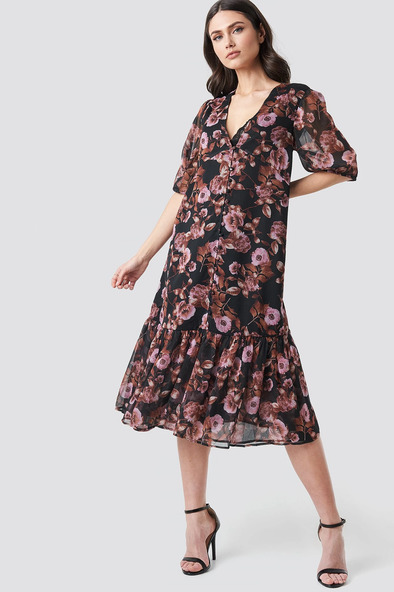 This dress by NA-KD Boho features a v-neck cut, half puff sleeves, a button closure down the front, a midi length and a flowy fit.