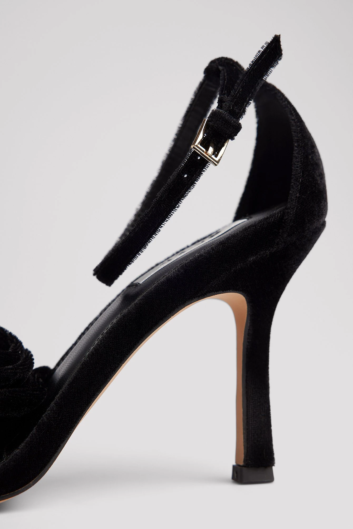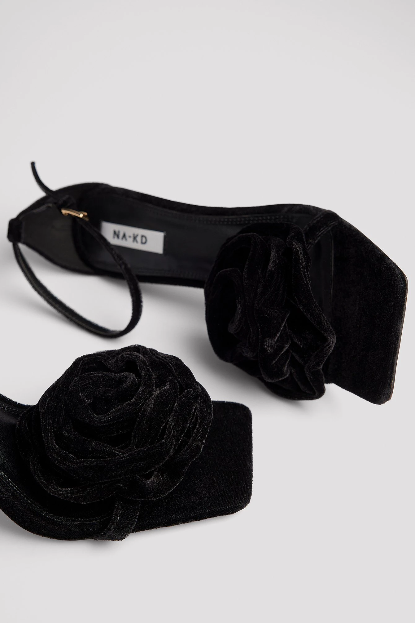 These heels are velvety and feature an attached rose on the front. They have a square toe and a strappy sandal. Measurements in size 39: Heel height: 10 cm / 3.9 in. Insole length: 25 cm / 9.9 in.