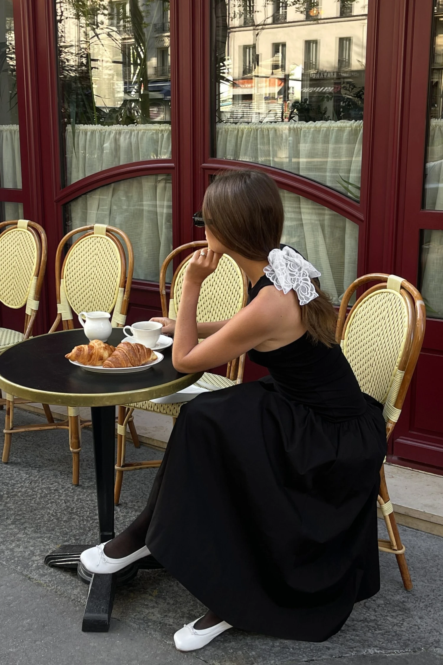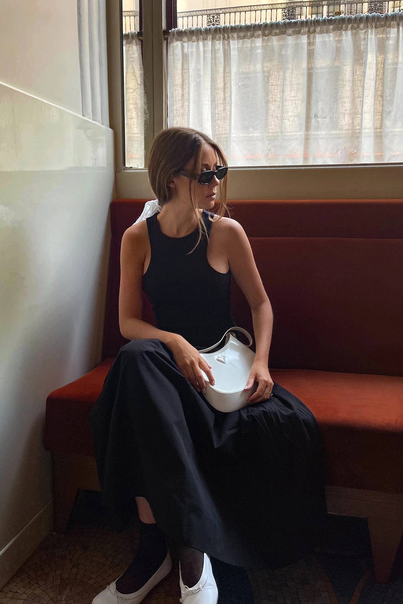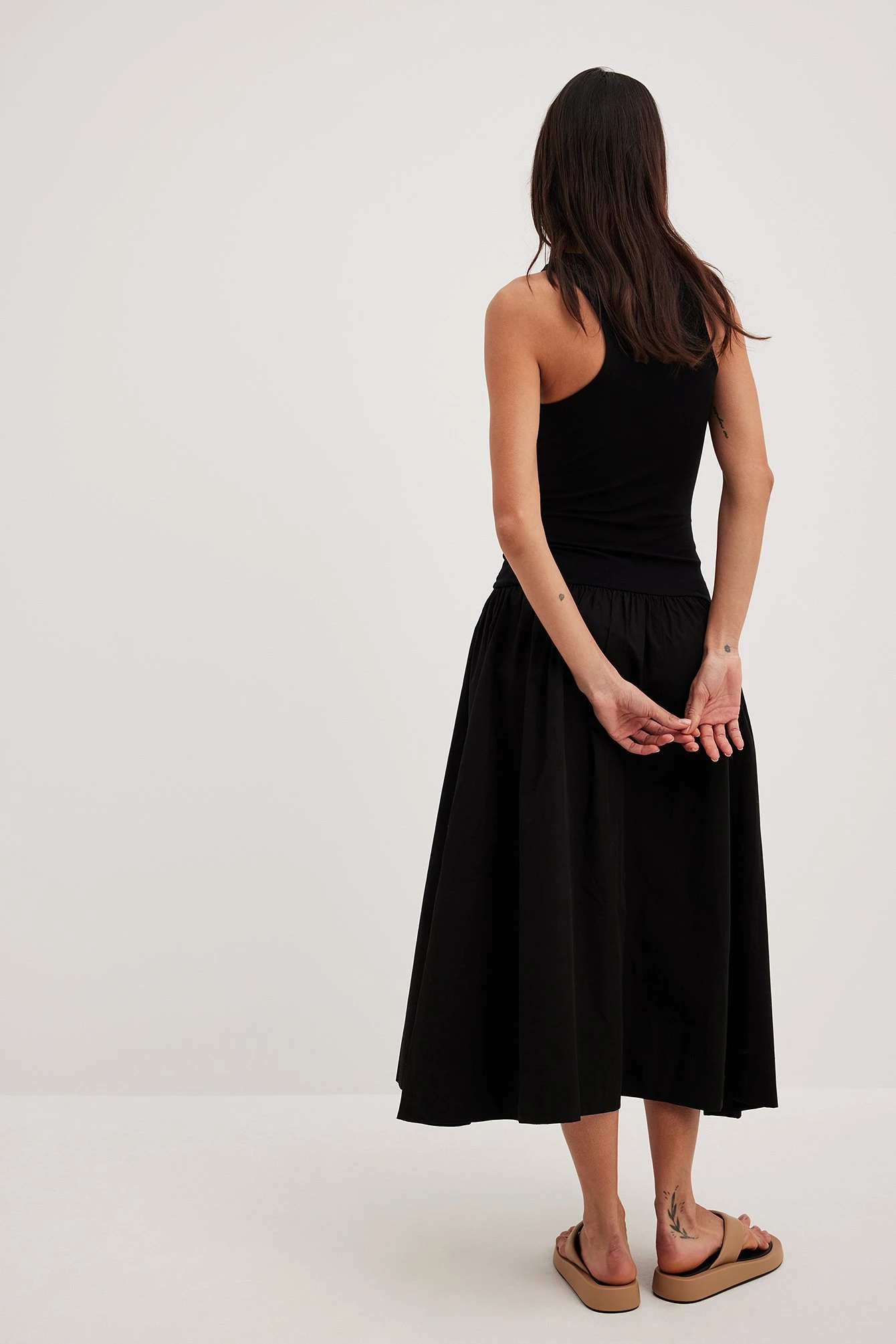 This dress is stretchy and features a sleeveless design. It has a soft touch at the top and a flowy fit on the hips with a gathered seam around the thighs.