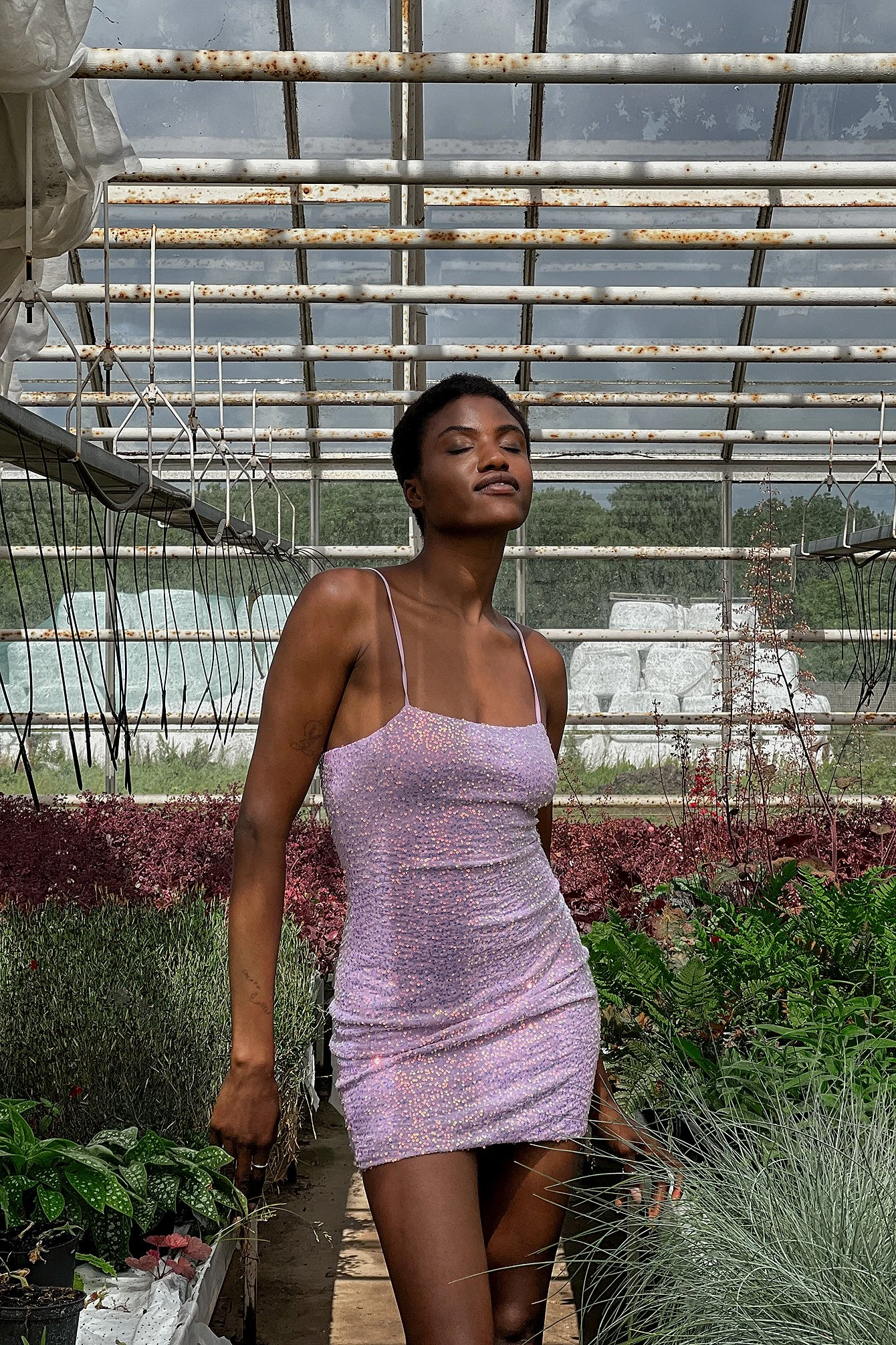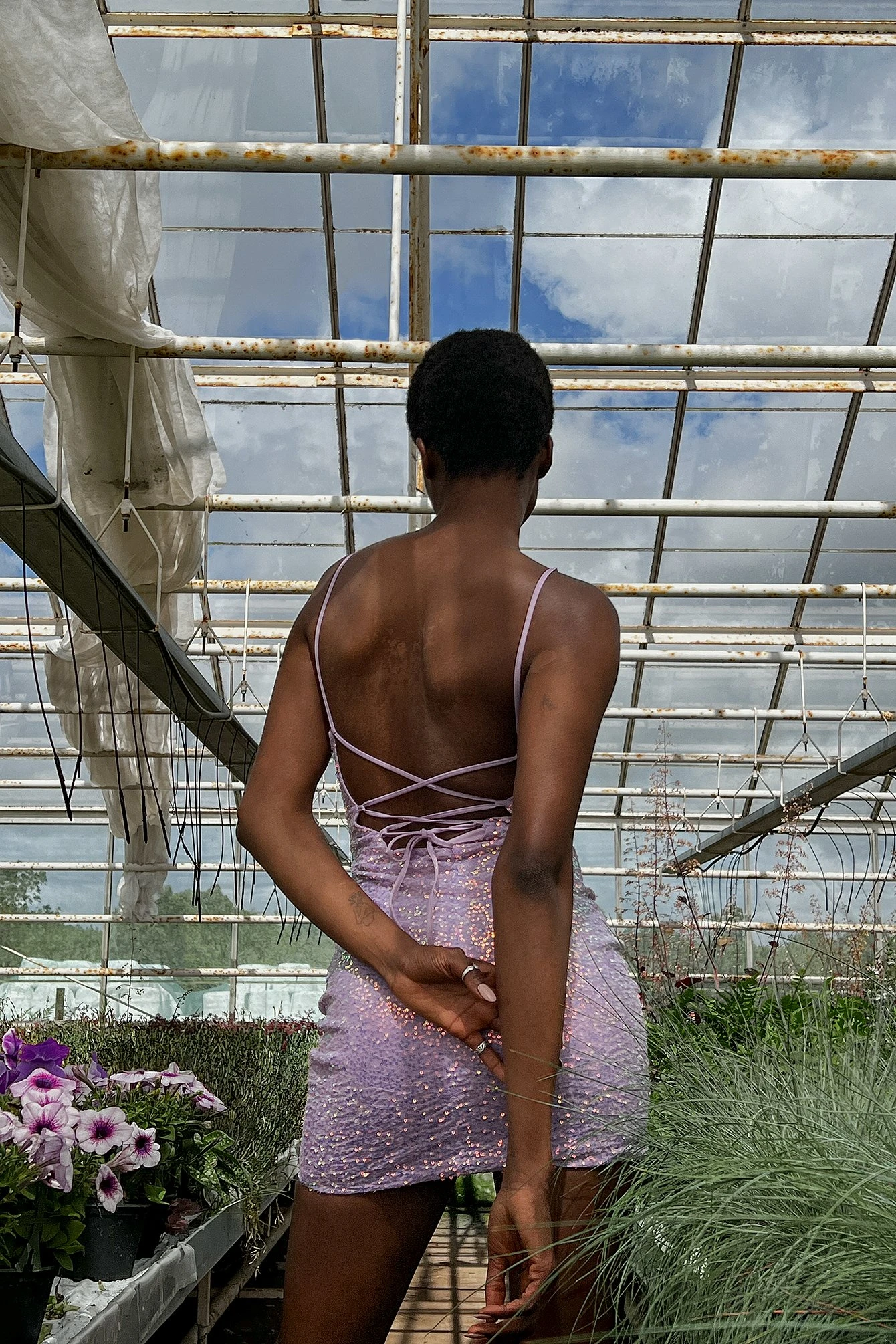 This mini dress is sparkling and made of sequin and features a waterfall neckline and an open back design with a self tie detail.