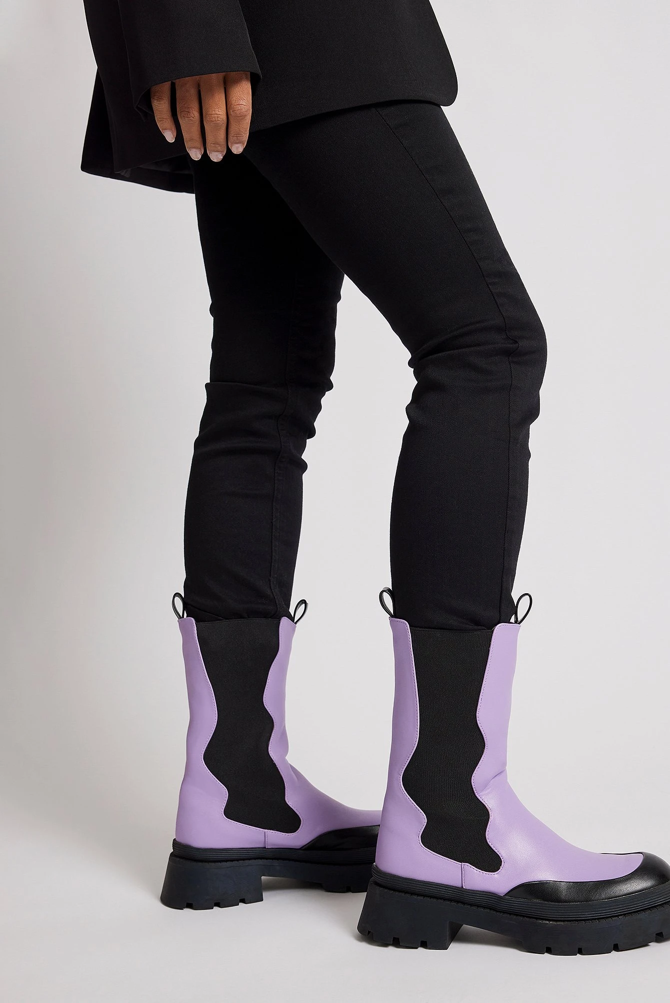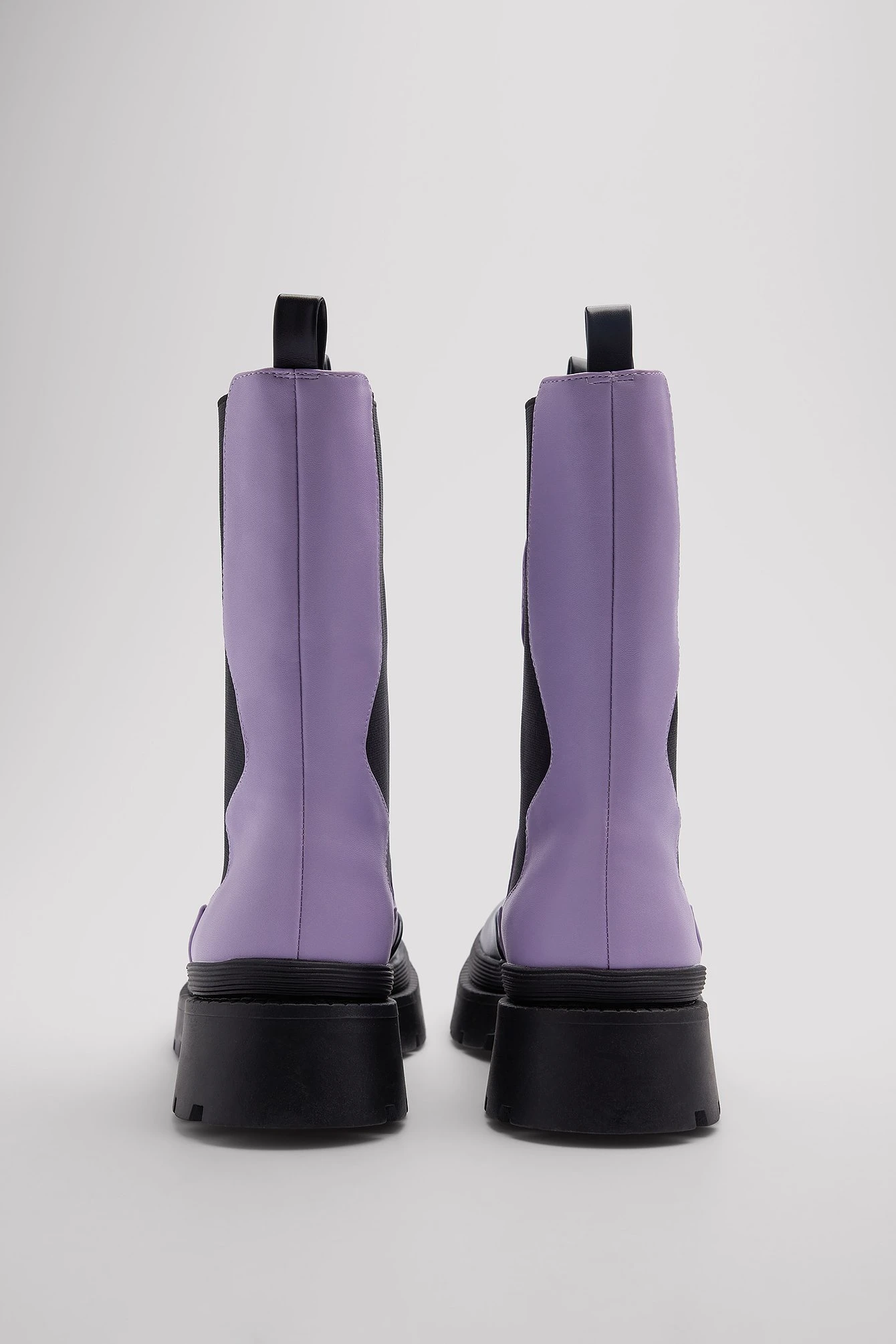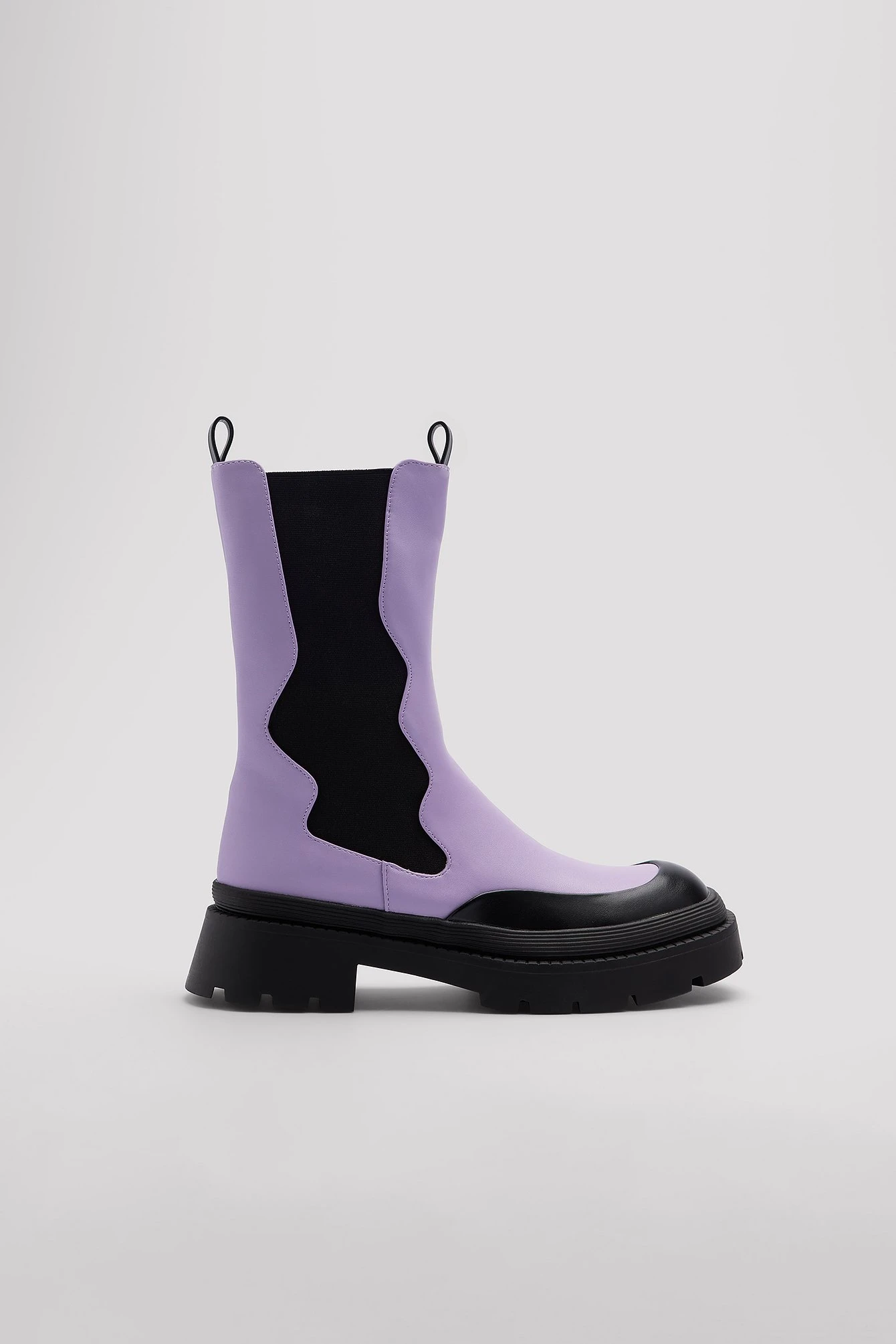 These boots feature a rounded toe, a chunky rubber sole and a calf high shaft with elastic, wavy details. Measurements in size : Sole height: 2,5 cm / 1 in. Shaft height: 23 cm / 9 in. Shaft circumference around the calf: 28,5 cm / 11.2 in.